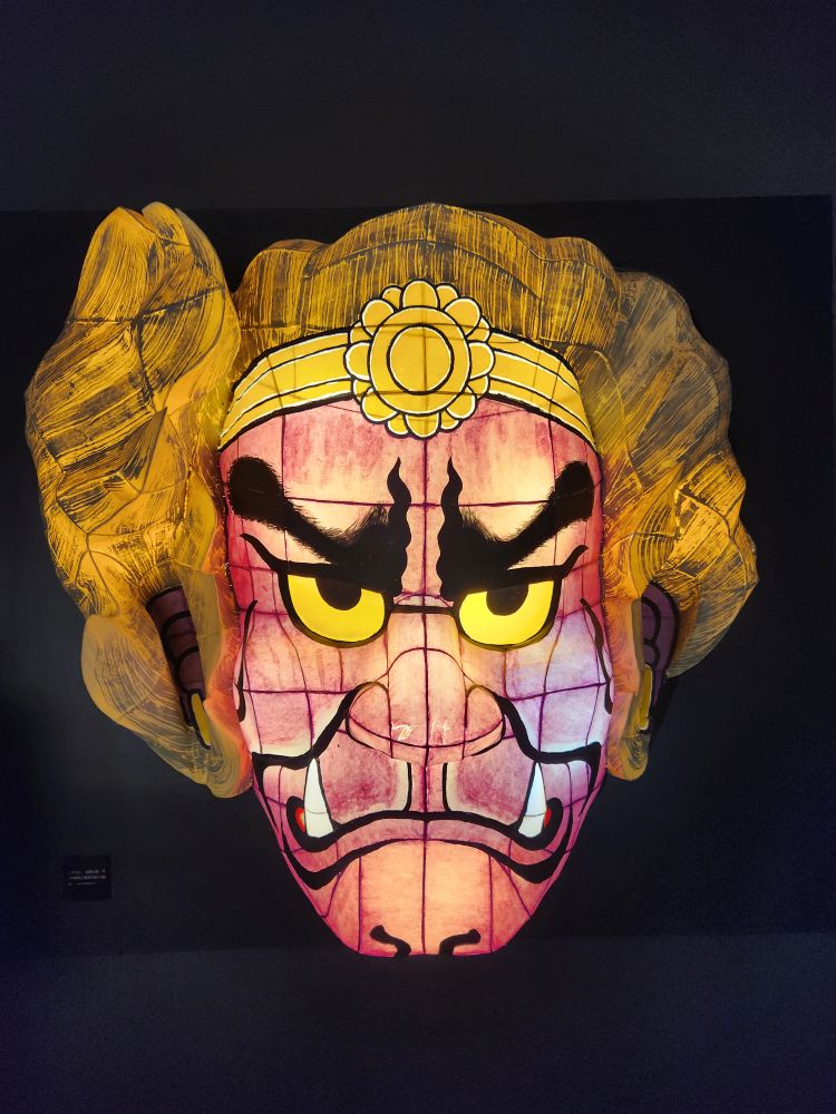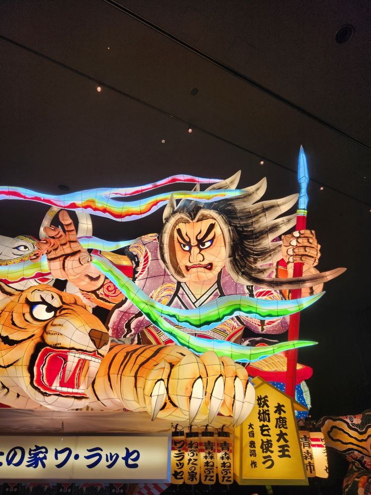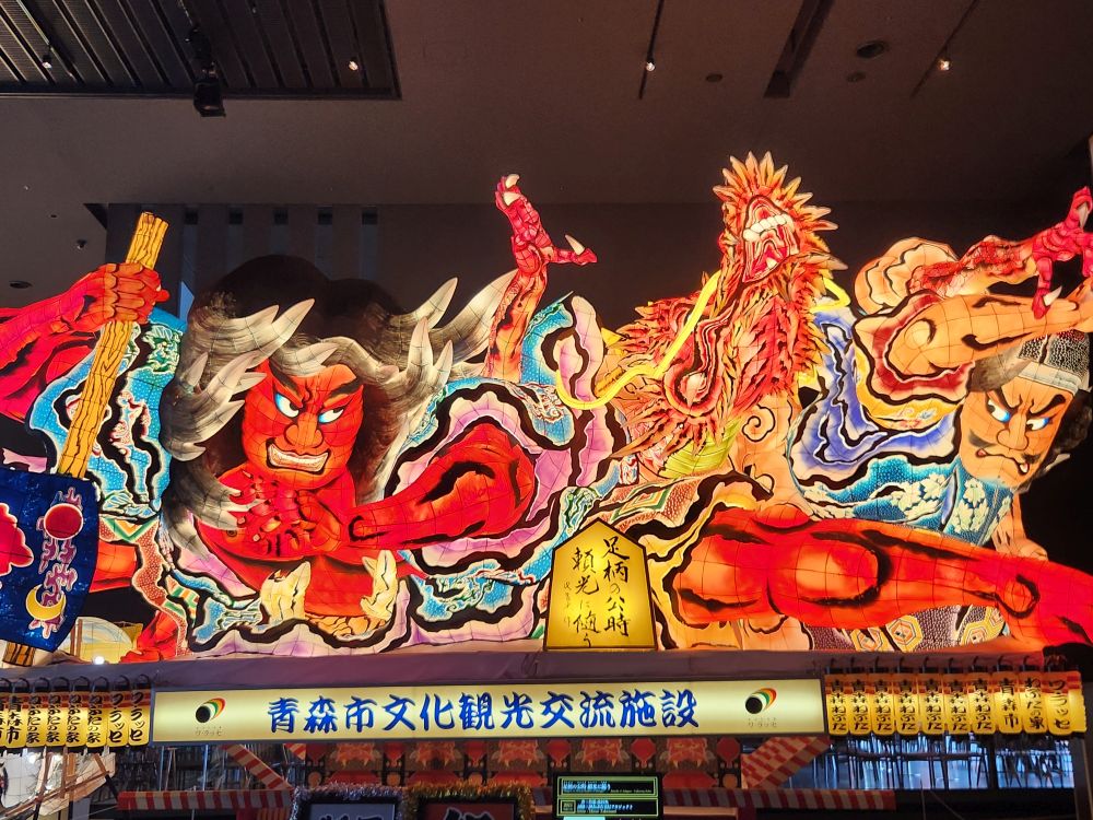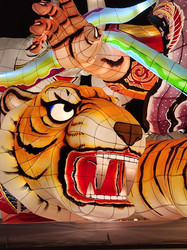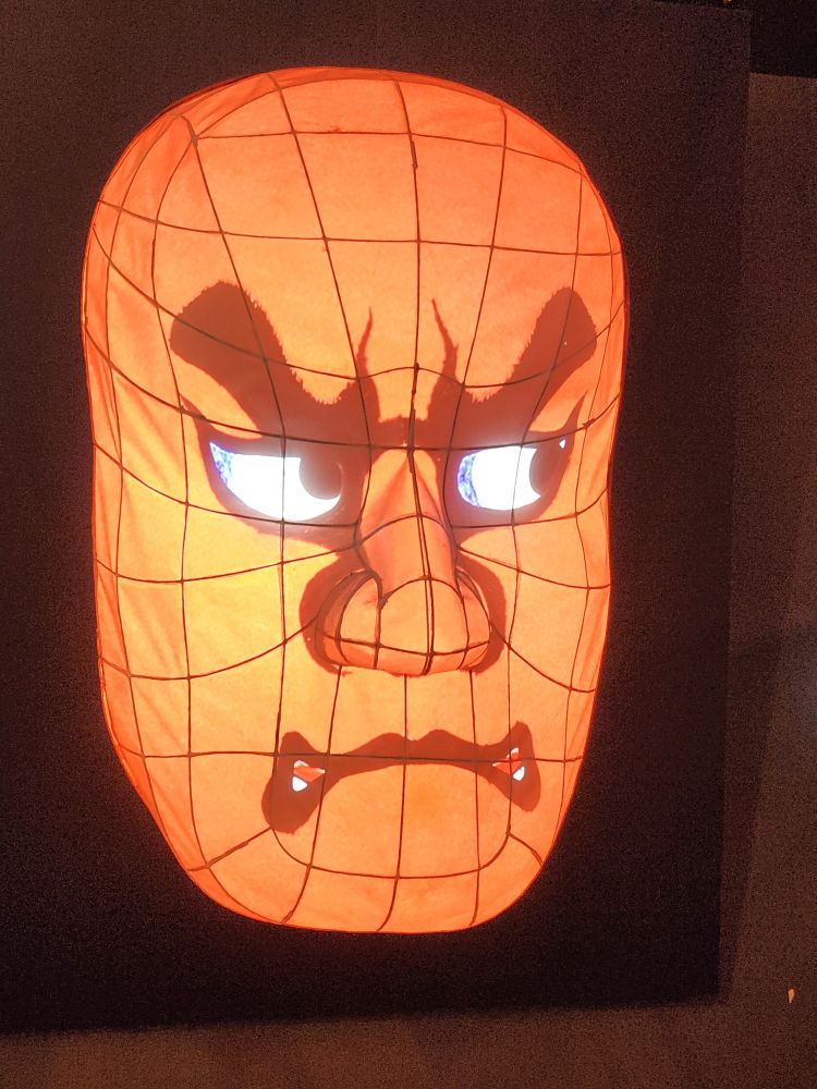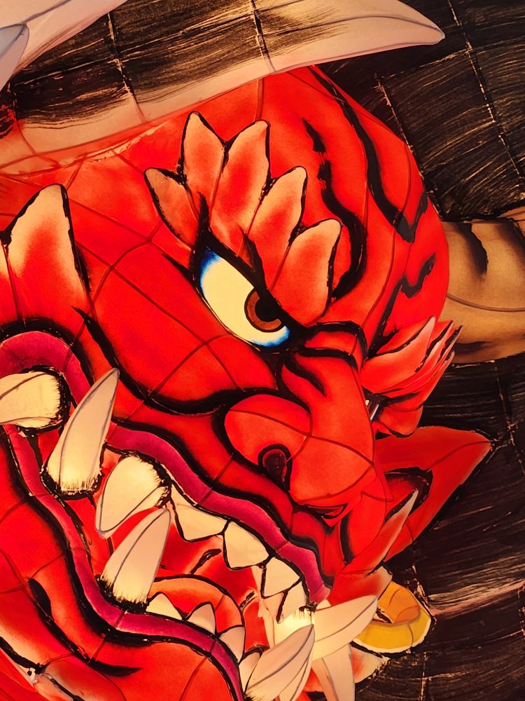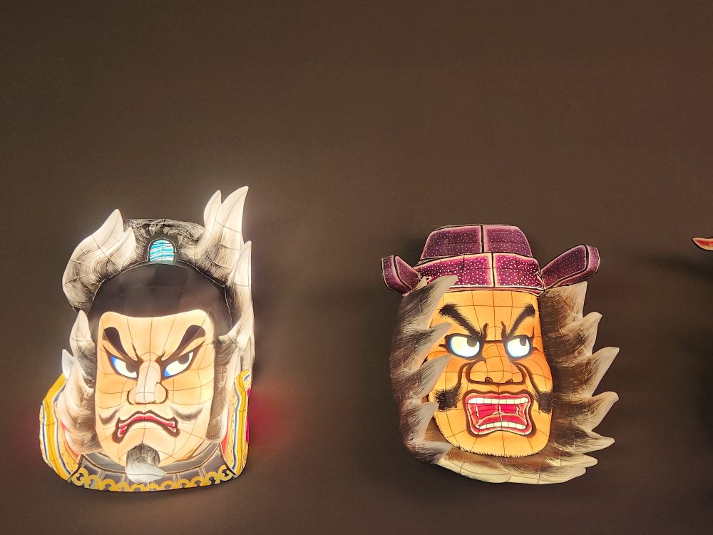 The hallway opens up onto a viewing platform that has a video about 3 Nebuta masters – Kitagawa, Sato and Shikanai – as well as a mask made by each artist. The masks themselves are about 100 years old and made with hemp for the eyebrows and beards. It is also from this platform where we can see our first real float from above. It is a great vantage point to see just how large and detailed these astonishing floats really are, measuring 30 feet wide by 23 feet deep by 16 feet high and weighing in at 4 tons including 800 lights and a power generator. Humongous!
