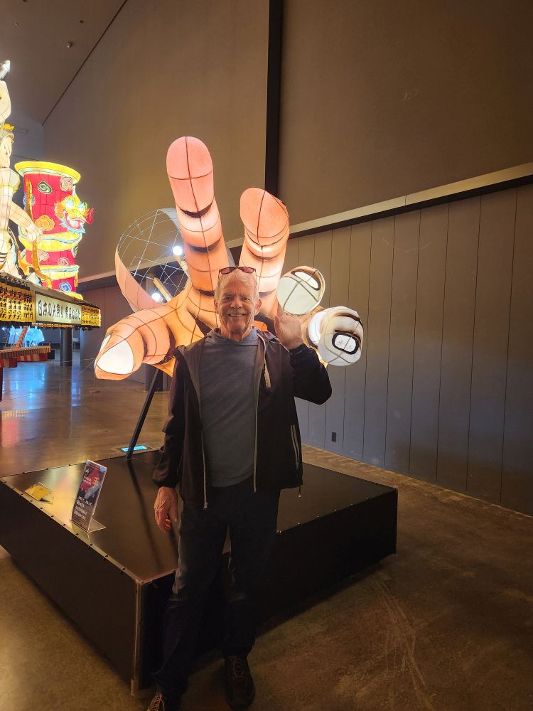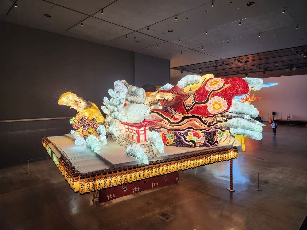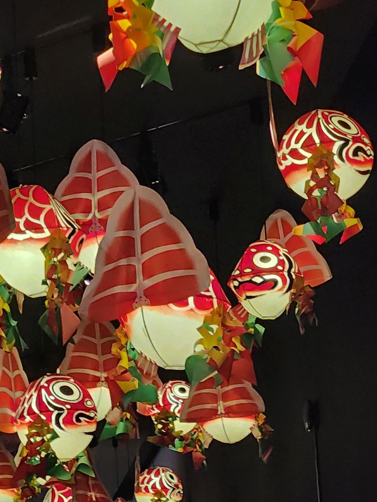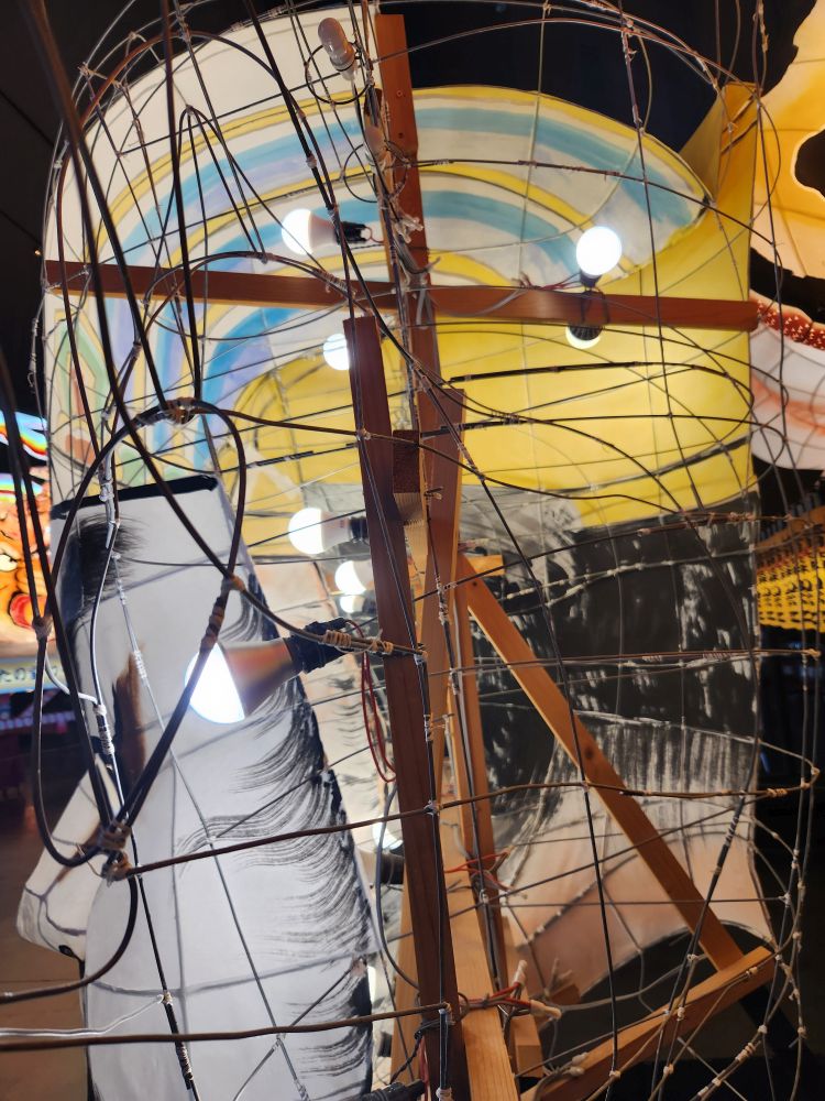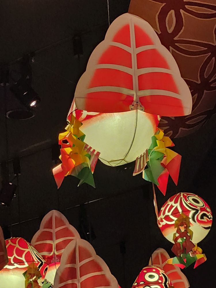 This historical area has lanterns strung about the ceiling and on the floor, plus a wonderful timeline of different floats used through the years. The photos also allow us to really examine these huge floats. Where we thought they floats were mounted on trucks and driven through the streets – but upon close inspection, we realize that the floats are all human powered! Dozens of people are underneath the float, pushing it down the street on it’s two wheels. Totally amazing!