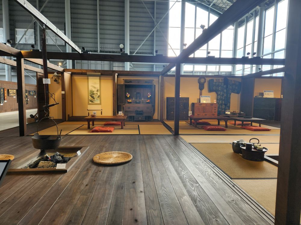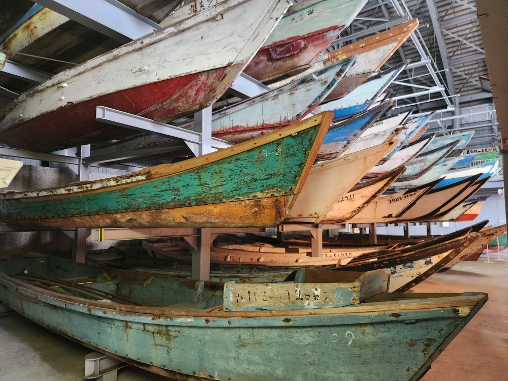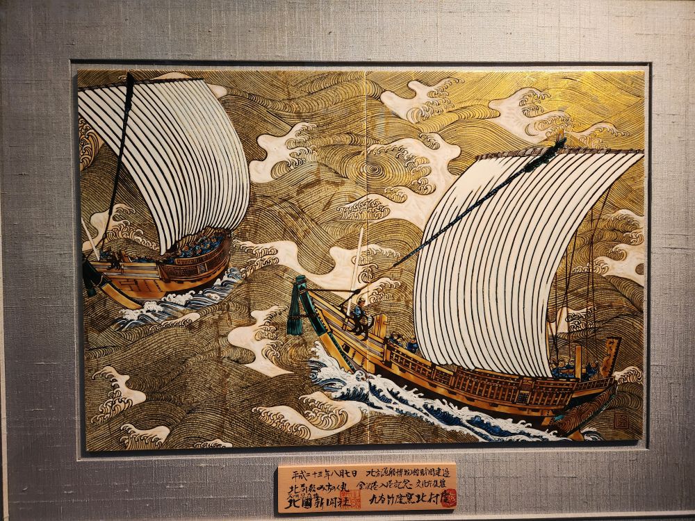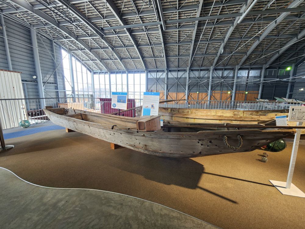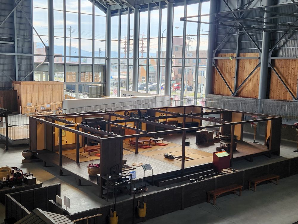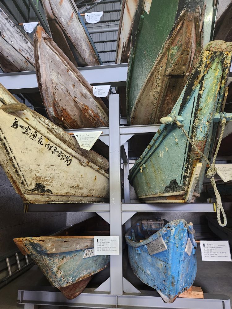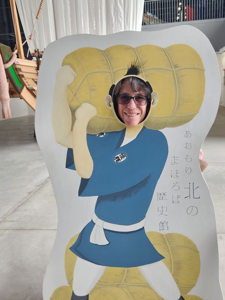It is starting to get crowded now, and a very good time to boogie on to our next destination – the Aomori Museum of History. On the way though, we make a stop at the train station and buy a couple of SUICA cards, the only way to get around Japan’s metro and bus system. We had to buy the regular cards which comes with a 500 Yen deposit, but we’ll get that back in the end when we turn in the cards. Worth it to have the electronic tap in and out of stations! Then it is a trek to the other end of town for the museum. It is a nice enough day, so the walk isn’t all that bad through a nice little park and along a canal. The museum itself is located in this huge hangar looking building in what seems to be an industrial section on the water. Totally eclectic – the museum covers the fishing history that developed Aomori, as well as dan entire house laid out with explanations of all the tatami rooms. There were tons of little fishing boats all stacked in racks, great artwork depicting fishing boats of old, of course a Nebuta mask (with a little history explanation that gave more detail than we found in the Nebuta museum – but that may have just been a translation thing!), a display about the Forestry Office which administered the entire Tsugaru lumber industry (it is now a museum that is our next stop), and some great old fishing boats with displays explaining how fisherman would use their feet on a “kurumagai” to move the boat while holding a “Hakomegane” with his mouth and a fishing tool with both hands. Totally weird!