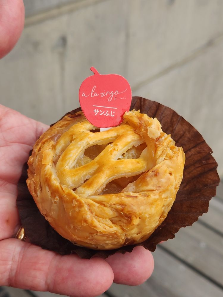 More meandering commenced, when we suddenly realized we could get back to the Nebuta museum for the demonstration of the music and dancing during the festival. We didn’t think we would be able to make the 1:10 start but we literally walked in right as they were starting. There was a ship’s tour there (of course) so it was a bit crowded and there wasn’t really much of an actual demonstration. They beat the drums a couple times and explained how to use all the instruments. Then they asked everyone to form lines and try the drums and symbols out for themselves. Eh. Hokey. So, we left and h-Factory which was an overpriced tourist shop filled with all sorts of expensive Aomori souvenirs. We passed on everything except for dessert: A great little apple turnover pie that was expensive as well, but since Hokkaido is known for its apples, we couldn’t not try something apple related!