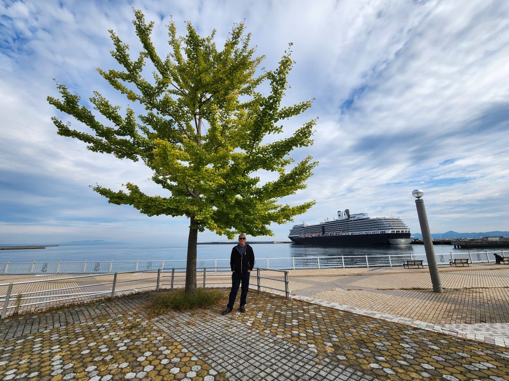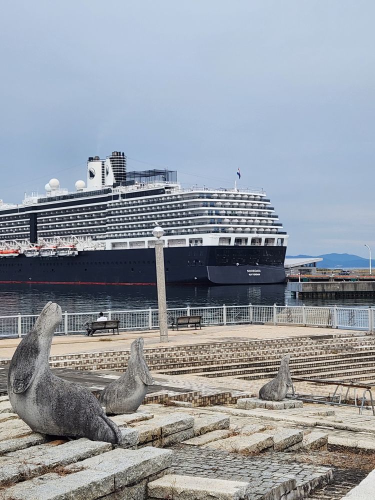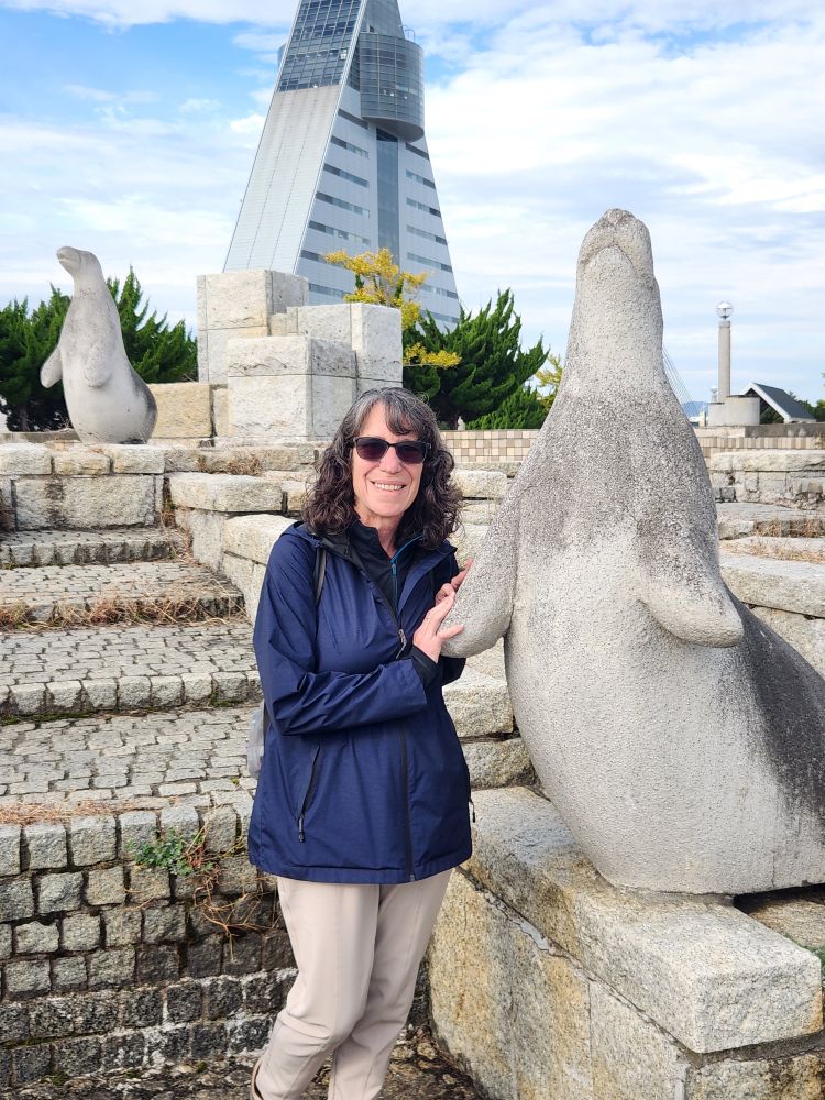Then it was back to the ship with a pit stop at the APSAM building where we broke down and bought a cool t-shirt for Ed and a great little Nebuta fan for me. Ok, souvenirs done! We’re headed back to the ship, passing the sweet seal statues, and then finally getting the flash to work on the camera to take a picture in front of the Aomori welcome sign in the terminal – without the flash, there are no fireworks in the background (you can see the difference between my photo and the one with Ed). Pretty neat.