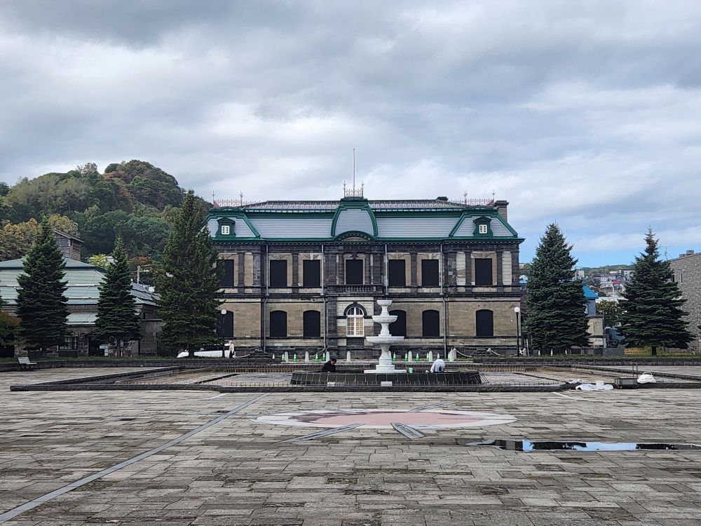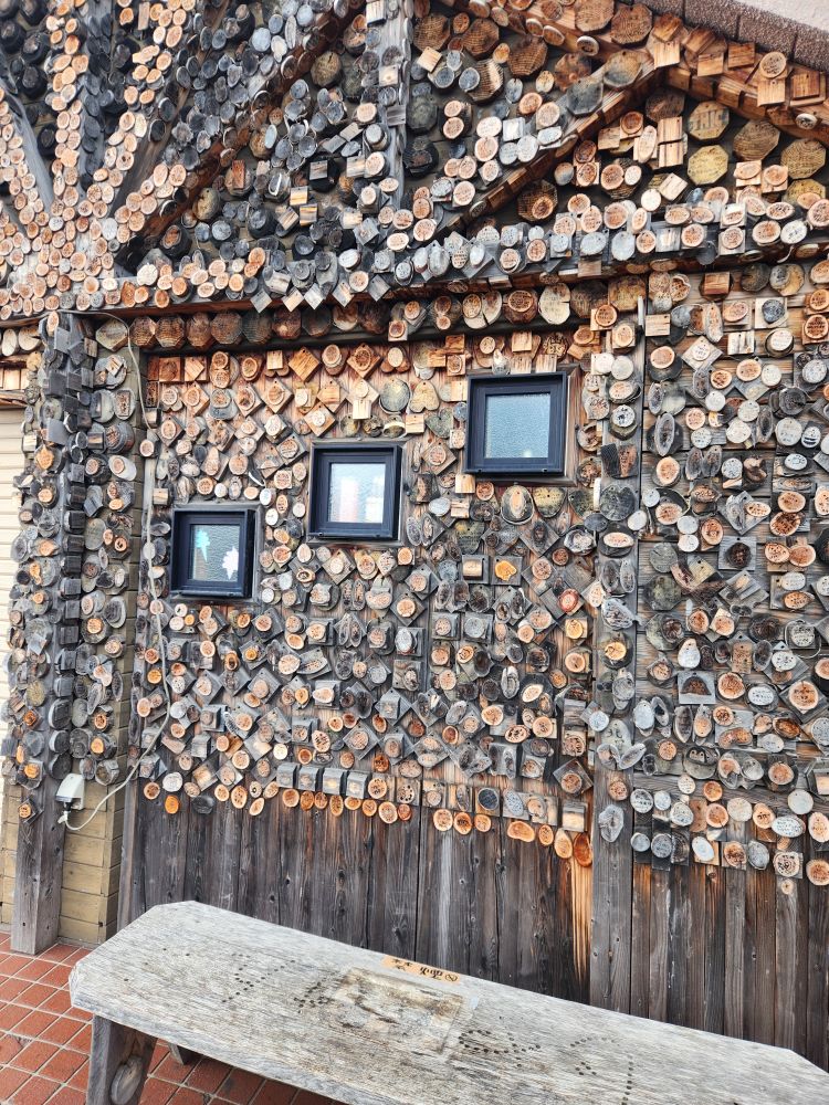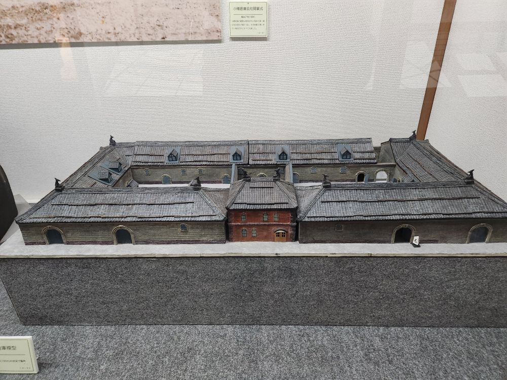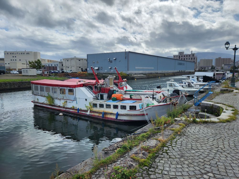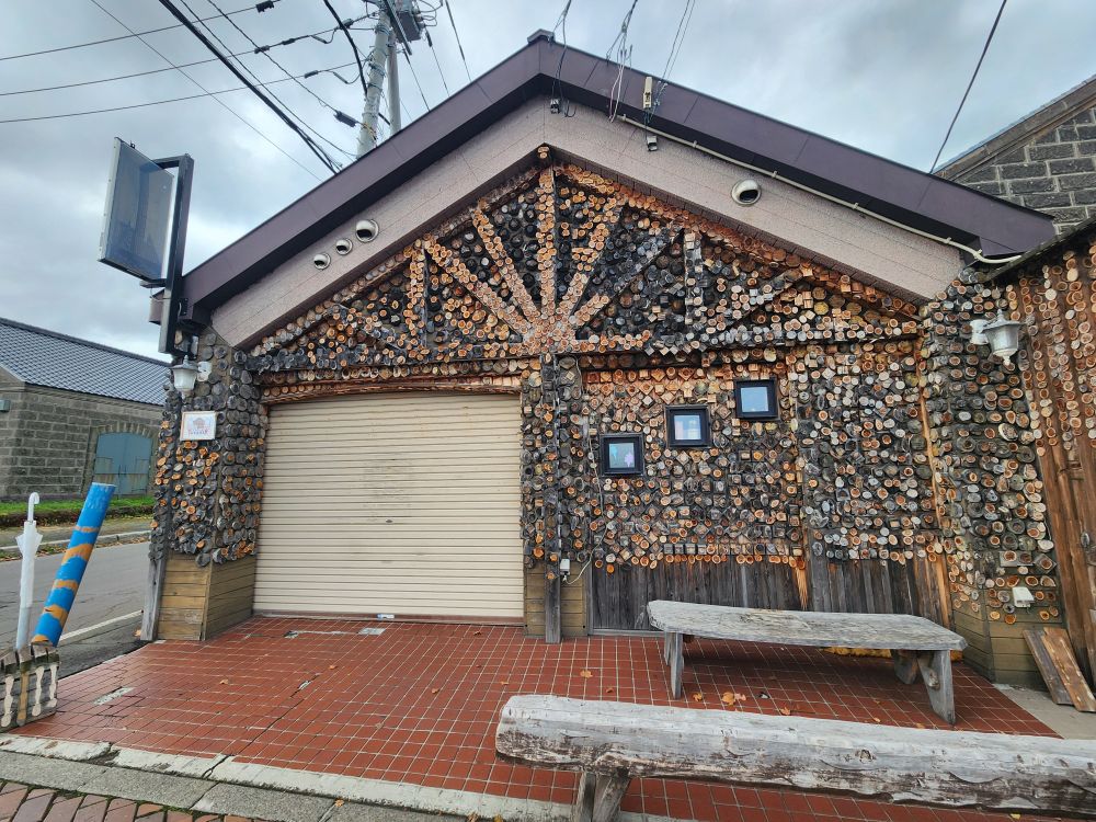 Shopping excursion done, we headed back into town proper for the history museum because you could buy a pass with the train museum. Walking past some great architecture – an ice cream shop that uses slices of trees as ornamentation on the outside walls, where people sign their names or draw little cartoons – totally different. Continuing on to walk alongside the 1 km long Otaru canal, originally constructed to be used as a waterway for barges to take goods from cargo ships moored in the harbor into town. When the new port facility was developed, the canals became superfluous and are now used as a tourist attraction offering canalboat rides up and down. We will follow the canal all the way into the main town, passing landmarks such as the building that housed one of the main importers in the time, the Nihon Yusen Company – looking more like a state house – past numerous boats, some made for transport, some just whimsical (and we think a bar in the later afternoons!) – and lots of great statues before reaching our History museum destination.