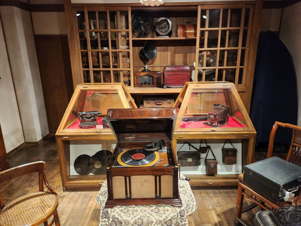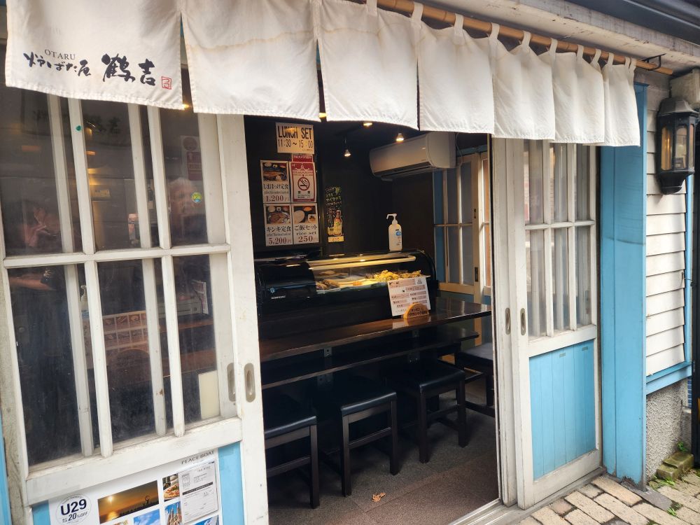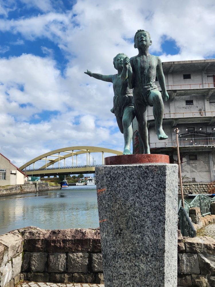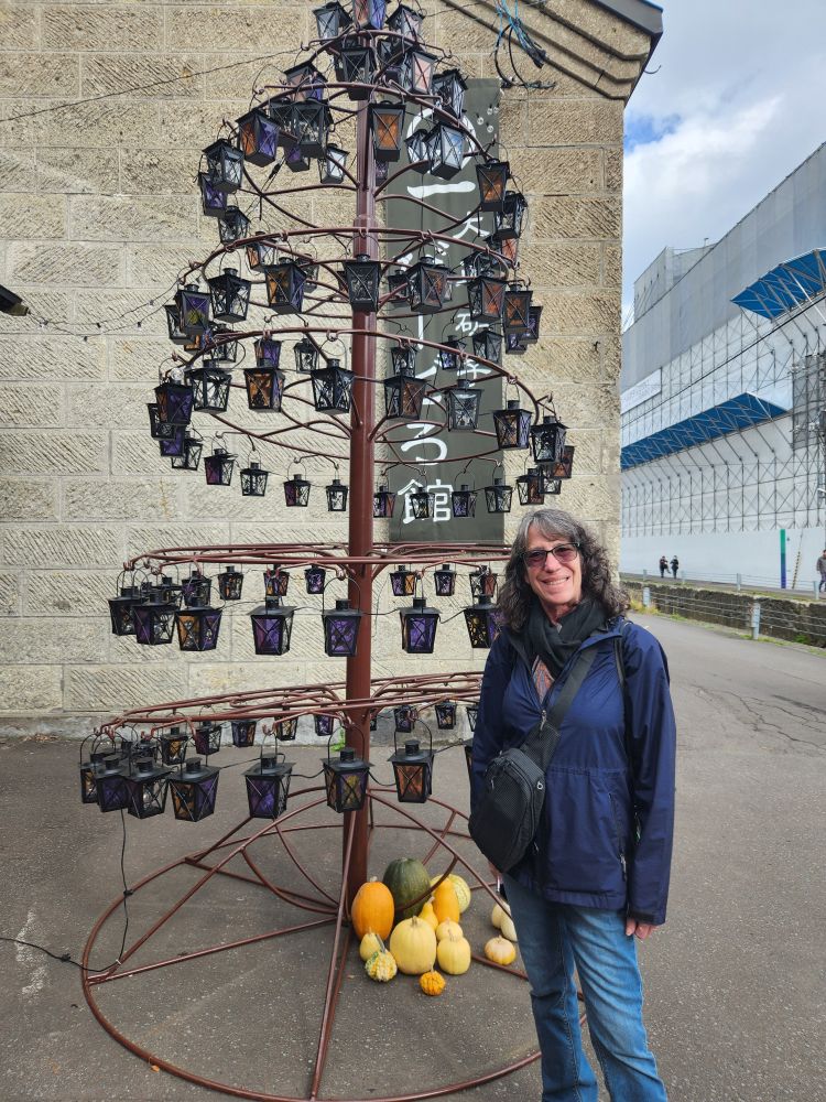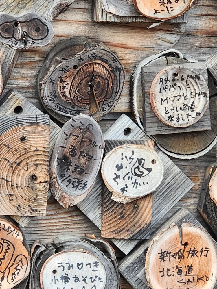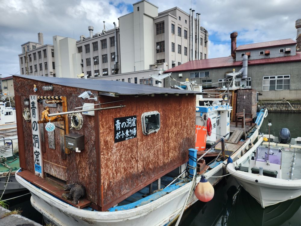 Shopping excursion done, we headed back into town proper for the history museum because you could buy a pass with the train museum. Walking past some great architecture – an ice cream shop that uses slices of trees as ornamentation on the outside walls, where people sign their names or draw little cartoons – totally different. Continuing on to walk alongside the 1 km long Otaru canal, originally constructed to be used as a waterway for barges to take goods from cargo ships moored in the harbor into town. When the new port facility was developed, the canals became superfluous and are now used as a tourist attraction offering canalboat rides up and down. We will follow the canal all the way into the main town, passing landmarks such as the building that housed one of the main importers in the time, the Nihon Yusen Company – looking more like a state house – past numerous boats, some made for transport, some just whimsical (and we think a bar in the later afternoons!) – and lots of great statues before reaching our History museum destination.