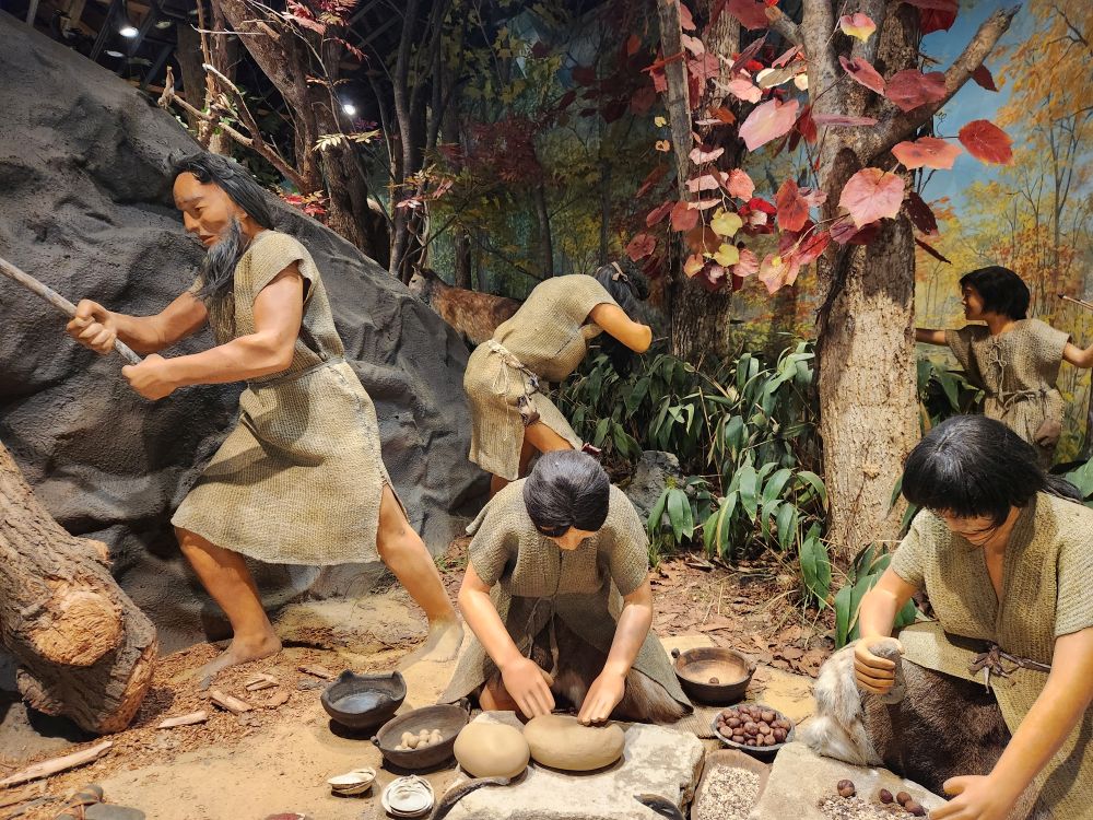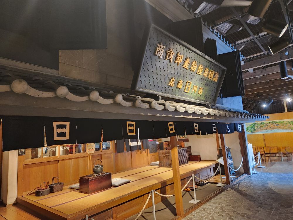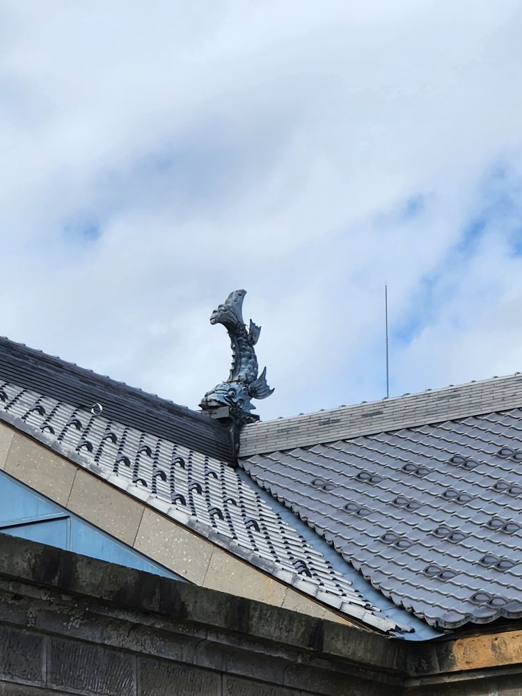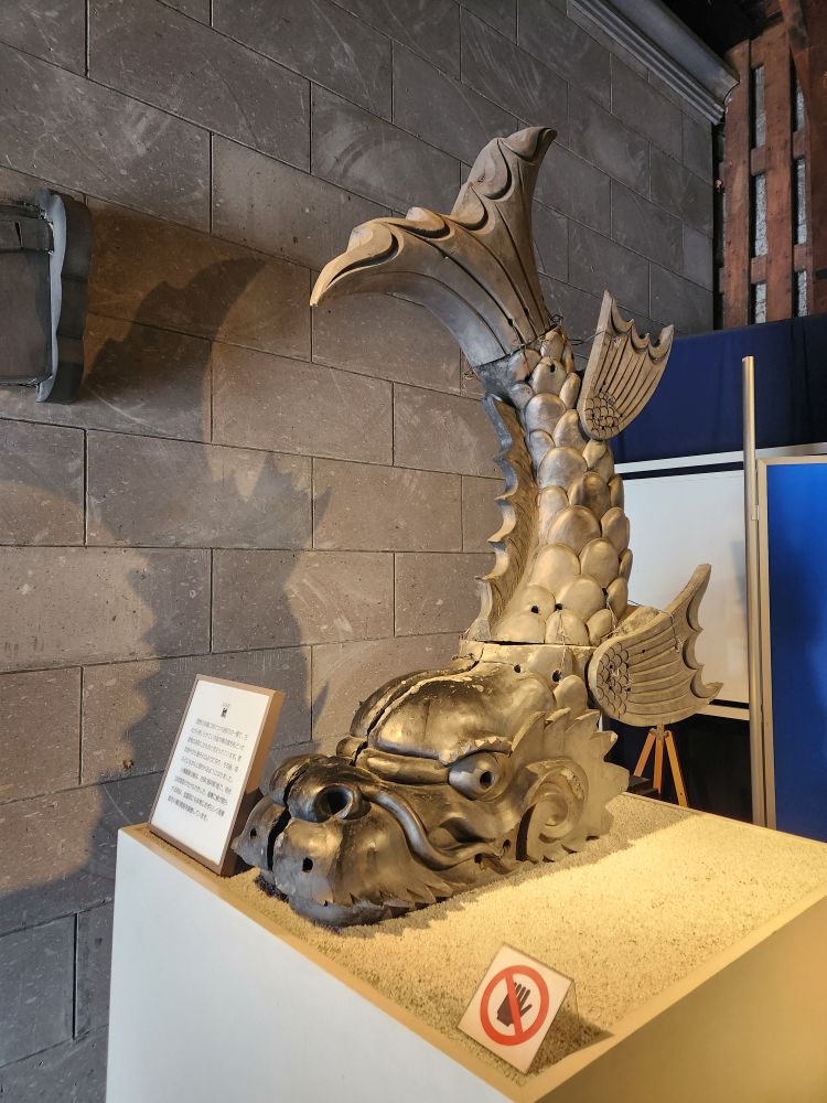 The museum itself is a nice little place, full of miniature building replicas, life size recreations of old shops and commerce in the streets as well as displays from even before the industrial civilization – complete with bunnies in the snow and indigenous Japanese forebearers. Plus odds and ends like the Shiusarako (fish like statue – said to be the tail of a bird – eh – don’t see it! Tail of a fish, yes, bird, no. Could be the translation.) decoration that are attached to both ends of the roof. All very interesting – and when we leave, we look up and there is an actual Shiusarako in use today.