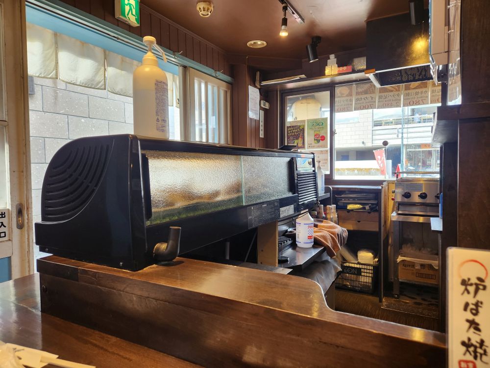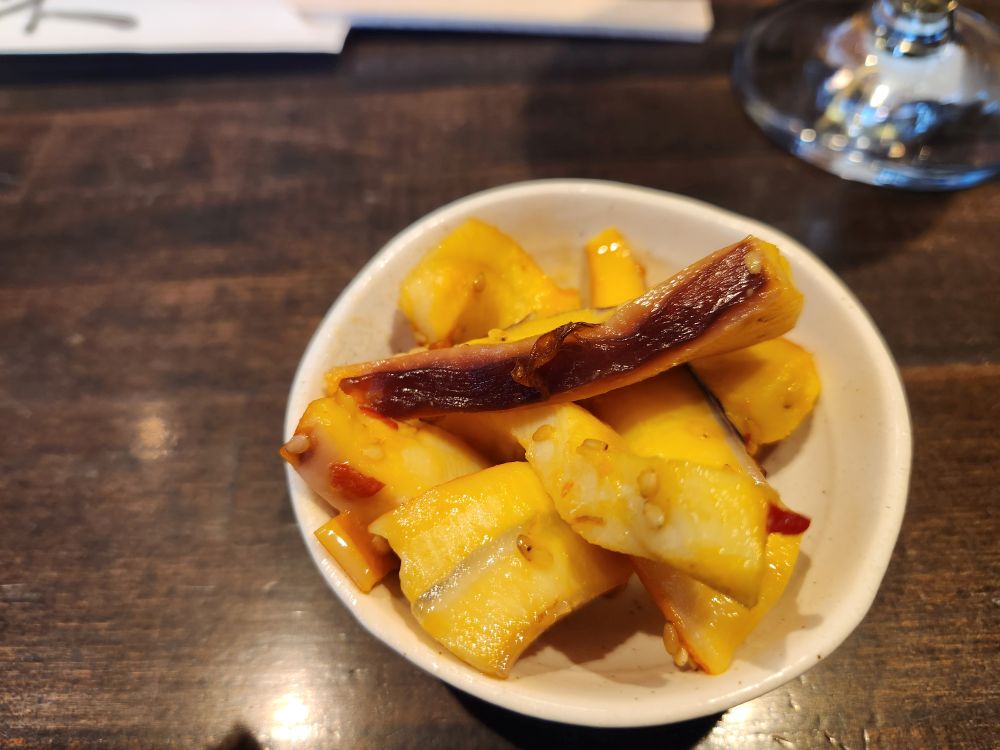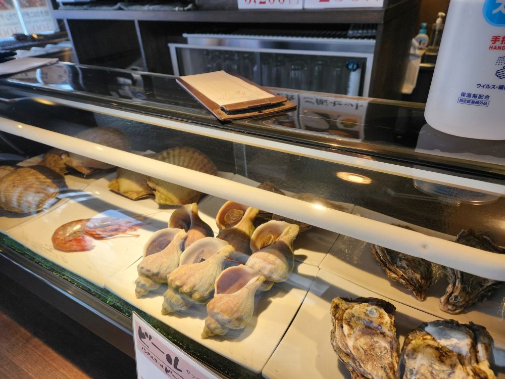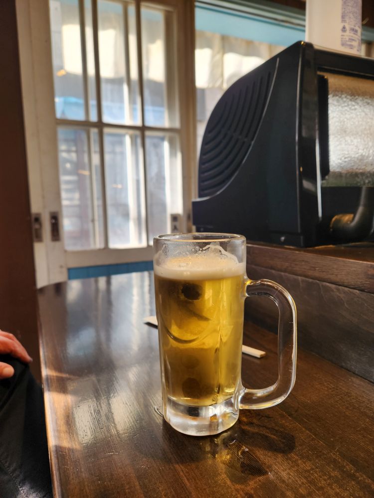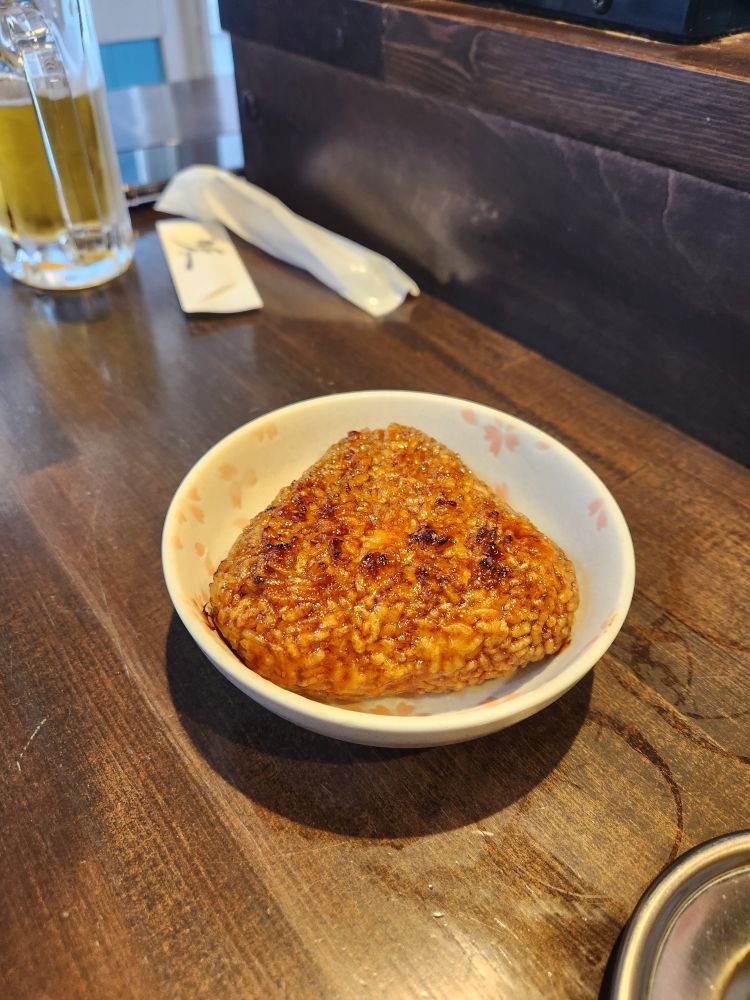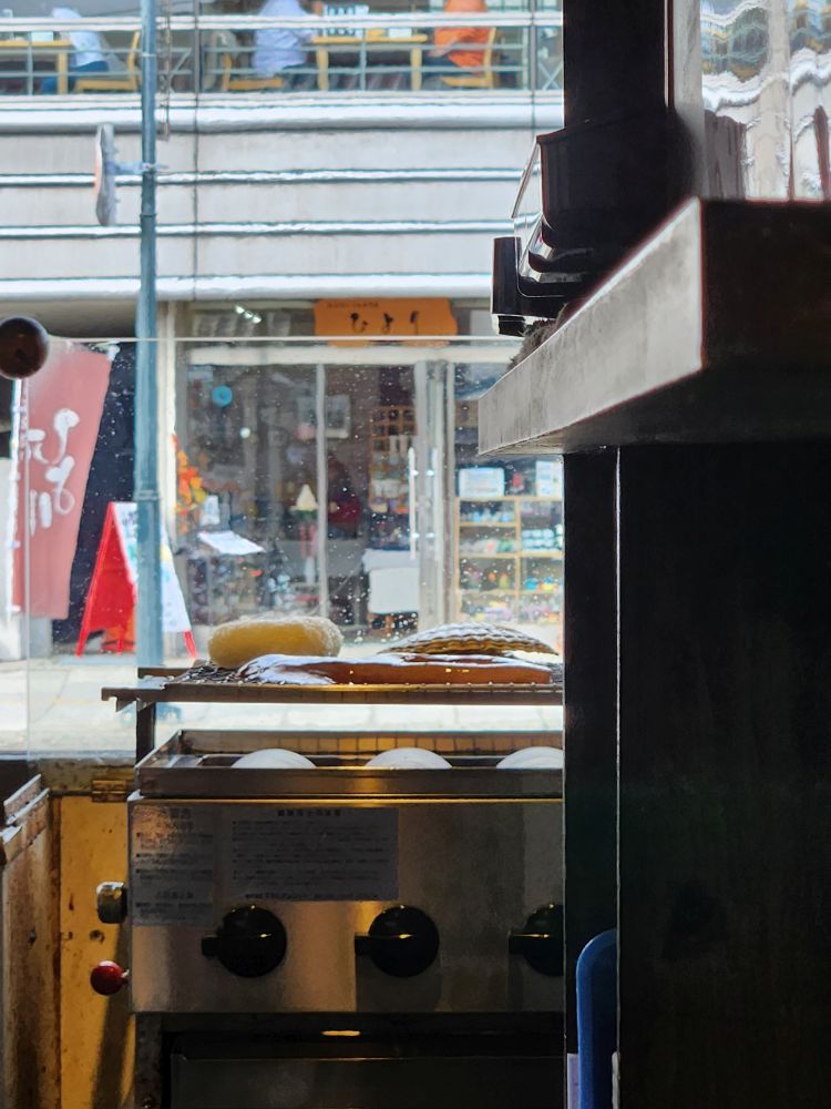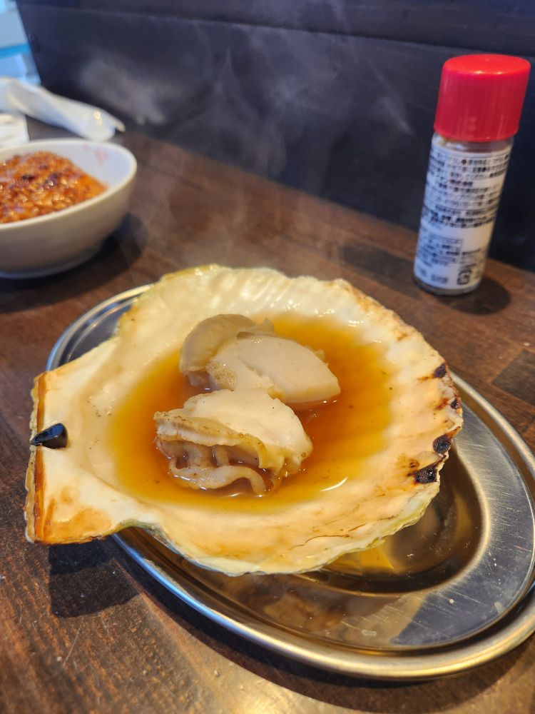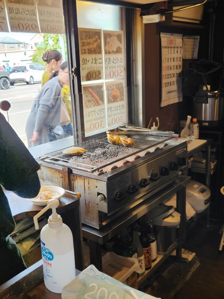 History done, it is time for lunch. Especially because it is a little early and this place is crowded with tourists – not just from the ship – and you know how it is here – you need to be early to get a seat in most of these places because they are so, so small. And true to course, we find this little place called Robataya Turukichi that has “limited seating,” yes they do! Maybe 12 seats inside and a couple of stools outside? They have just opened, thankfully, so no waiting, as we pull up our stools and order a grilled scallop, grilled squid and a grilled rice ball (had to try that!). We sip on our beer and wine (bonus) while we watch the proprietress grab our order from the display cabinet in front of the counter and begin to grill our lunch. She brings us small appetizers with the drinks (clueless as to what they were but they were good) and when she delivers our food – oh heaven. The best. The squid was tender and perfectly done – and large. The scallop was huge and sweet and wonderful and that grilled rice ball. That rice ball was the best thing ever…ever. The whole thing was just wonderful, and it was just the two of us sitting there in this little, teeny tiny place watching everyone pass by – not knowing what they were missing. Fantastic.
