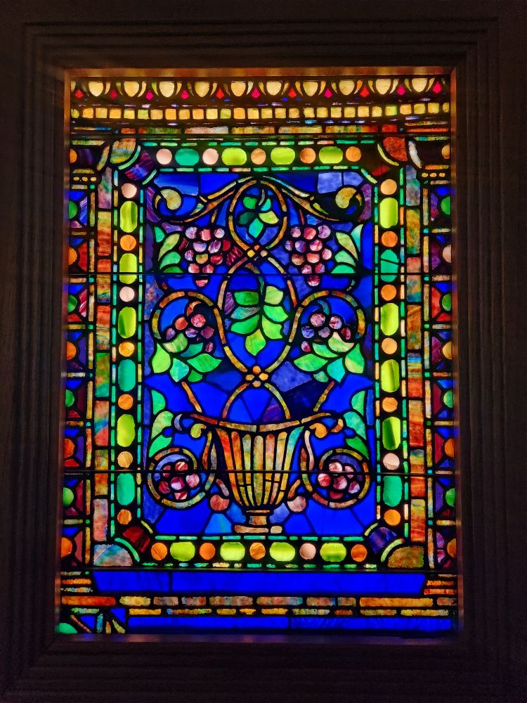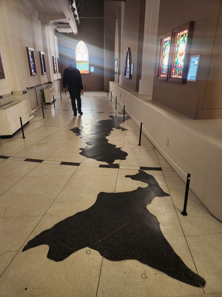 Salvaging the day, we go to the to the stained glass museum, which really was a museum, housed in an old storehouse for soybeans. There are about 100 stained glass windows, lit from behind, that almost glow in the darkness of this mammoth 2 story wood warehouse. There is also a really interesting display all about the steps taken to create a stained glass window along with a video showing an artist making one. All in all, amazingly weirdly strangely cool, but even weirder because all the windows came from St. John’s Episcopal Church, a defunct church in Jersey City, New Jersey. Why are they here? Bizarre, but really, really beautiful and interesting .