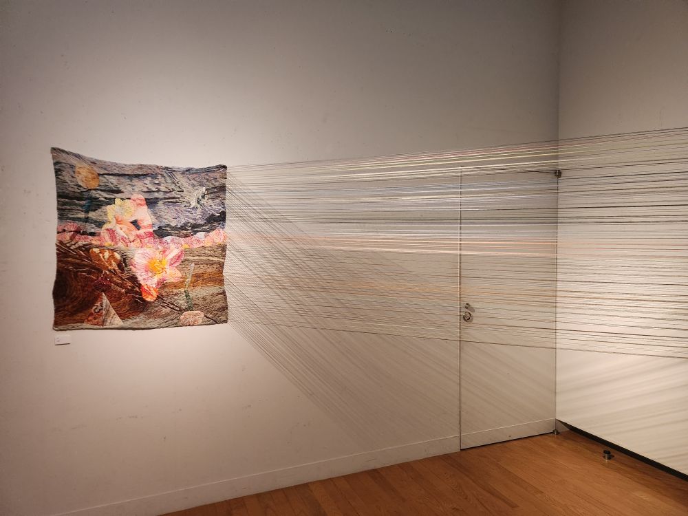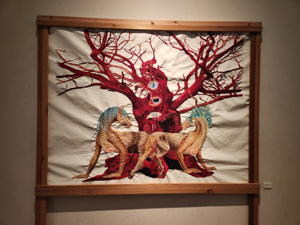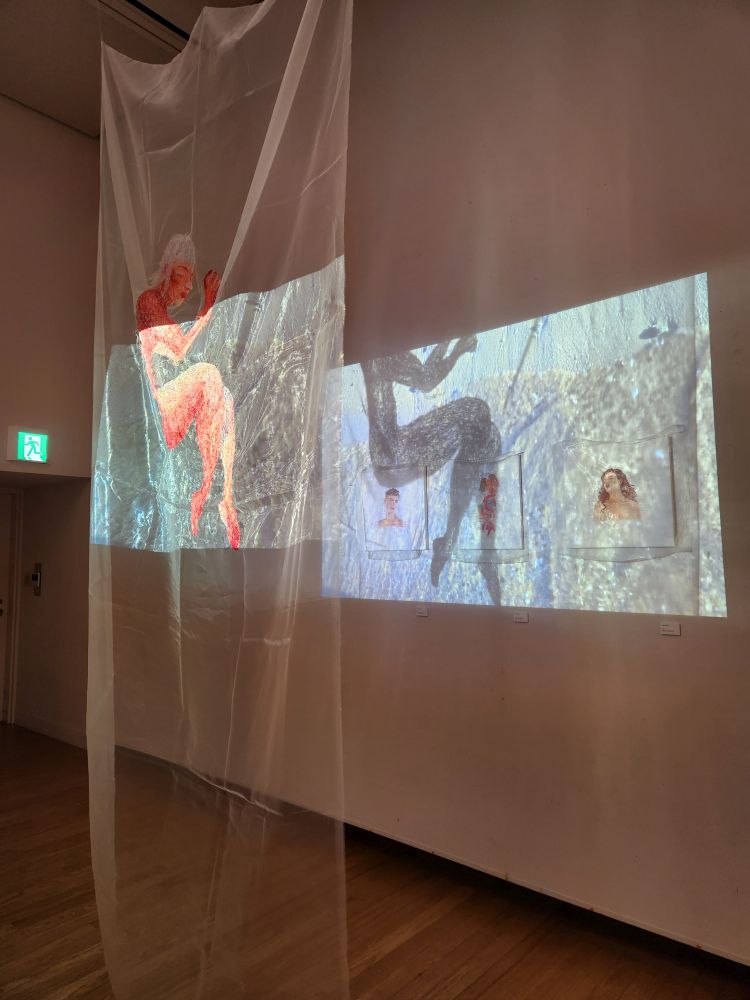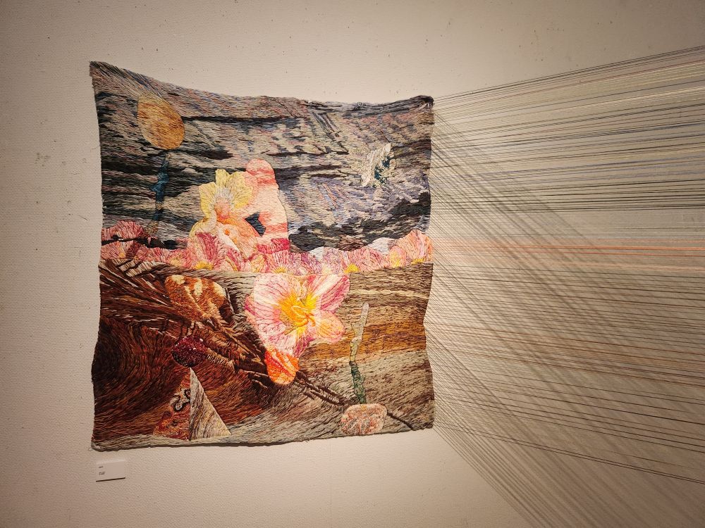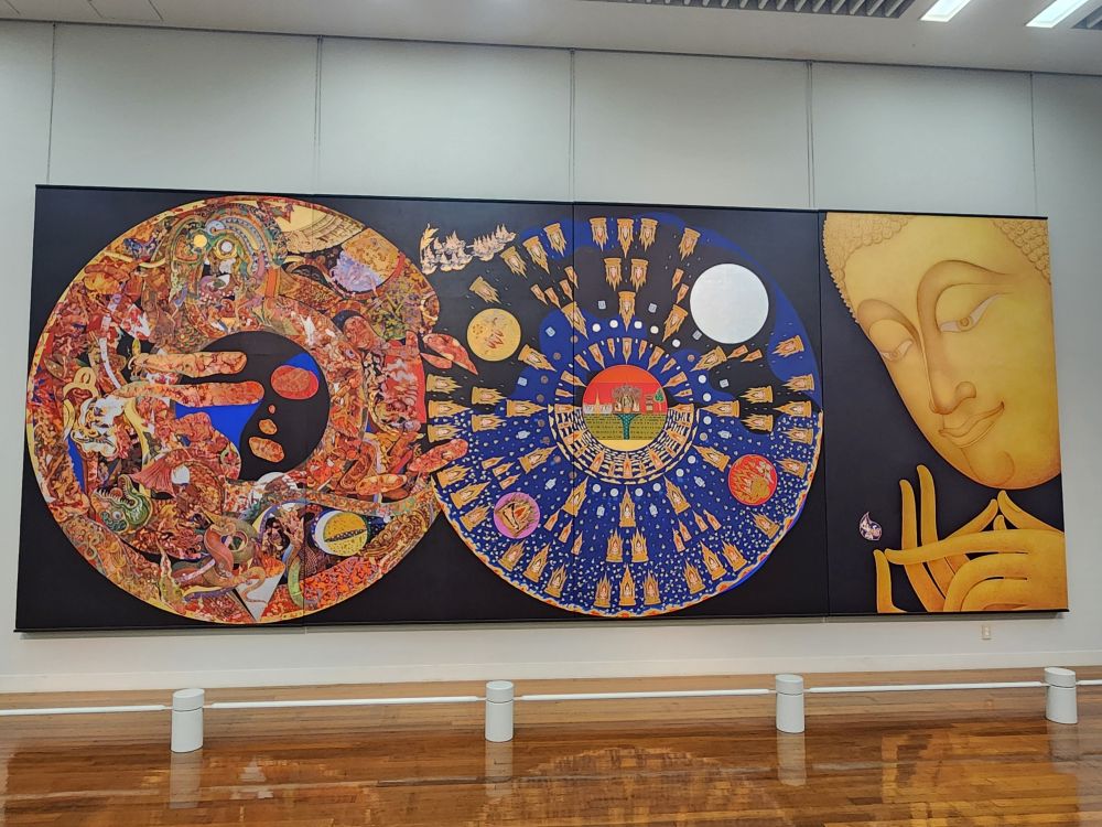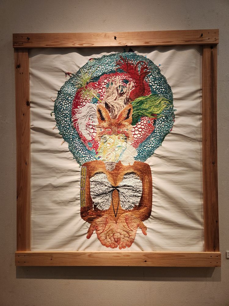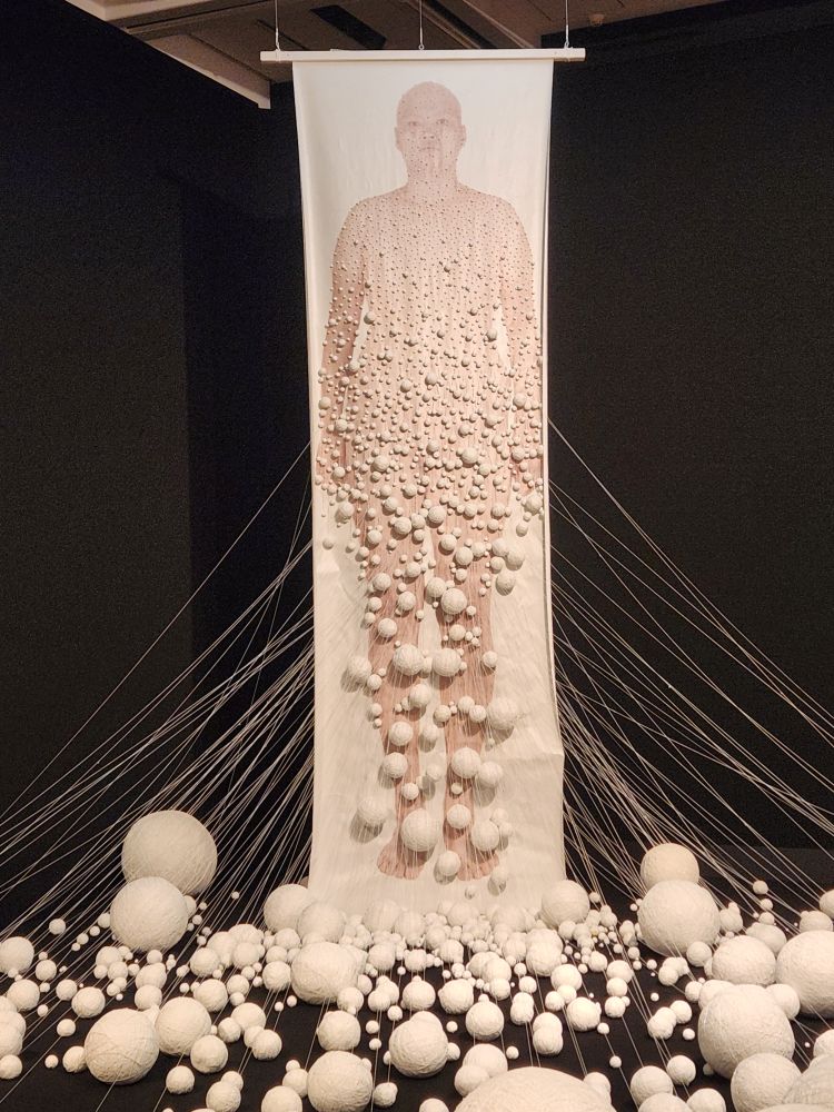Moving on, we reach some much more tame and interesting exhibits varying from a long video about an ancient Malay king, a sad room with photos of Khmer Rouge victims, Some Buddha and Mandela depictions, a fabulous exhibit of woven portraits and cloths, some that are even deconstructed so we can see the actual threads stretching across the room and some strange embroidered gauze materials used as shadows across portraits on the walls. That was an experience!