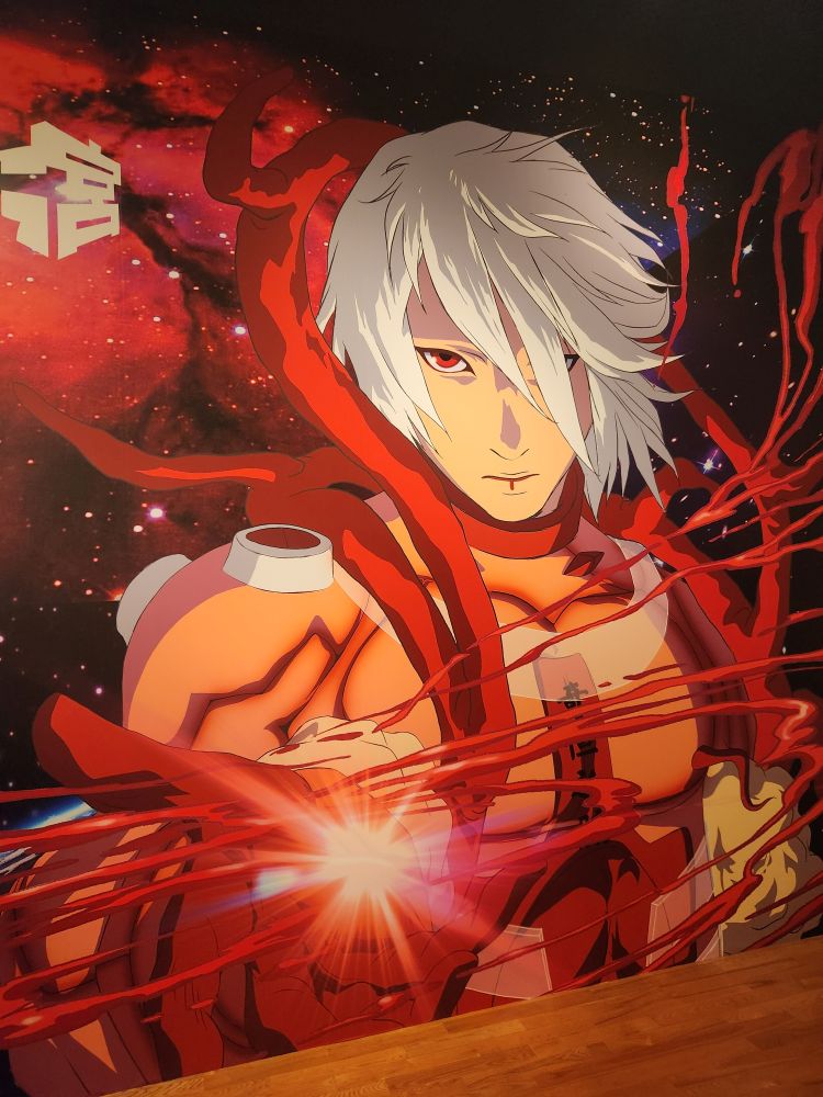 We move onto Spawn by Lin Tianmiao, a renowned Chinese female artist who uses her own self-image for the body printed on the hanging screen and the balls of string to indicate the number of ovum created by an ovary in a lifetime. A really cool exhibit though (honestly) is the montage entitled “All Eyes Look to the Sky.” It is a collection of small thumbnail photos of Indian and Pakistani movie stars, all put together to recreate a photo from the National Day air show by Rashid Rana. It is fascinating and just amazing how he did it. Talk about time consuming! But by far the absolute weirdest is video entitled “Uterus Man” by Lu Yang. A 10-minute anime-like video that chronicles the exploits of super hero Uterus Man who is powered by blood that can fly, uses a sanitary napkin as a skateboard and the placenta as a defense mechanism. You cannot make this stuff up.