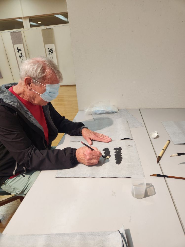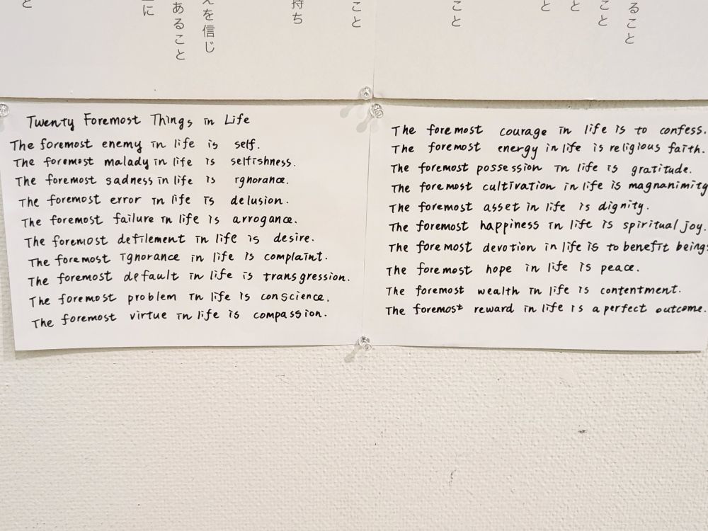 Finally through most of the weirdness, we move upstairs where there are 2 special exhibits by local artists, one that particularly interests us is the Venerable Master Hsing Yun’s One-Stroke Calligraphy exhibit. This is just amazing – after Master Yun lost his sight due to complications from diabetes, he began creating calligraphy with just one-stroke. All these silk wall hangings contain his writings: The twenty foremost things in Life. In addition to just the sheer fascination of this artwork, there is a hands-on table where we can practice like Master Yun – using disposable facemasks as eye masks! Too fun. And also so instructive. That was totally hard – it takes a lot of dedication and know how to do this in one stroke and blind! We can’t do it in many strokes with full eyesight! But our message still comes through….look closely at the last photo.