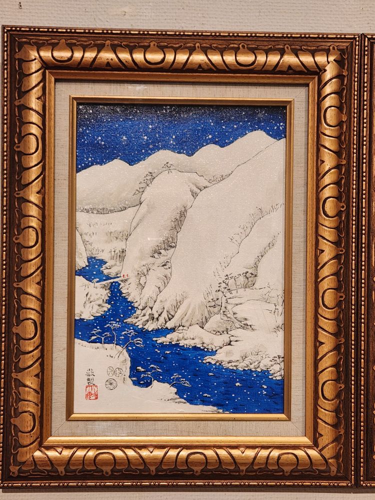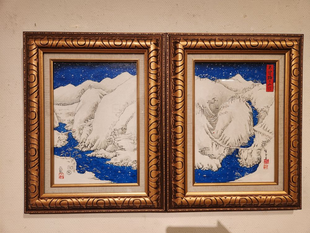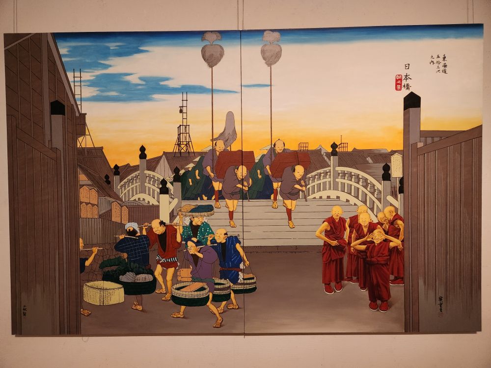 There is another exhibition in the next room called “Please listen to me” where the artist is focused on trying to break the barriers of time and space with his paint brush. We don’t quite understand it, but it has something to do with inserting a little red clad monk (we think) in every painting. Whatever the artist meant, the paintings are really interesting and the snow-covered mountain set just gorgeous to look at.