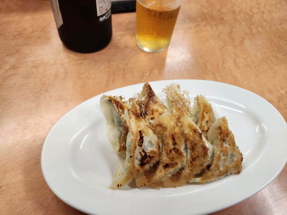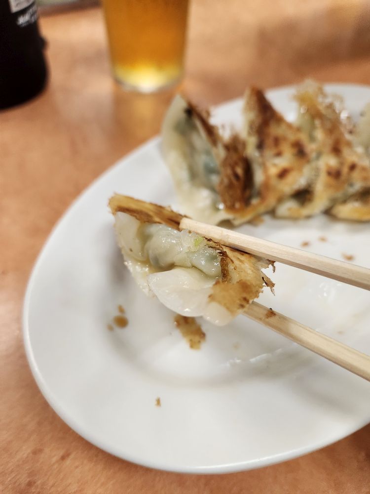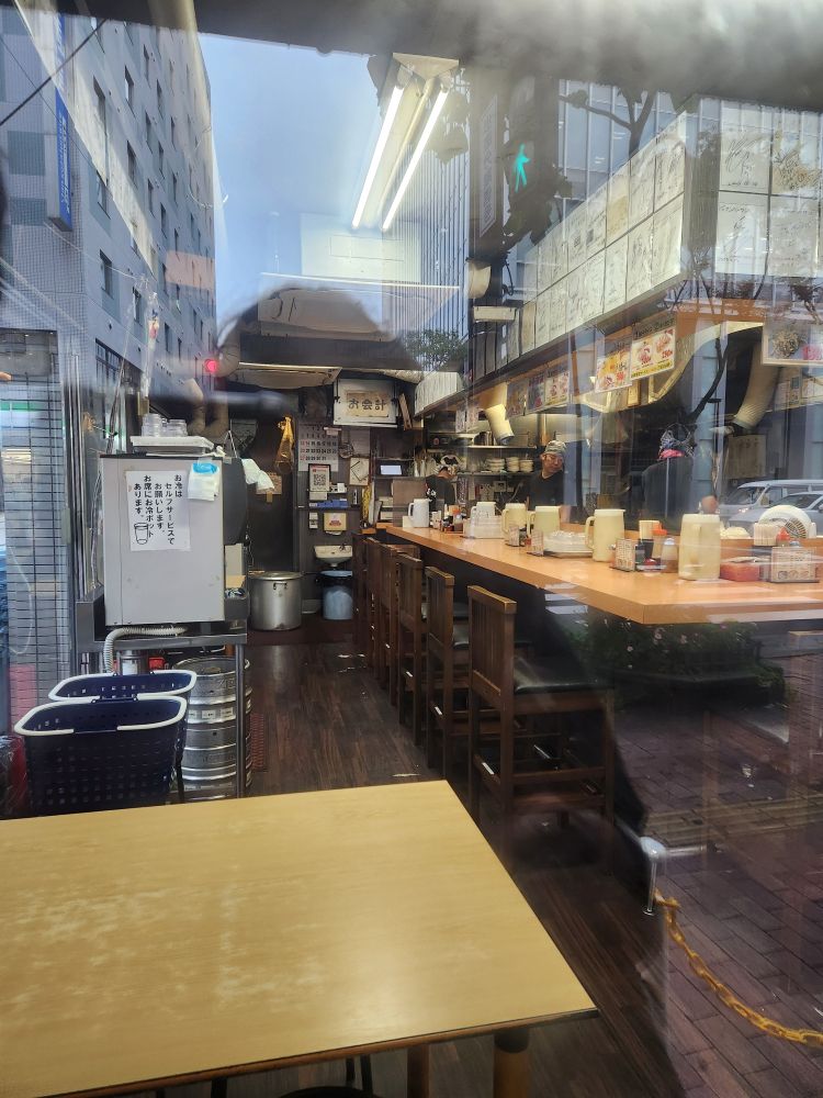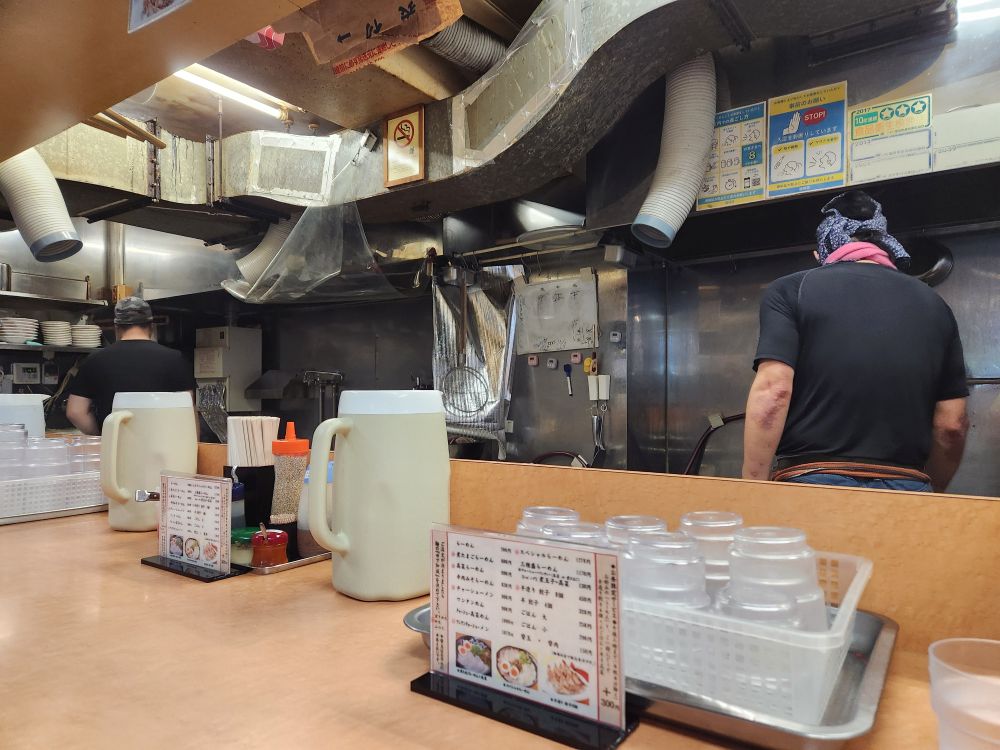 We’ve actually spent quite a lot of time here, enough that it is just about lunch time, so off we go in search of sustenance. We had pinpointed a little diner, Nagahama number One, that is known for its Nagahama Ramen, a local specialty. Serving food since 1971 (starting in food stalls), they have a little place about 10 minutes away. Luckily, we were able to walk most of the way through a long, covered shopping arcade, sparing us from the downpour. Arriving at the restaurant, we were still too early and had to wait in line (2nd fortunately) under a narrow little awning until the place opened up. It was the best! Truly teeny with only about 12 seats, we were shown to the counter where we ordered our gyoza (yum) and the Special Ramen and Wonton Ramen, which they prepared right in front of us. Fabulous! And so lucky to be first – the place fills up fast and once we were done the line was wrapping around the corner!