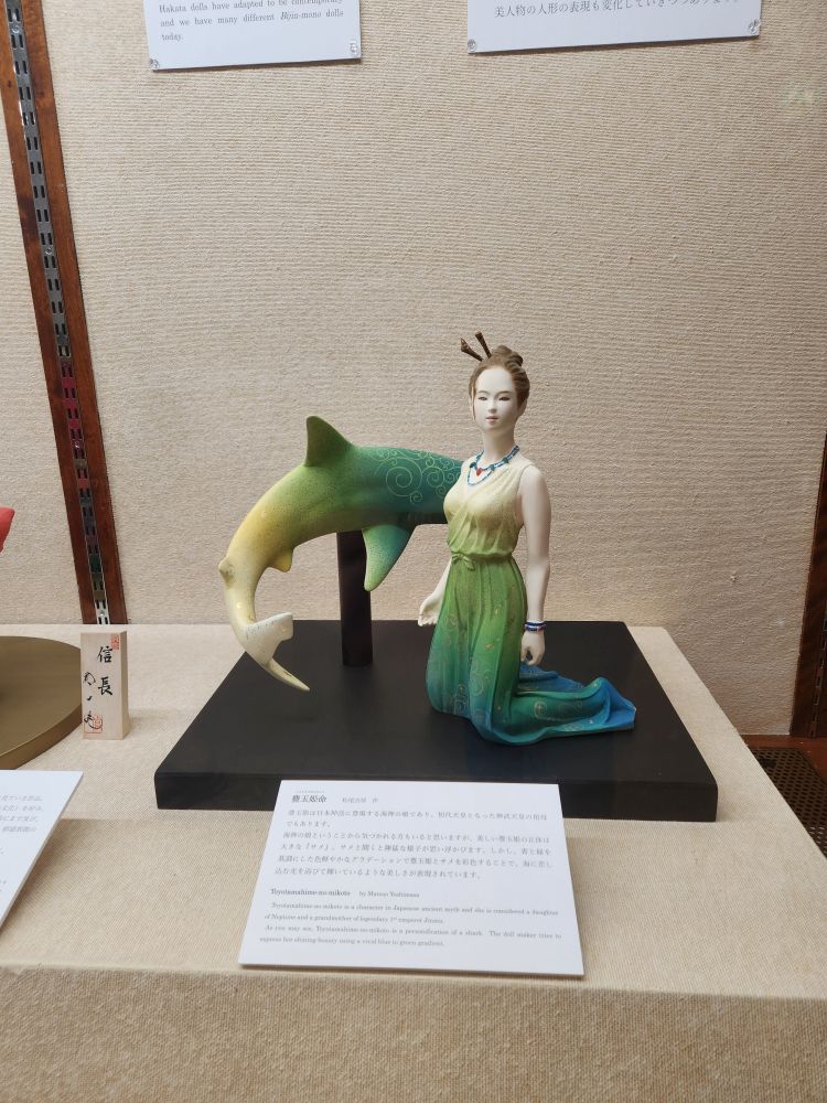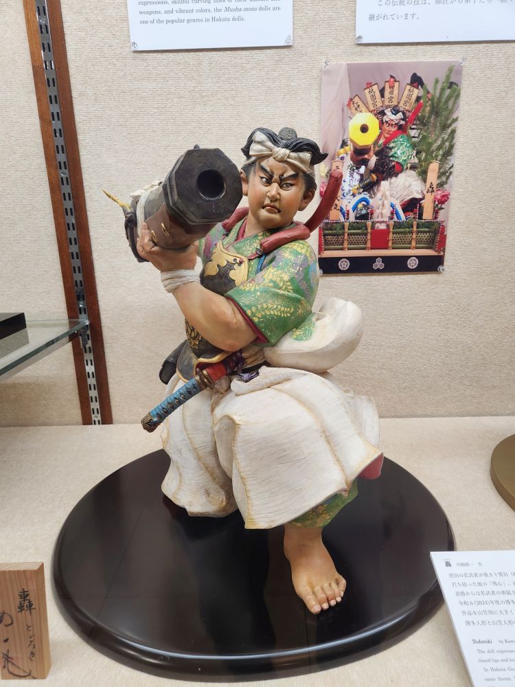 Another room holds intricately detailed Hakata Dolls, a long-standing tradition of sculpted clay dolls made specifically in Hakata. There are dolls representing some of the local myths, and the ever so popular Musha-Mono dolls, warrior dolls, that are traditionally popular on Children’s Day. There is Shibaraku, a story of poetical justice where the hero, Gongoro Kagemasa, fights against an evil lord. And Mushi-no Ne, a poem about a lady lying in the garden at night with her heart withering. Very beautiful.