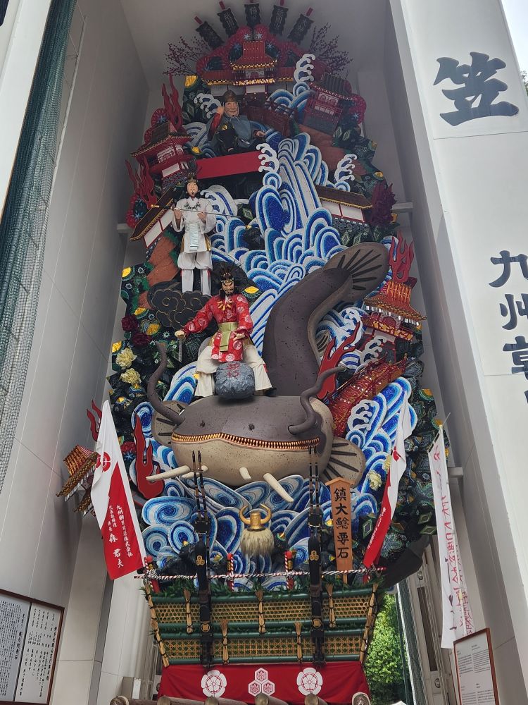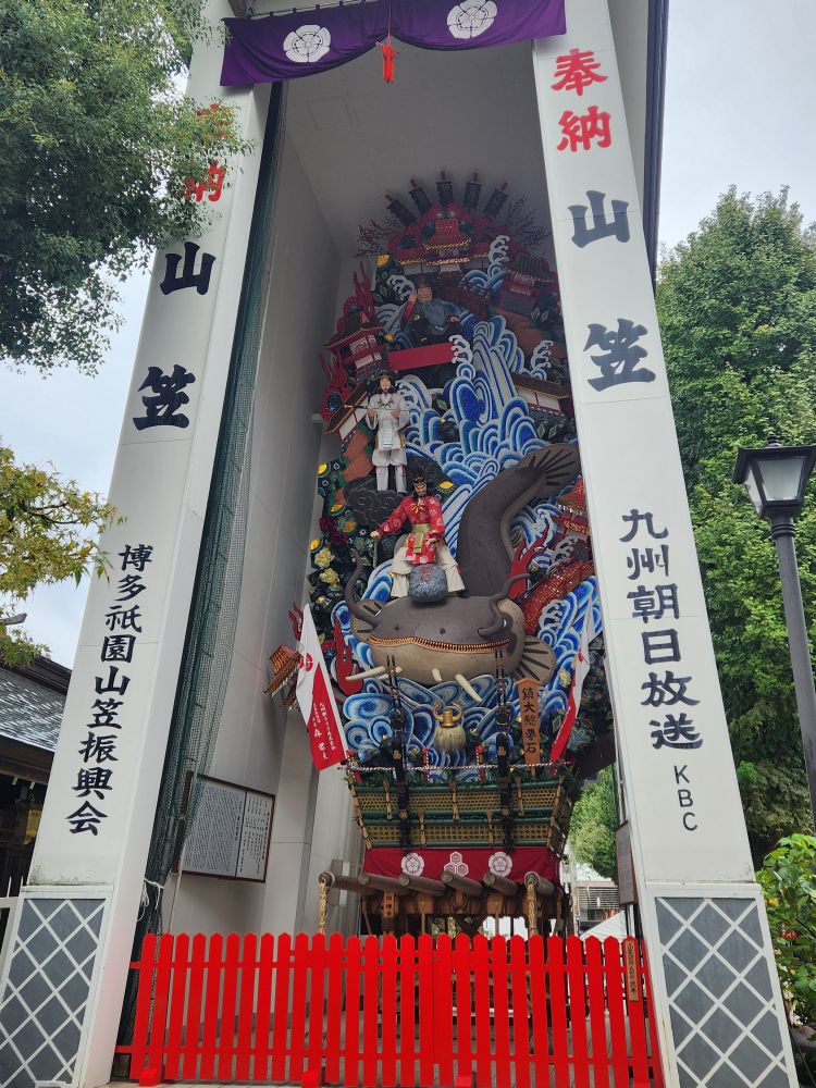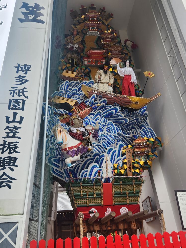 Leaving the Folk Museum, we did manage to visit 1 shrine (there were 3 we wanted to visit but the rain put a stop to those plans!) – the Kushida Shrine. Basically because it was literally on our way back to the shuttle! Known for being the host of the famous Gion Yamakasa Festival held in July, in addition to the typical – and beautiful – Torii gates and shrine ornamentation, there is an actual Kazariyama Festival float right there on the grounds. Totally cool. And man, that float is monstrous! It towers above us for 30+ feet. These things are so big, they don’t parade them down the streets any longer because they would hit the power lines – they are that tall! The tall floats are displayed around the city as decorations, and smaller floats called Kakiyama are made and raced through the streets.