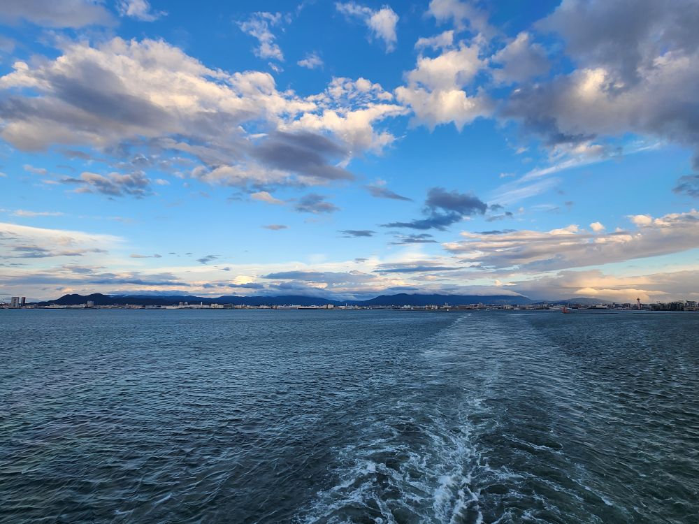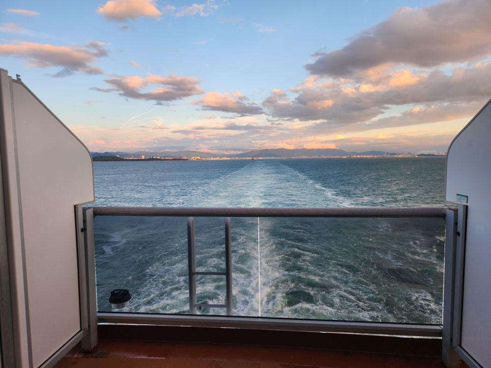 At the shuttle, we are at the end of a really long line, and figure it will take at least one more bus for us to get on. But no, we actually make it on easily because the people in front of us don’t want to go for some reason – I don’t know – I think they got confused because they thought the bus was full but weren’t paying attention to the little pull down seats? Who knows, but they didn’t have to ask us twice – we’re on the bus, back to the ship, for a beautiful sail away – now in clear, gorgeous weather. Eh, the adventures of traveling.
