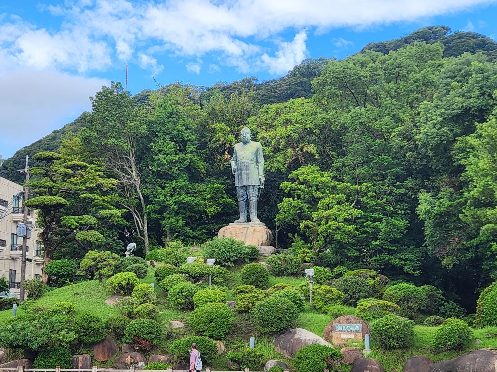 We’re in town a little before 10 and on our way through the city, passing the hospital with the “Doctor Car” out front – easy way to say Ambulance, we suppose! Through town, past Chou park where we missed the HoHo bus by a minute on our last visit and then across the street to the Cultural Center and Community Center square, where we were hoping to get more pictures of the little Akita dog that was placed there across from the Saigo Takamori statue (he loved his Akita pups). But weirdly, the dog statue is gone. Saigo is still there. The statue of Komatsu Tatewaki (the local scholar who made great contributions to the Meiji Restoration) is there – and some other random statue – but no puppy. Bummer.
