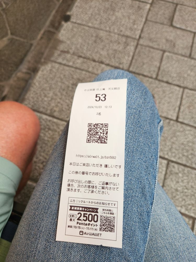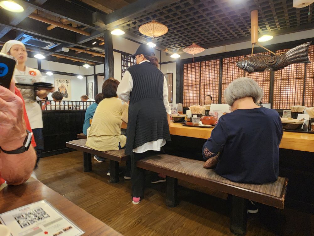 Only we don’t quite know how to actually get a table. A bunch of people are waiting, and we sort of figure out we need to get a ticket from the machine by the door. Luckily a sweet girl manning the take out counter helped us. We had to enter the number in your party then take the numbered slip that the machine spit out. We then sat on one of the provided benches and waited as a woman came out and yelled the next number with a table available. Of course she’s yelling in Japanese. We have 53. Who the hell knows what that sounds like? Again, the sweet take out counter girl helped – and just as I was translating 53 to hear what it sounded like, the lady called us. Phew. We’re in!