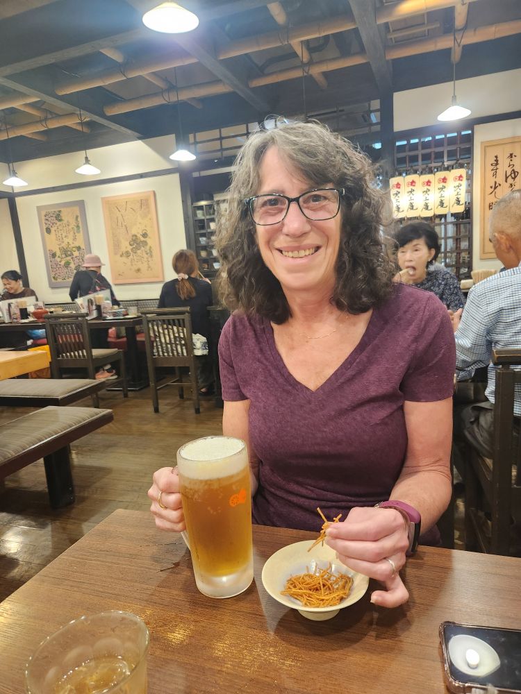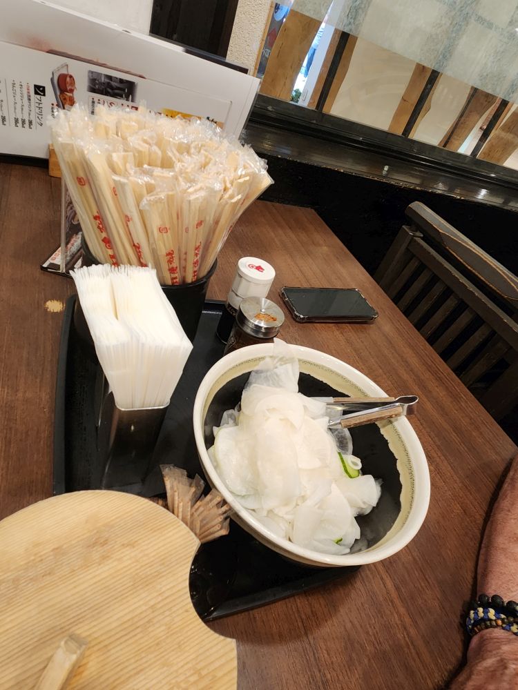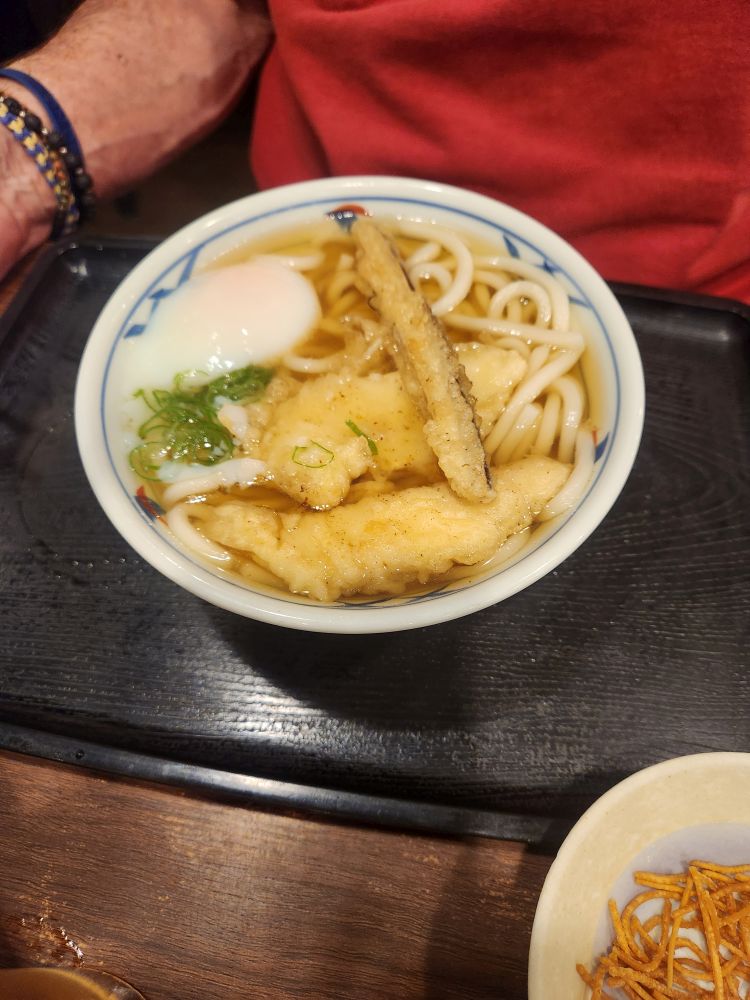 It’s a popular place this whatever the name of the place is. And the food was delicious. Excellent Udon noodles (hot, thank you very much) with tempura shrimp for me and a chicken for Ed. So good! And what an experience. Totally fun!!!