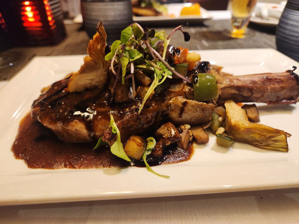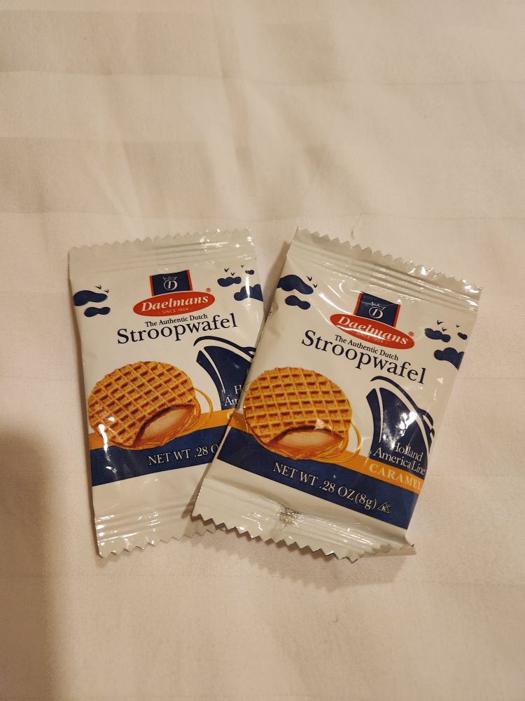 Evening activities commence with dinner tonight in Canaletto. Excellent as always. Veal chop for me. Sea bass for Ed. Hazelnut tart take home for tomorrow! Dinner takes long enough that we don’t make the show – but it is the magician, missing him doesn’t bother us. Grabbing drinks from Arvin at the Lido bar, we immediately retreat to our cabin to hide. It is Orange night! Yikes, the bar crawl, the party. Nah. Our balcony is calling us….along with a cute little special treat we find on our bed: Mini Stroopwafels. Sweet! Our favorite! We’ve never had those onboard before – nice touch to end a very good day.
