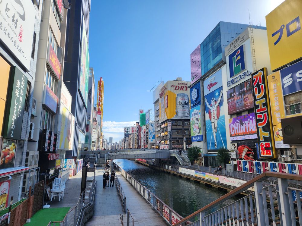 Dontonbori is, well, over the top, and always so fun. We meander across one of the bridges for photos, ending up in the high dollar area of Osaka. Oops – about face! We do not need or want Gucci or Prada or any of this stuff. Heading back to the bridges, we pass a shrine located beneath a massive modern hotel. Really? Oh, well, yeah, the hotel built the shrine too – totally Disney World. Quick, back to the safety of Dontonbori craziness!