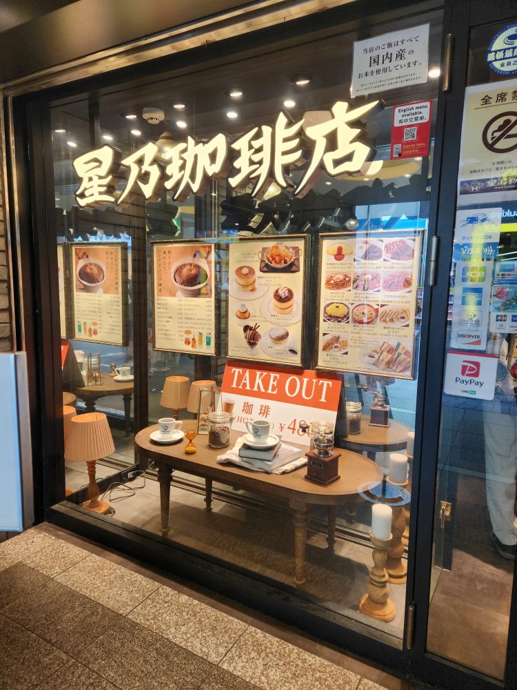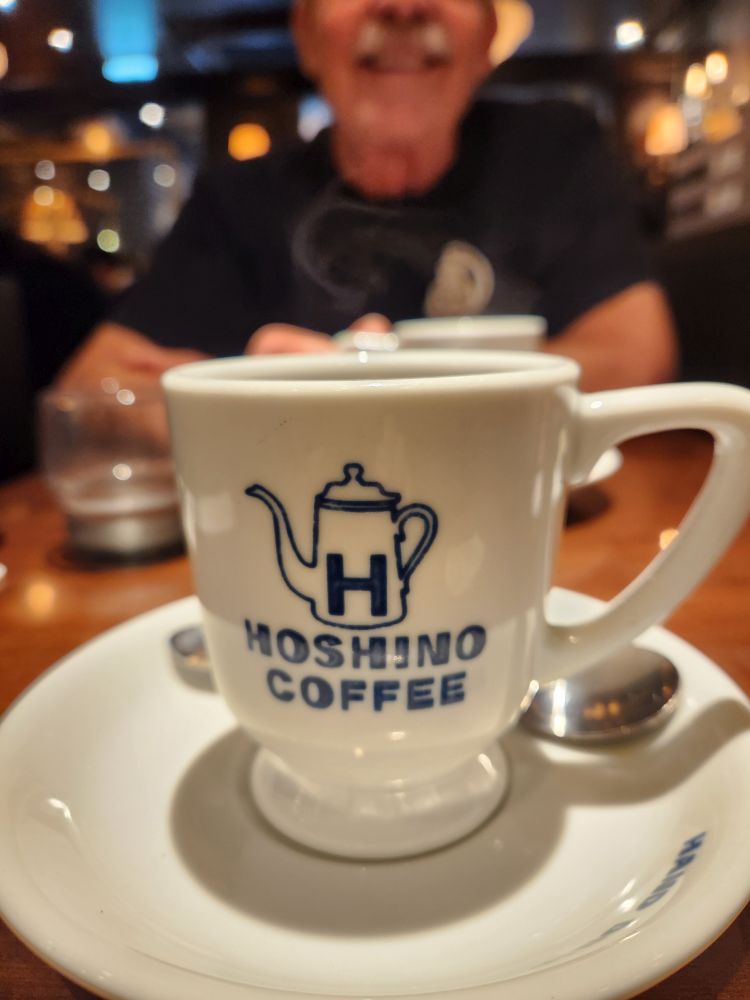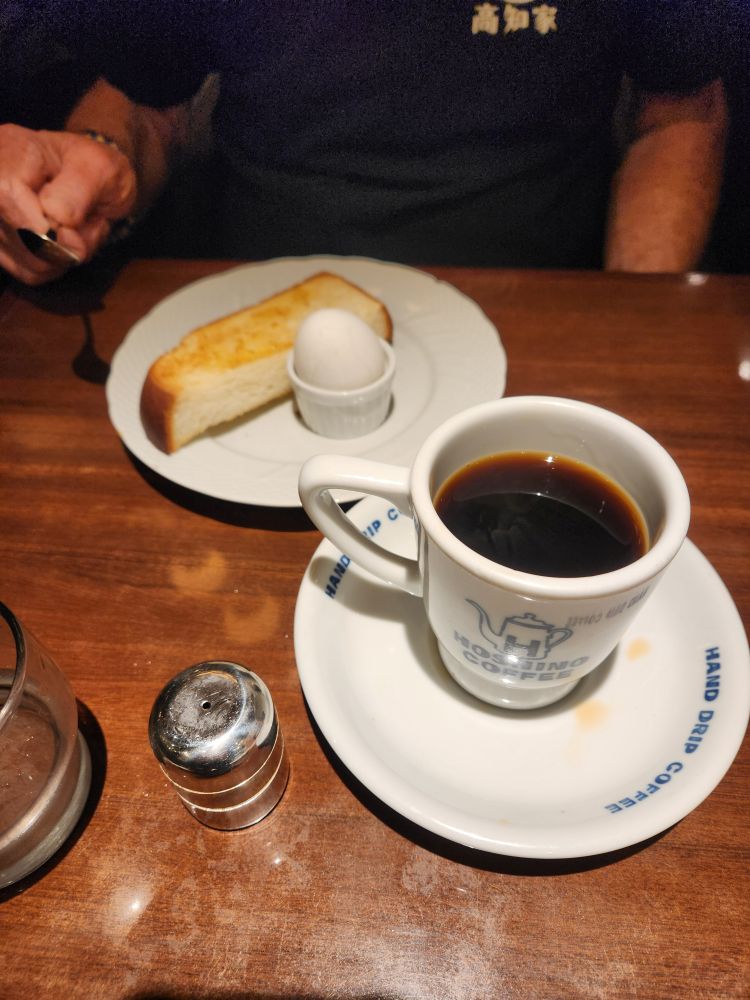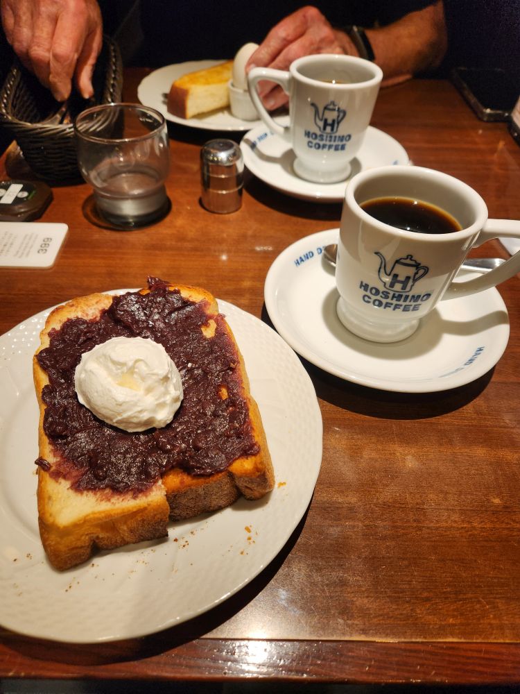 It is so early, lunch is but a mere suggestion at this point, so we stop at a non-Starbucks coffee shop (sigh) called Hoshino (turns out this is also a chain, but at least it’s Japanese) for drip coffee. Score. It’s expensive, but they are serving morning breakfast and you can get a selection of food along with the coffee – for the same price as the coffee. Huh? Well, we really don’t want food, but that’s a no brainer. So, 2nd breakfast on the way. A nice piece of toast and egg for Ed, toast with red bean paste and whipped cream for me. And lovely drip coffee. Nice way to waste an hour.