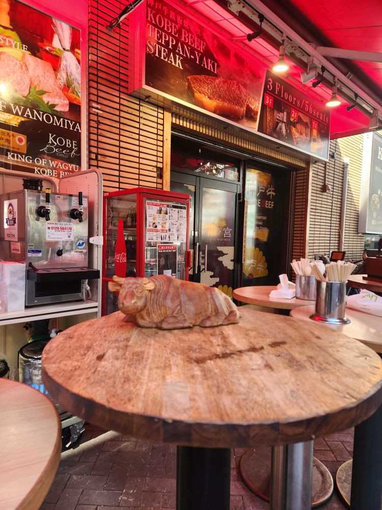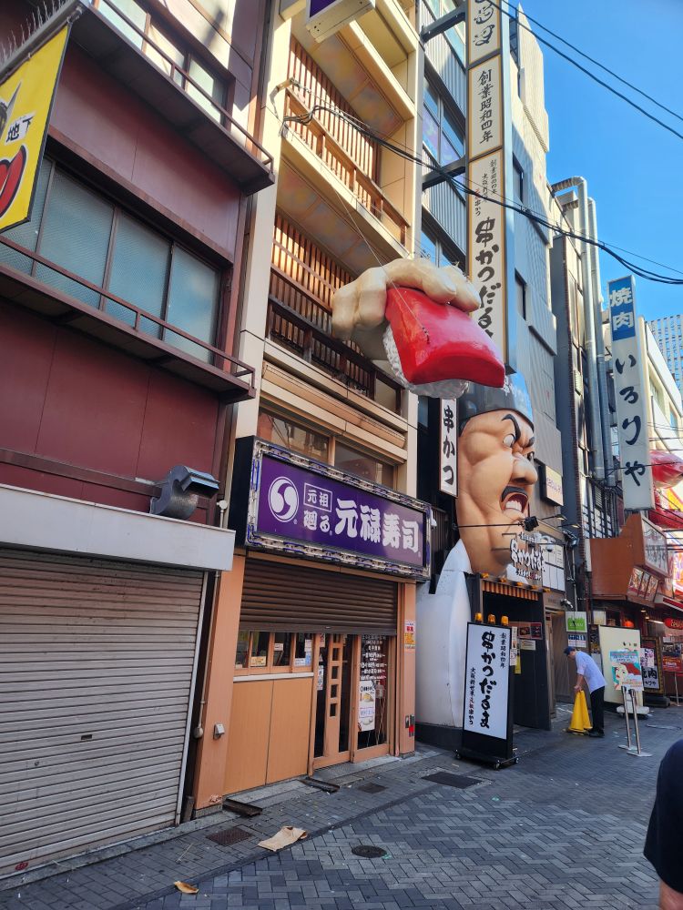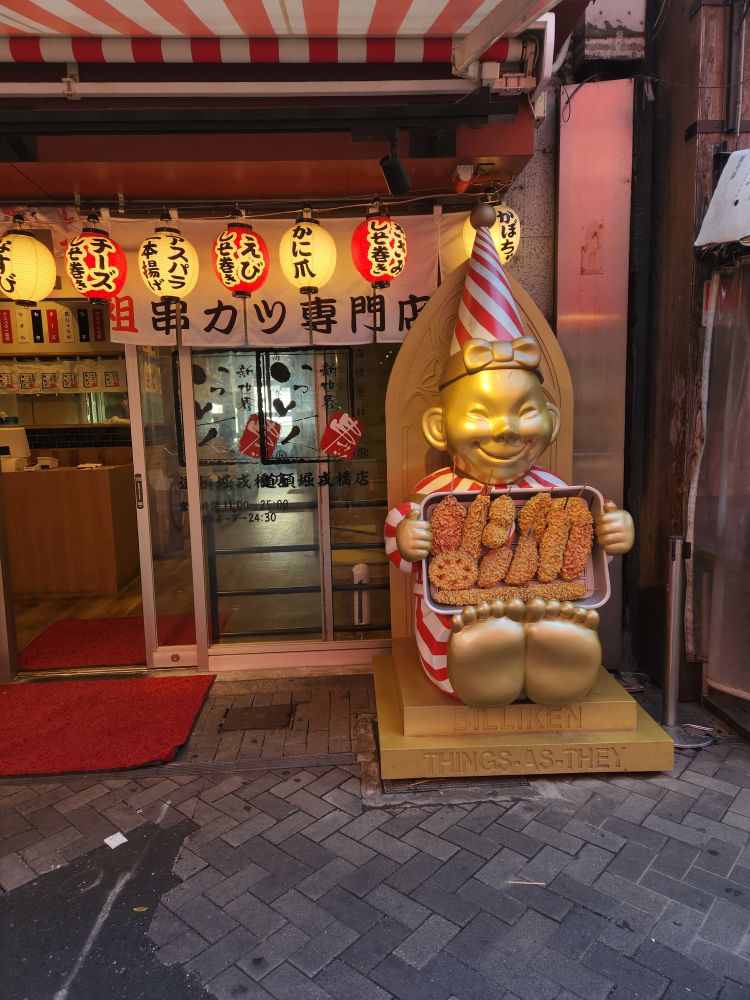 Back out on the streets we simply meander about, looking at everything, snapping pictures of all the fun madness – the massive caricatures of whatever a restaurant or store is selling affixed high up doorways, traditional izakyas stuffed in between massive modern (and cartoonish) structures, lucky Billiken statues (the “God of the way things should be) everywhere, more manhole covers. It is fun just to watch the world and the wackiness go by as we traipse about.
