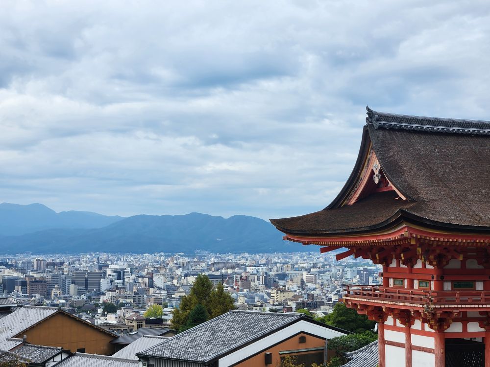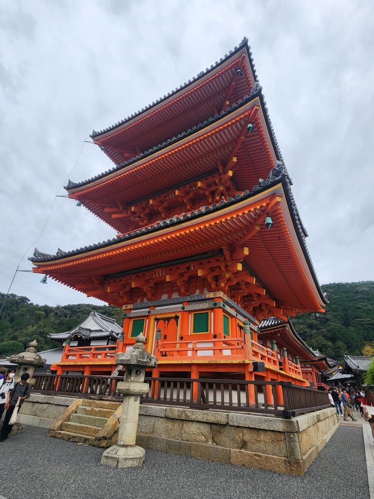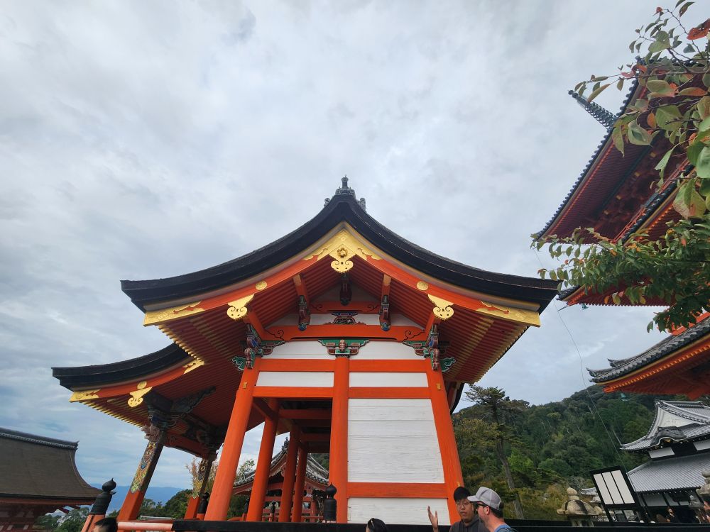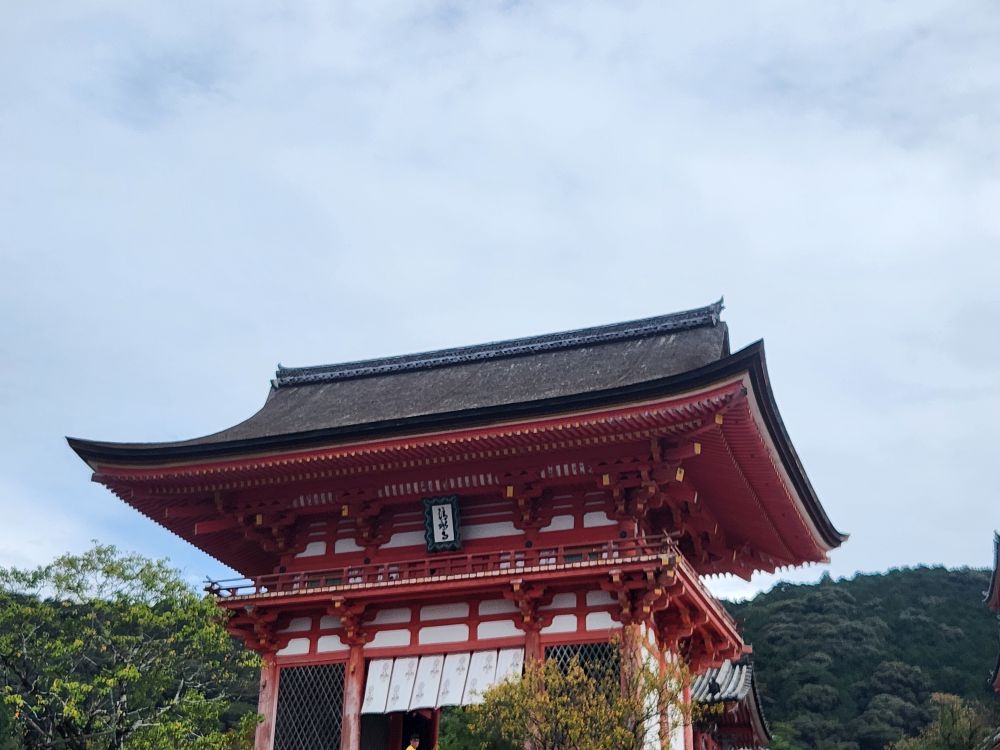 That handled we begin our explorations. This half day is a bonus, which allows us to reorganize our schedule and head up to Kiyomizu-dera Temple, one of the most celebrated temples in Japan. It is a 45-minute walk from here, which would take too long with our short time limit, and sort of hard to get to on the subway – and the buses are out of the question. But we have Bolt! And we are right on the corner of a hotel and the mall – easy pick-up place. Quick, easy – seriously – the taxi is there within minutes of pushing the button! He was actually right there in the taxi queue and pulled out to pick us up. Perfect. And he is great – very little English, but enough. He points out different things along the way – the “number one ramen restaurant,” which has a line a mile long waiting to get in, the Kama river, something else we didn’t quite get. Then he starts talking about Kiyomizu-dera – and making motions for going up, up, up. Yes! We will walk up stairs and up, up, up until we are at the gate then out to the main temple where the views are said to be spectacular across the city.