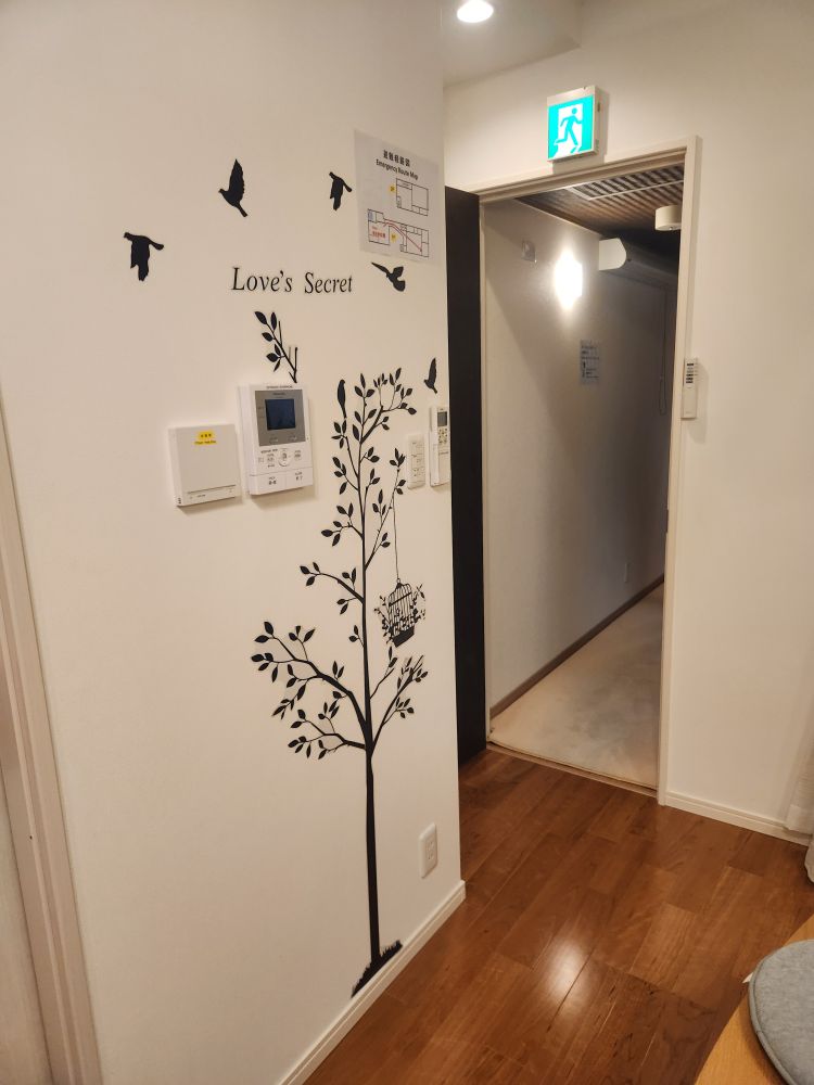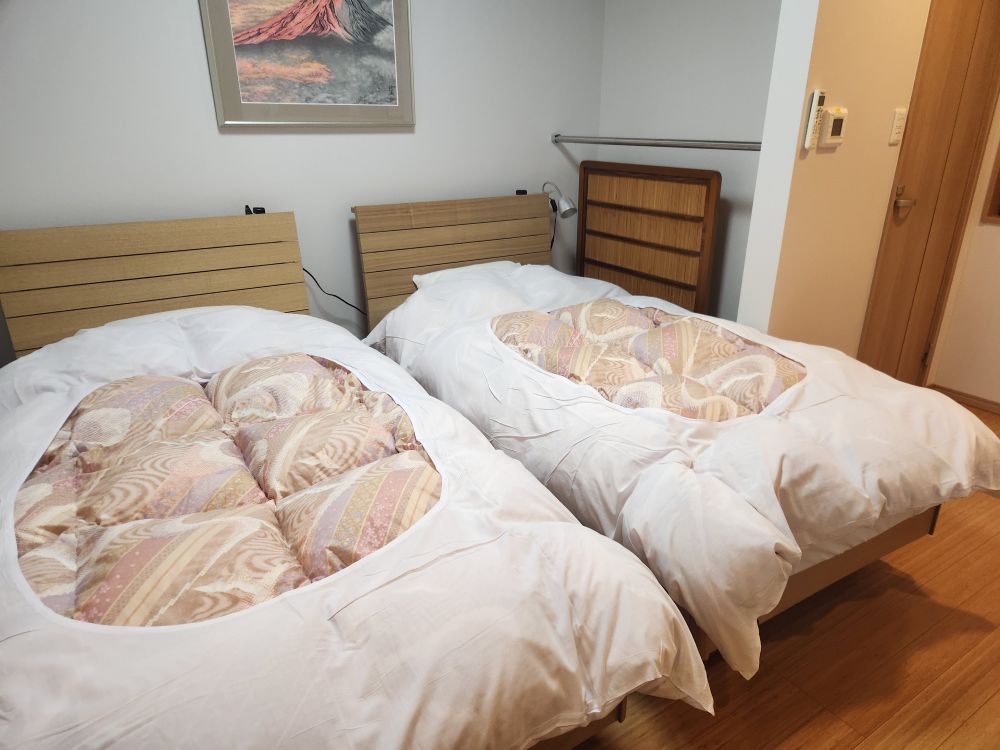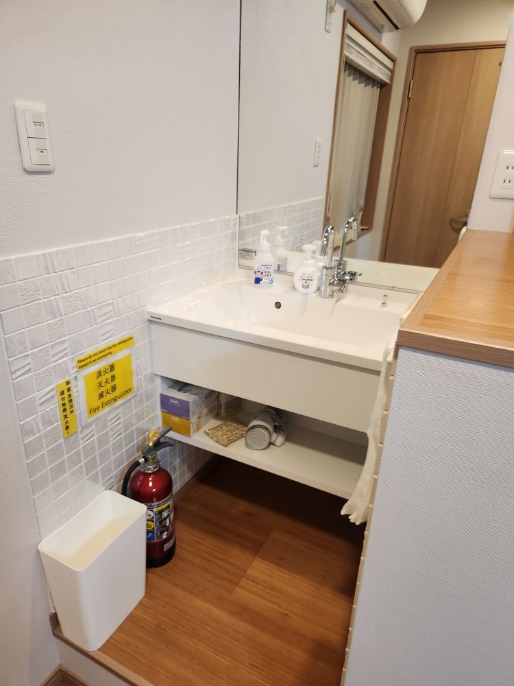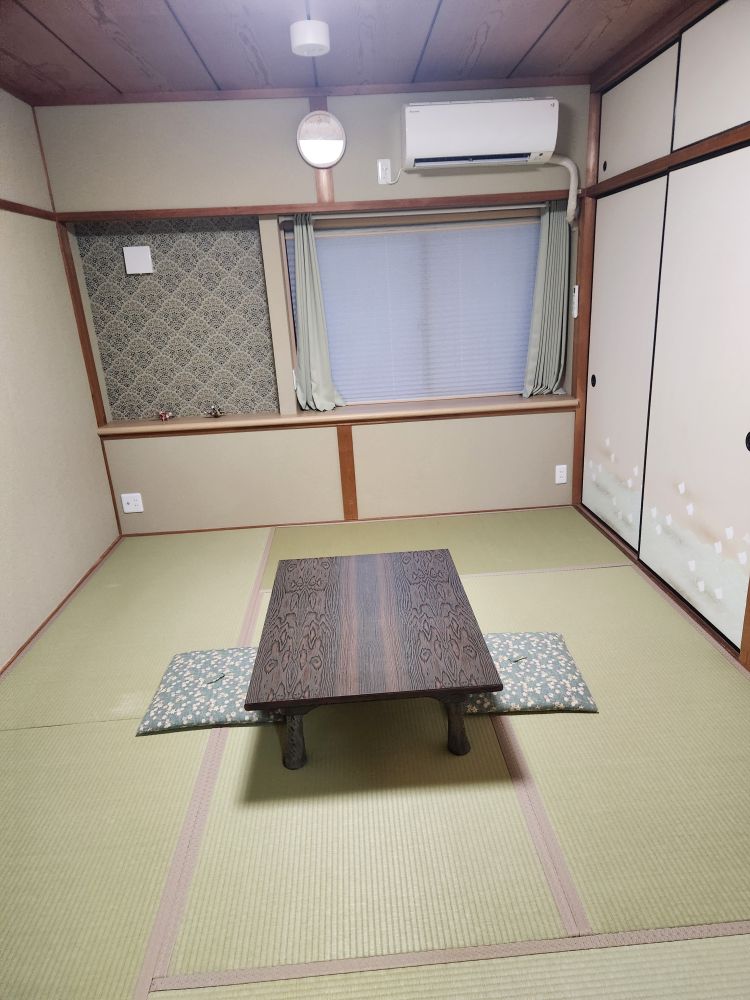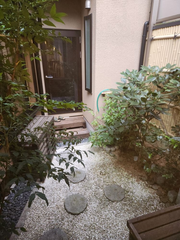 A sweet little garden outside along the hallway, then upstairs where there are 2 rooms – 1 tatami sleeping room and 1 traditional bedroom with a bathroom and sink area.
