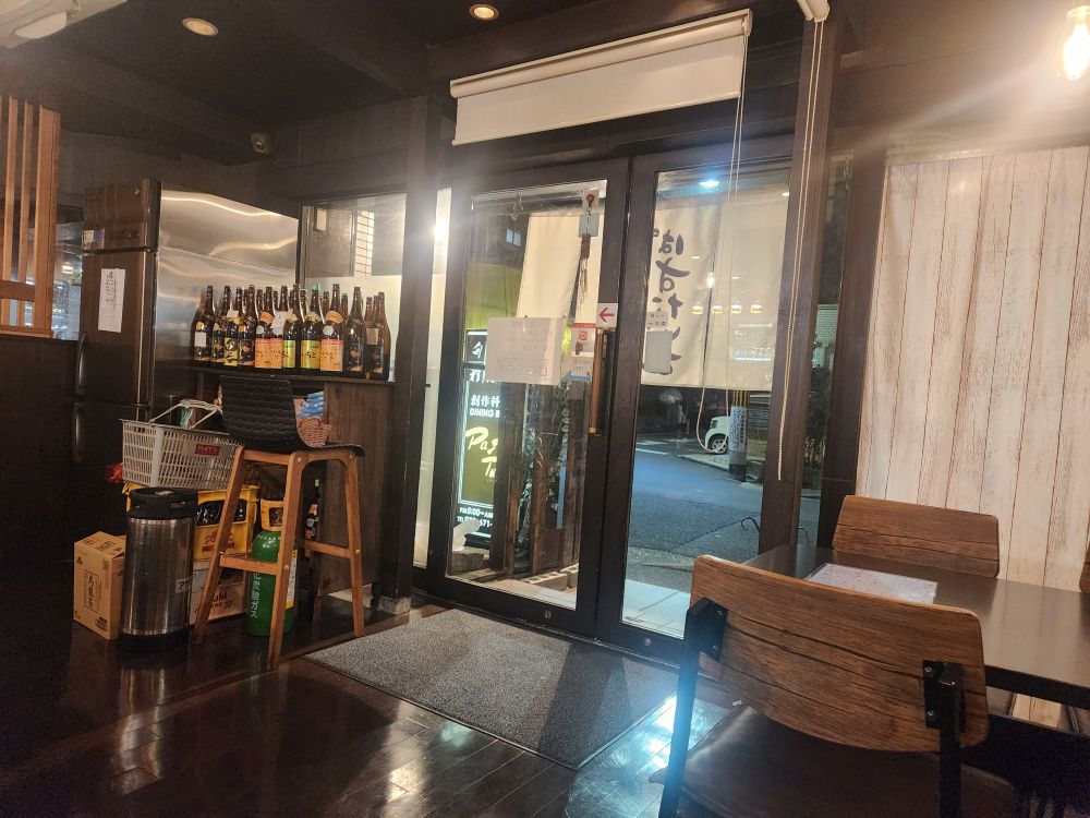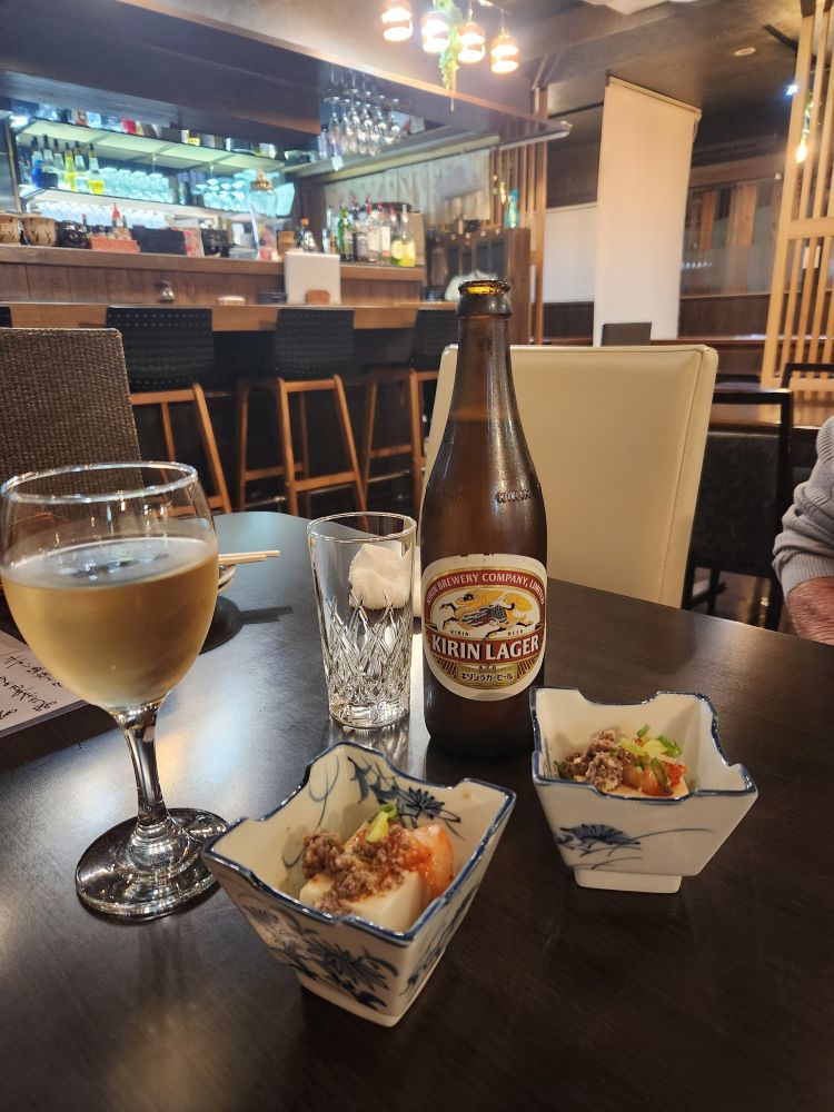 Moving onto dinner, Takashi has told us there aren’t many options in this area and we should eat our dinner while we are out, before returning to the house. That doesn’t do us much good tonight, although he has pointed out a couple of places, one being Mr. Gyoza. Gyoza – we’re in! Navigating our way to the restaurant, we stop at the Lawson’s for supplies, including the $2 bottle of Suntory wine (the beer and coffee drink people – that turns out to be pretty darn good!) then walk up the street only to find a line 20 people deep at Mr. Gyoza. Bummer! We are not in the mood to stand in line for dinner tonight – it has been a long day, topped off with a restless sleep due to travel anticipation and early wake up call – and we’re just hungry and sort of tired and want to go back to the house. Fortunately, there is a restaurant across the street called Pastimes. And it is blissfully empty. Game on!