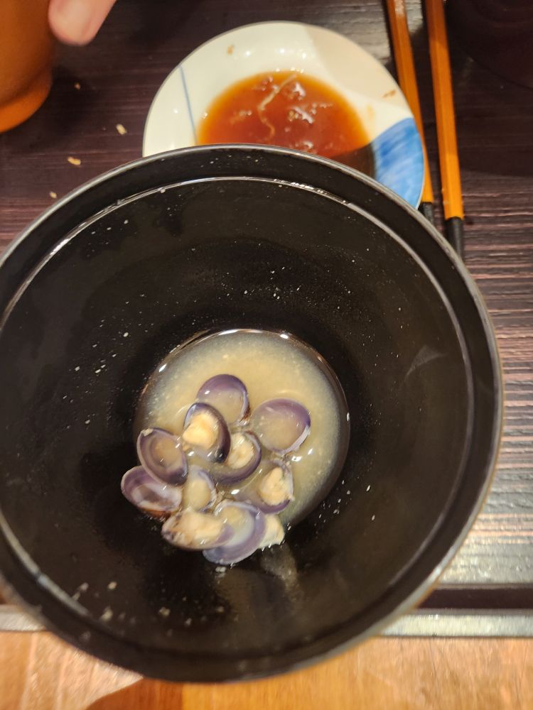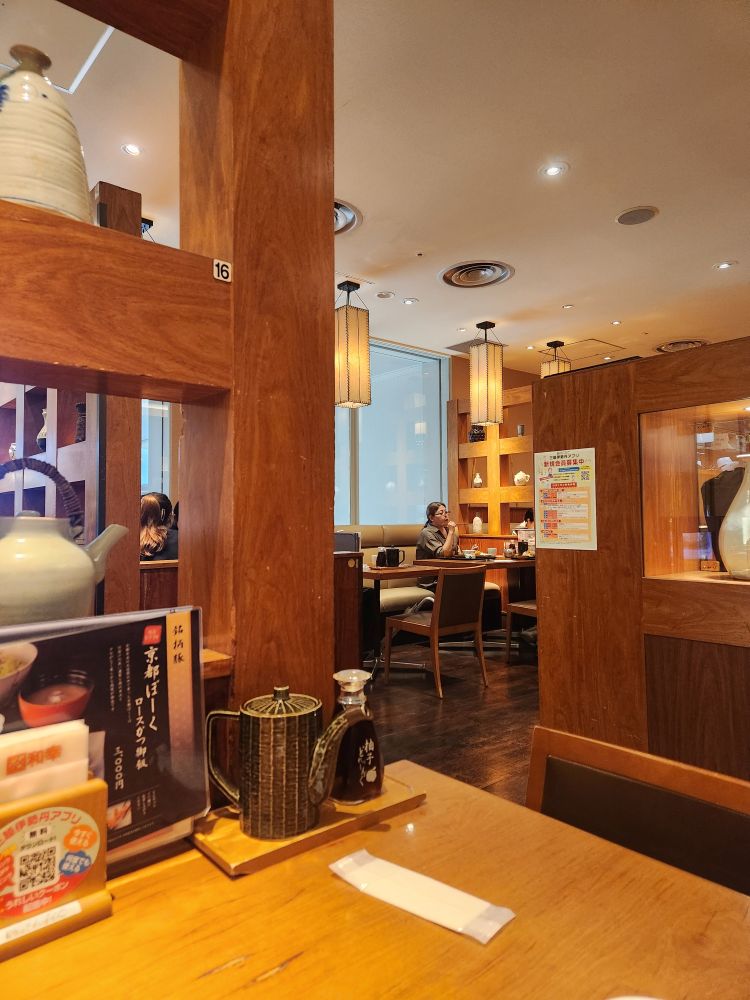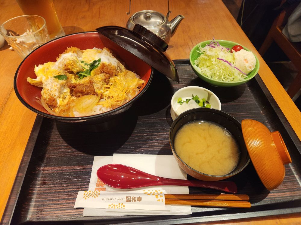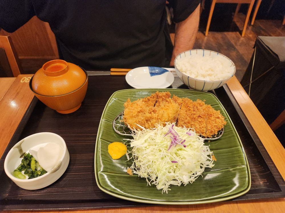 After a while, we rousted ourselves and took our weird shower – not in the bathtub, in the middle of the bathroom under the shower head! – and walked over to the Train station for lunch at Tonkatsu Wako, an awesome Katsu (fried) restaurant that Takashi had recommended. The food was fantastic. We had Hirekatsu Don, which was 2 pork cutlets on rice with an egg drop sort of soup over it – but not a runny soup, this was thick and almost like a thick sauce, as well as Yambuki, pork katsu with crab croquettes. Excellent. And the miso soup had little clams in it again. Ed had a blast – he had both his and mine.