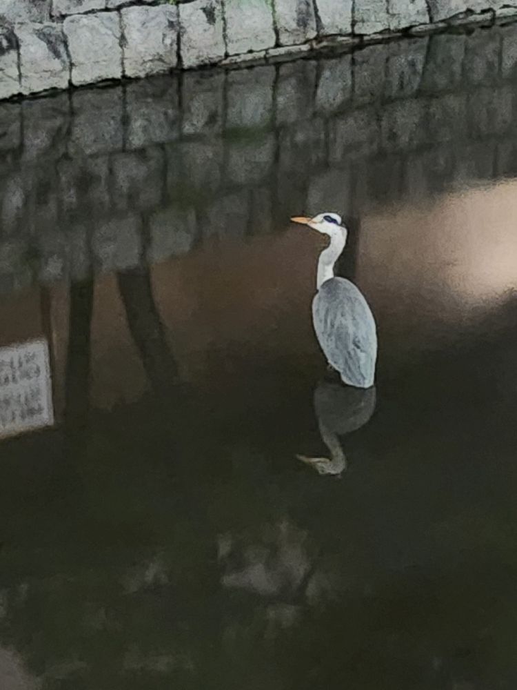 As dark settles in, we head back out onto the streets in search of a little restaurant across from the temple for dinner that we found on Google maps. We have to walk all the way around the temple – which is lit up and beautiful even from outside the stone walls! The Heron is also still hanging about, this time with a friend. Maybe they live here because no one else is paying the a bit of attention, while we are going nuts with the pictures!