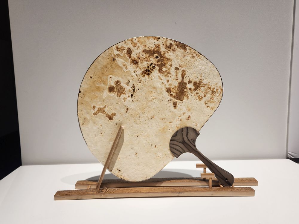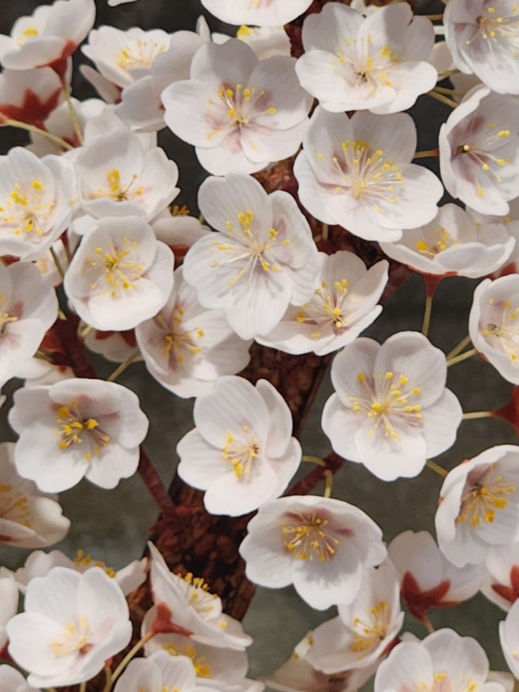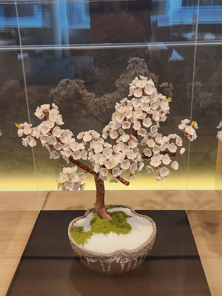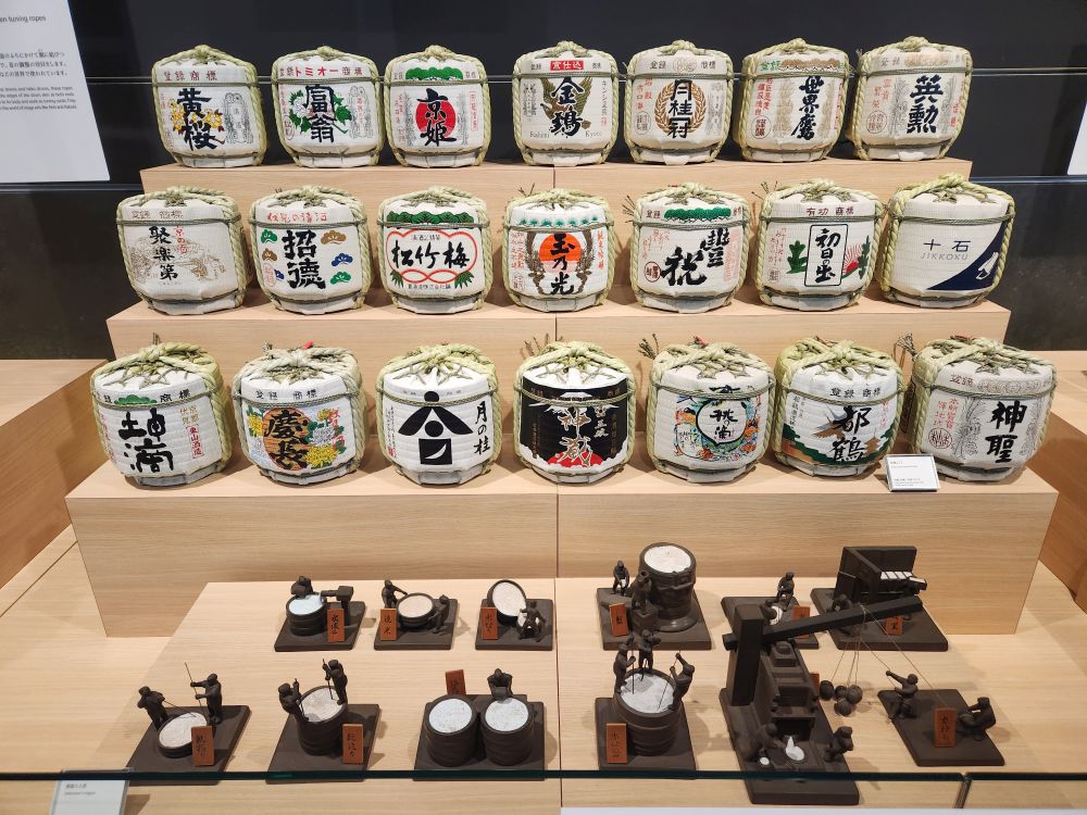 Fans (did you know folding fans were invented in Japan in the 9th century? Before then it was only round fans – which still are viewed as lucky talismans and stylish for everyday use), dyeing techniques (fascinating to us, not boring you with them here), woven textiles, aforementioned braiding – and the contraptions used to do it! A sake display that has miniature workers brewing the sake, even a whole display about sweets – and how Kyoto residents love their sweets! Even a cherry blossom tree that is actually a cake. Really – that is a cake!