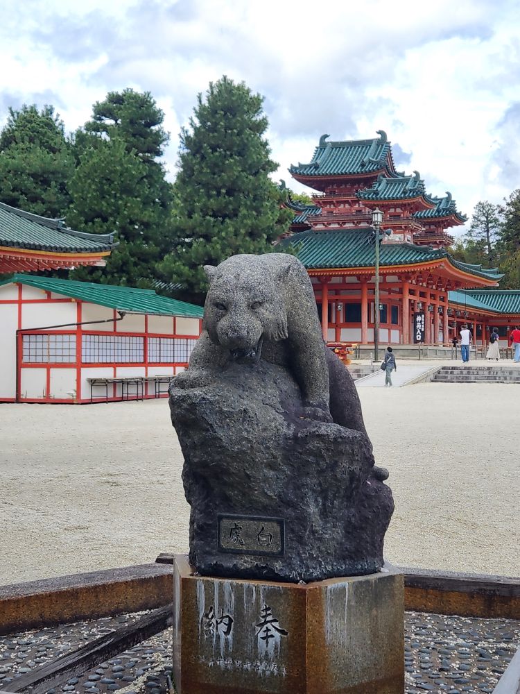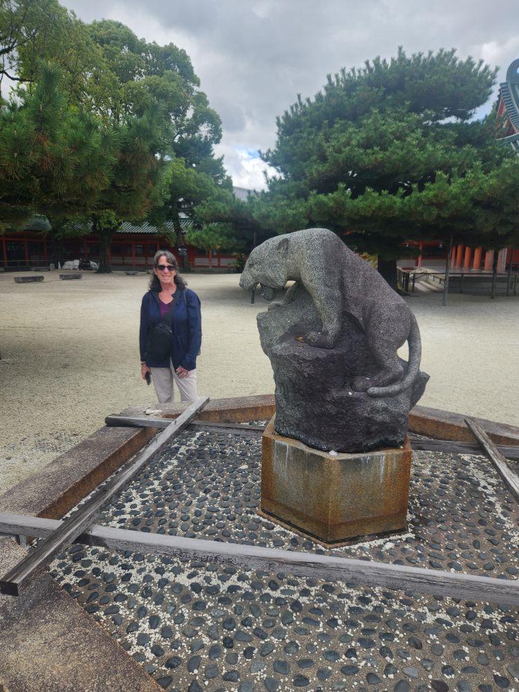 Then – bonus – there is a shrine right across the street – the Heian Shrine – a replica of the innermost sections of Heiankyo, the capital of Japan (Kyoto now) for more than 1,000 years before being moved to Tokyo. The shrine is being renovated, but the grounds are pretty, with interesting statues and lovely outer buildings. Also, what is calling to us, is a fabulous garden that we can explore. And of course we do!