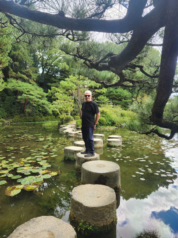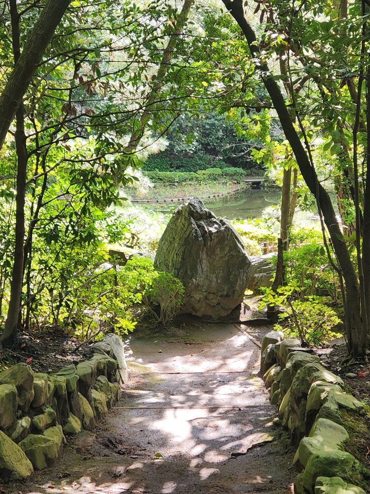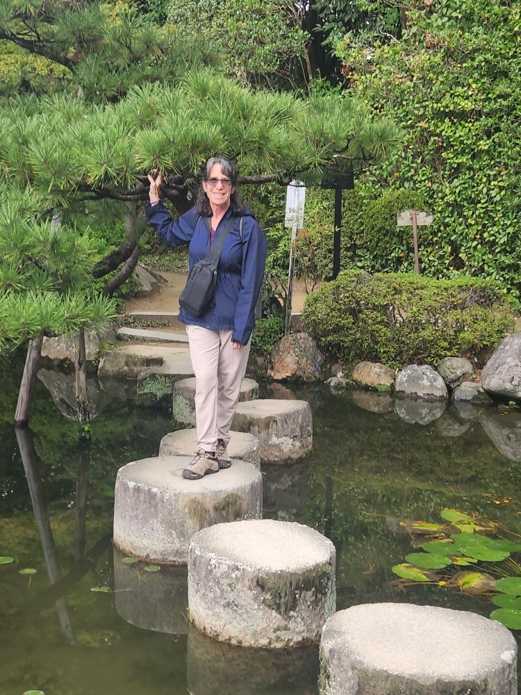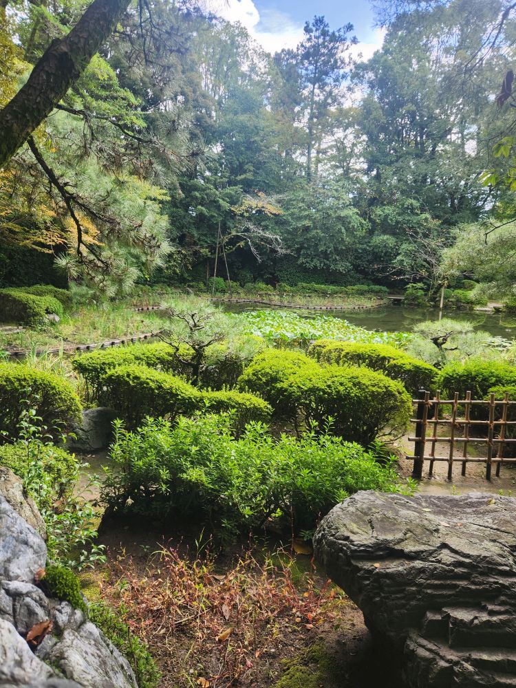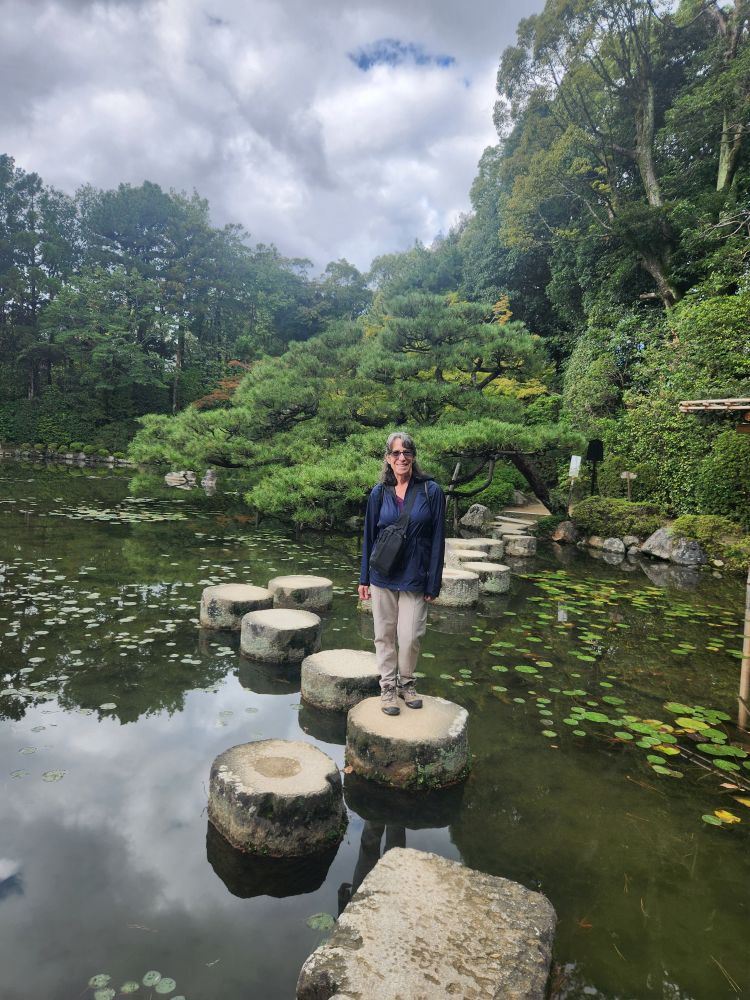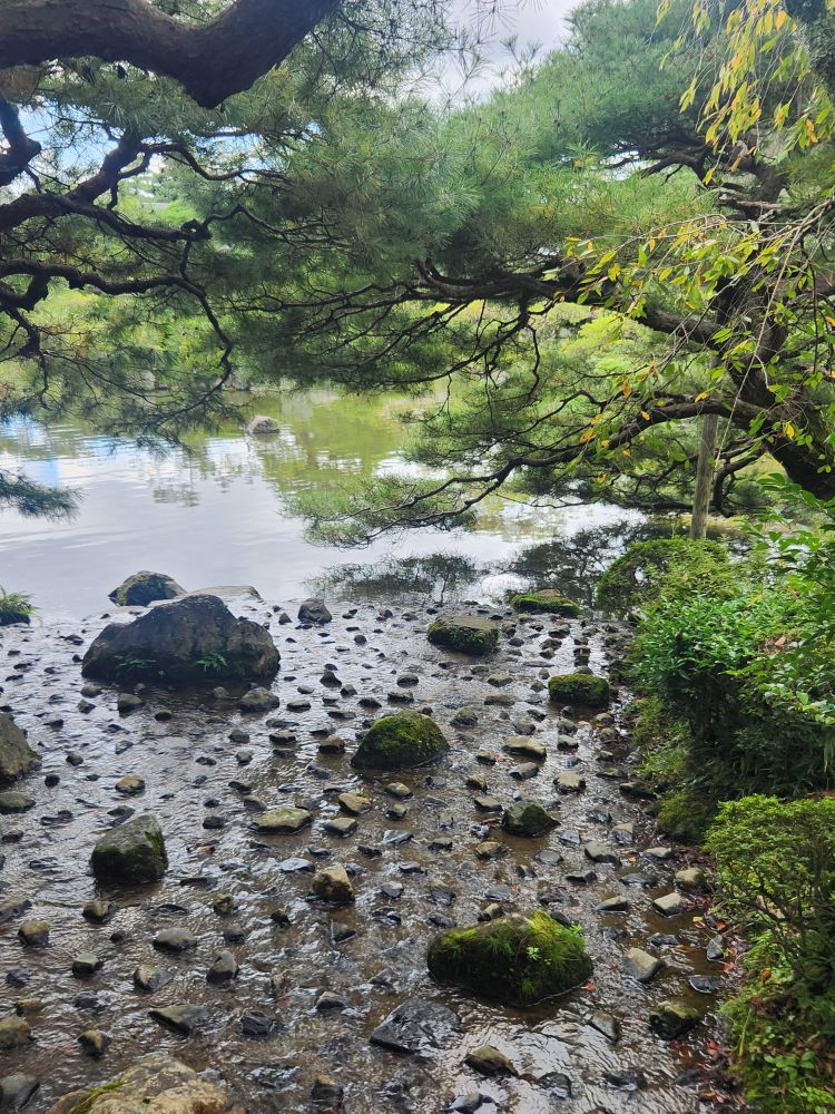 Not to mention the huge lake that we circle, with fabulous views of the rocks and the trees and the stepping stones called Garyukyo, which means hidden dragon bridge,” from the wandering path the stepping stones take across the pond.