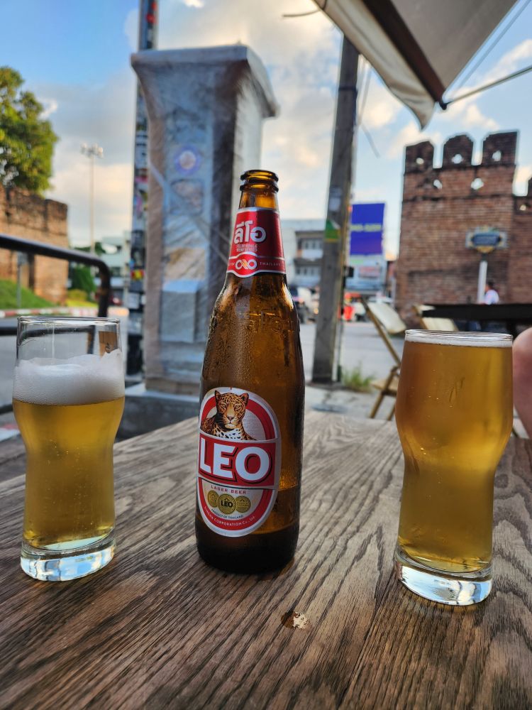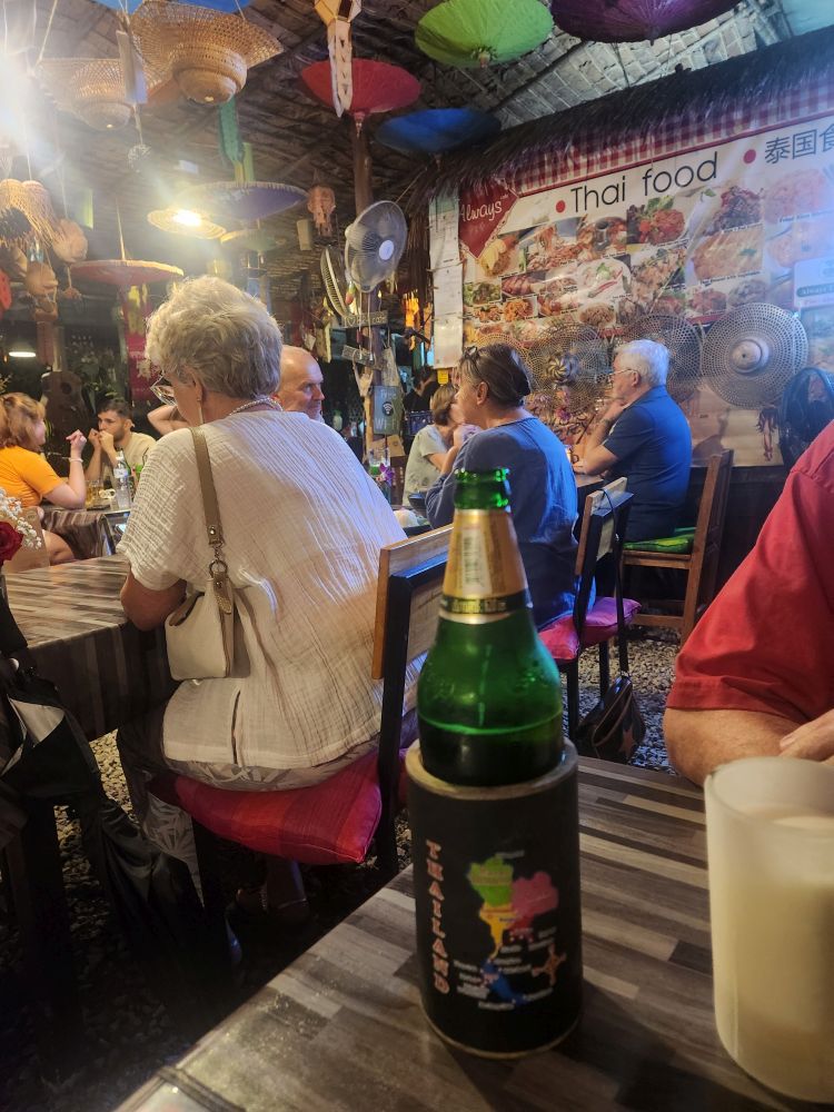 Afternoon walk, beer at the corner bar by the night food market, scrambled eggs, pork and cabbage for dinner, nighttime staying in – no Sunday Walking Street for us – we are happy as clams with no complaints. Day done.