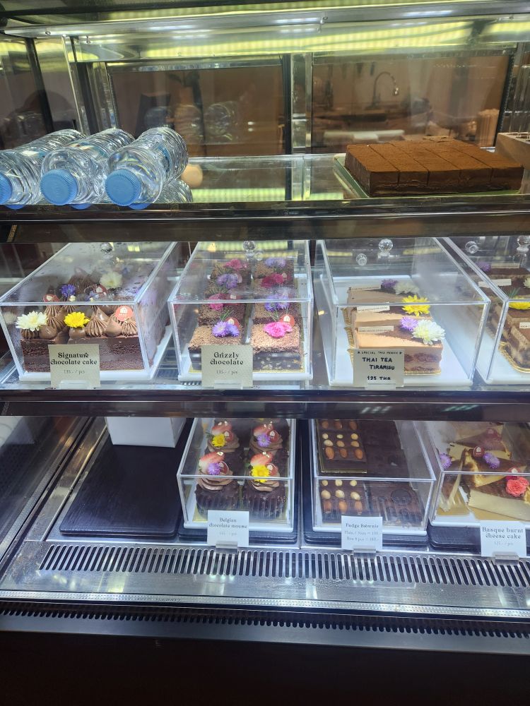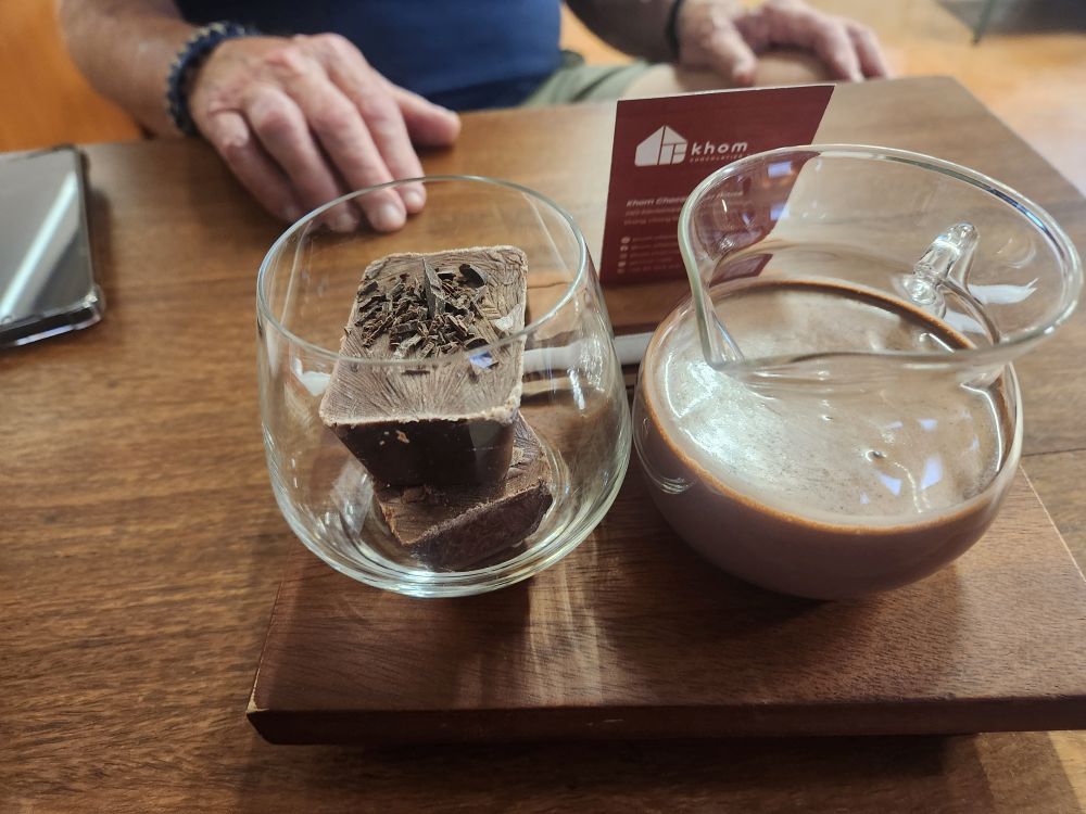 Lunch of weird, but good tasting, chicken bologna with the texture of liverwurst on our sandwich bread, then afternoon of blogging and reading. Back out for our afternoon walk, we stop on the way back at a newer place called Khom Chocolatier House. All artisan chocolates and gorgeous desserts, plus a wide selection of chocolate drinks – really interesting different drinks! We manage to suppress our desire for the over the top chocolaty desserts and instead I opt for a mixed chocolate soft serve cup, while Ed goes for the over the top double dark chocolate drink. Oh. Decadence! It comes on a board with one pitcher of deep, dark chocolate liquid, another cup with 74% chocolate ice cubes! And instructions! Pour the liquid over the ice cubes and swirl to melt. The richest, creamiest, chocolaty-ist thing you have ever had.