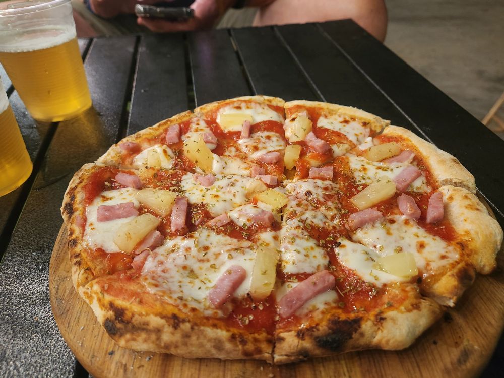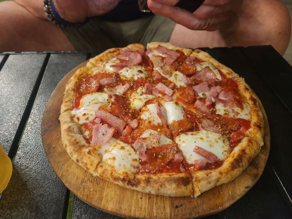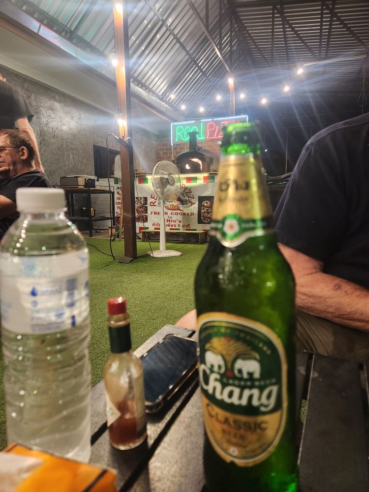 Tuesday 11/5 – Same, same, no different. Park, Sepak Takraw, coffee at Minimal, walk home. Salad for lunch as the rain pours down. And down. And down. All afternoon. No walk for us this afternoon. Finally the rain stops and we take advantage to go to Real Pizza – a “BBQ” fired pizza place that opened up in this garage type area on Prapokkloa Road. Run by a husband and wife (he a Brit who has lived here for 29 years, she a local Thai), they have a big stone oven set up in the back where they bake the pizza – one at a time – and a little seating area, under cover, of fold up tables and chairs. Sweet. We each order a pizza – Hawaiian for me, Meat for Ed – and have a wonderful meal with leftovers for lunch tomorrow. The most expensive meal we’ve had here – relatively speaking of course – each pizza was about $7. At home – that’s a bargain. Here? Well, it was a bit overpriced, but it is just the 2 of them and it is a really cool kind of concept – and it was good pizza! So all is well.
