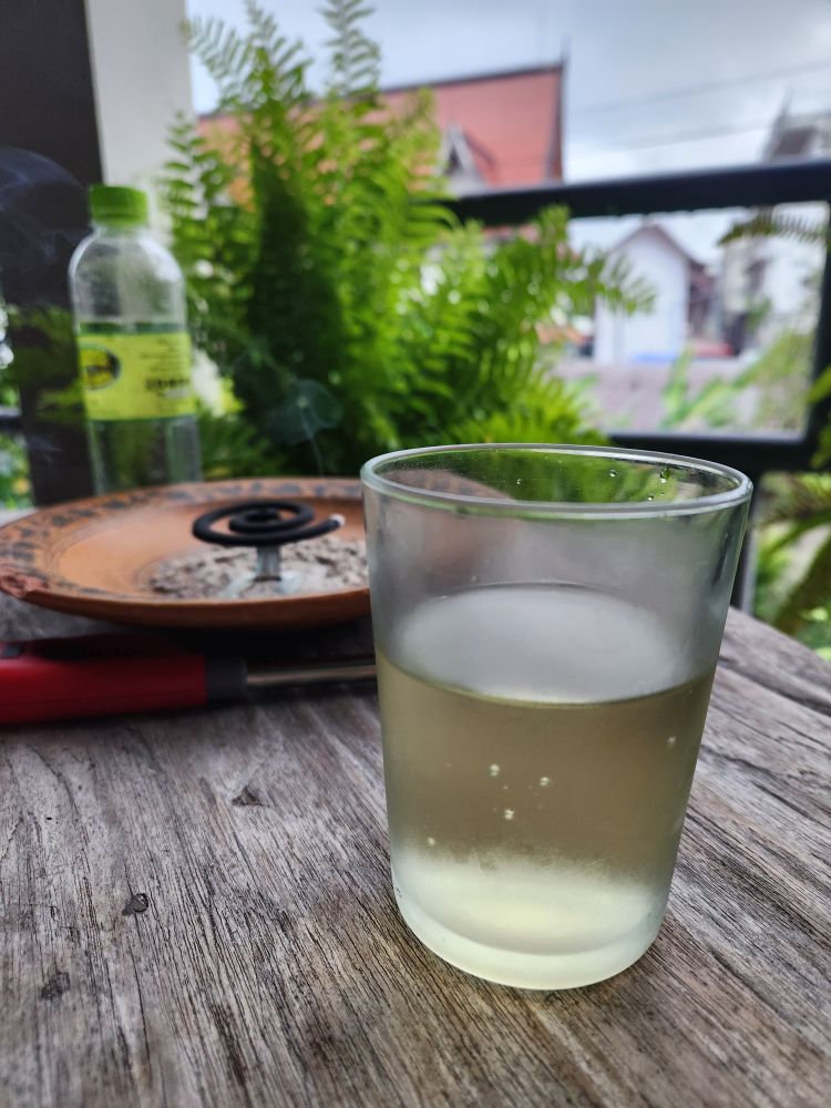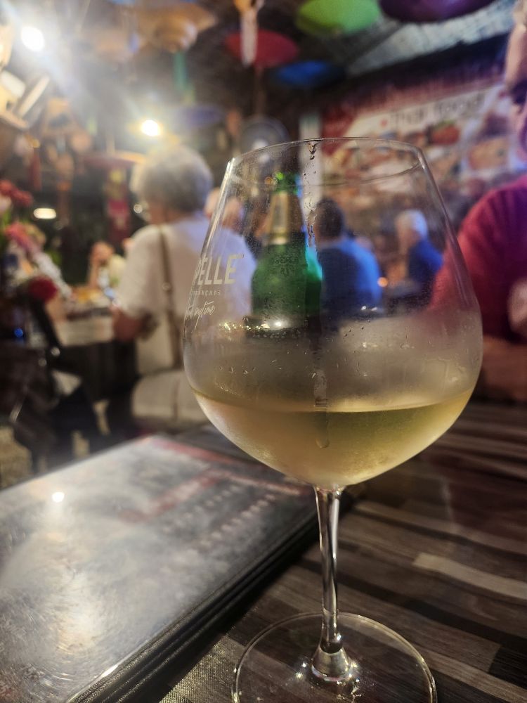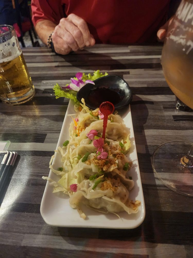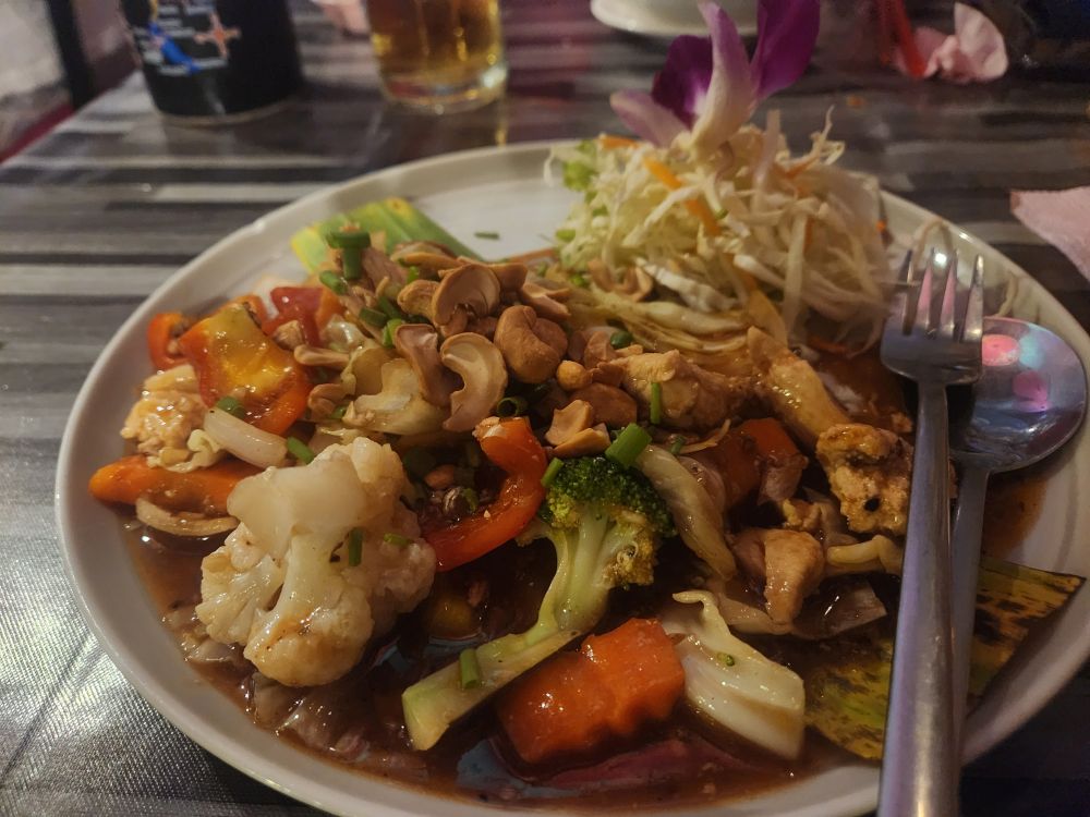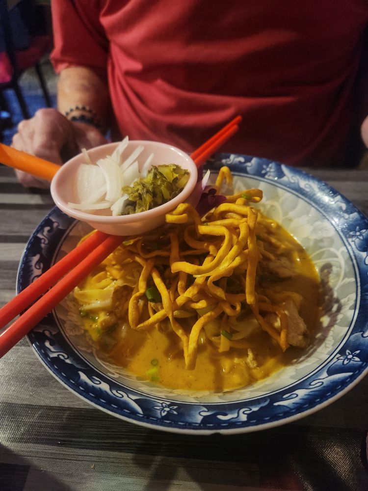 In the evening, in between raindrops, we breakdown and decide to go to Always Thai, the rip off wine place. The food there is great – we know because we had lunch there last time – so ok, we’ll deal with the rip off wine cost. Managing to get there before the rain begins, we snag a great table right at the front and settle in for Thai Gyoza (spelled guyza) along with our beer and small pour of wine. I can sip slowly. Our main course arrives – fried cashew chicken for me, Khao Soi for Ed – and we dig in, happy little campers.