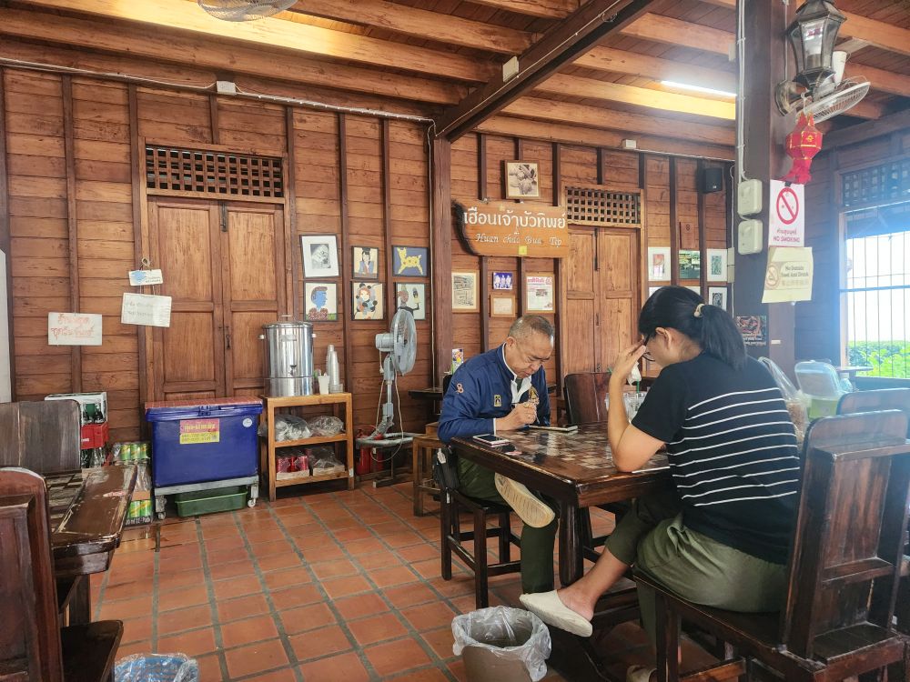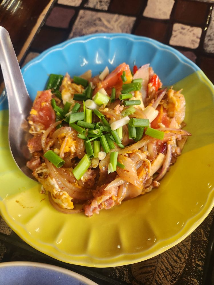 The Sepak Takraw games are more animated this morning, with a girl video taping and then pictures of the team at the end. A tournament maybe? Conference finals? We’ll never know – but the games were very spirited. Coffee at Minimal, back to the house, hanging out through the rain. It clears enough for us to run out for lunch, today at Huan Chao Bao Tip, the Northern Thai place in the old wooden building on the road a block or so from the house. Excellent Northern Sausage scrambled with eggs (although not as many eggs as we had thought – or as the picture showed), yummy papaya salad and more gyoza. Perfect afternoon meal – and we manage to avoid the rain.