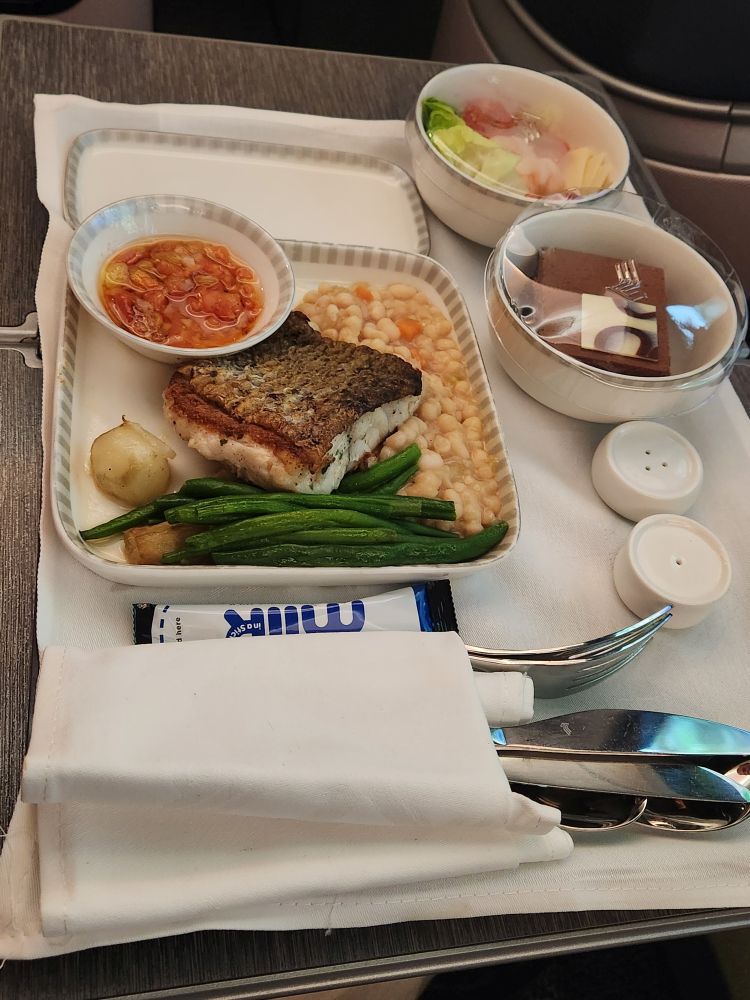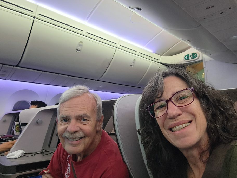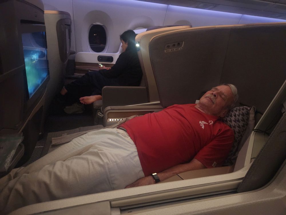 At the appointed time, we head to the gate and board our plane. Then make ourselves comfy for the night. Good decision skipping the meal too, because there is turbulence and the cabin service doesn’t start for a long, long, time. I’ve already got the bed out and organized before the attendants are even allowed to leave their seats! (I did get chastised for getting up to open the bed – seat belt sign and all! Oops, sorry!).