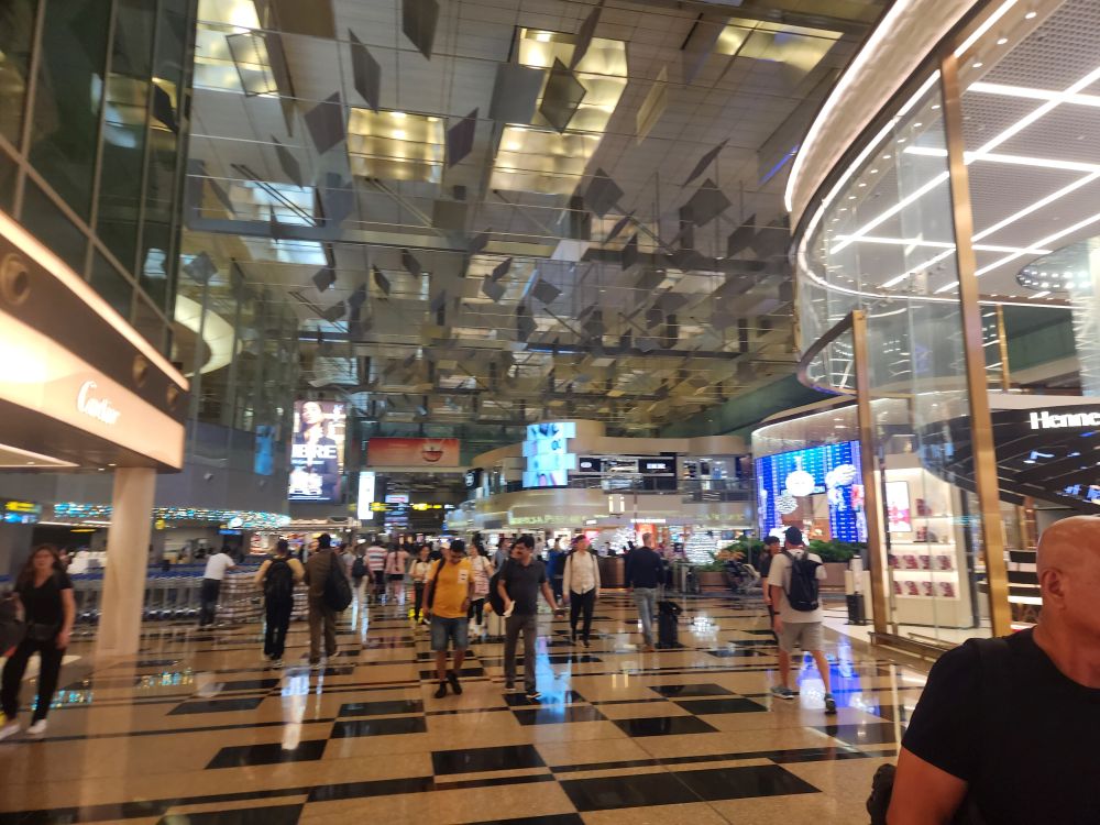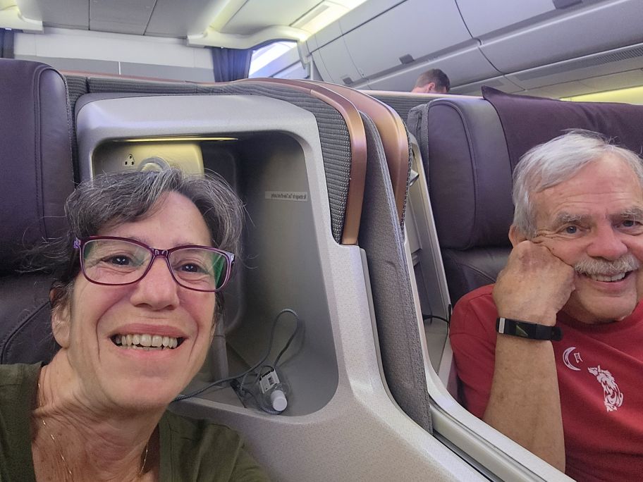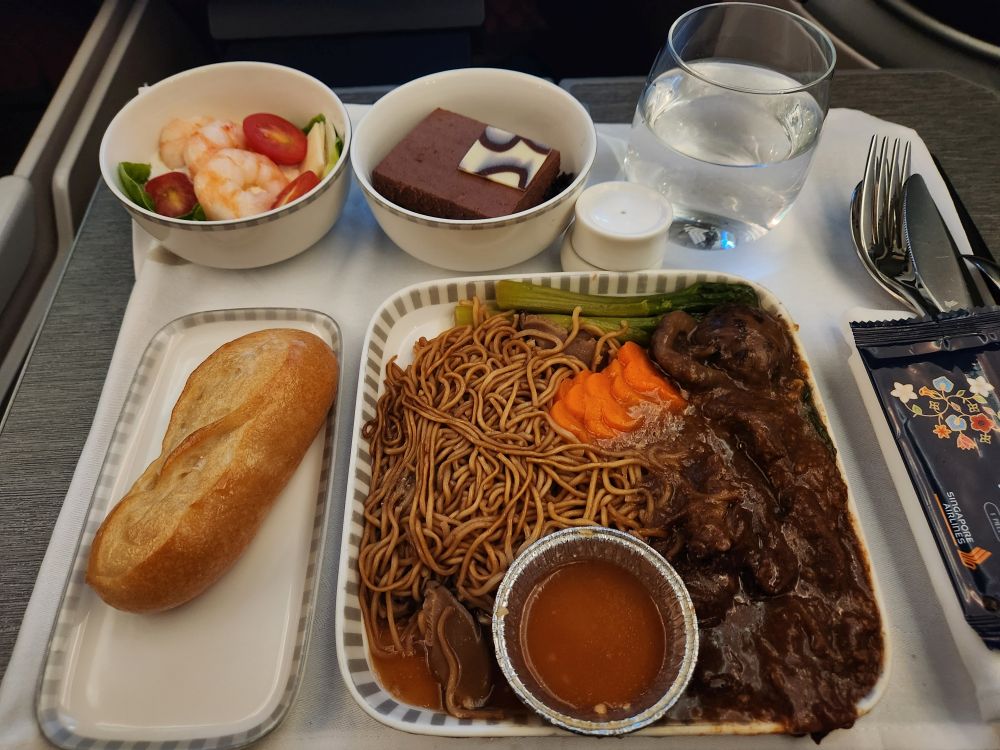 Lounged out, we head to our gate and hop on our ride to Singapore. Another quick flight – only 2 plus hours – with a full meal there too. Ed has the fish, which is good, I have the beef and noodles which is not. The noodles are great, the beef that icky stew consistency. Yuck. But, really, after all our lounge snacking, the noodles are just fine for me – and the accompanying bread, salad and brownie cake dessert are excellent.