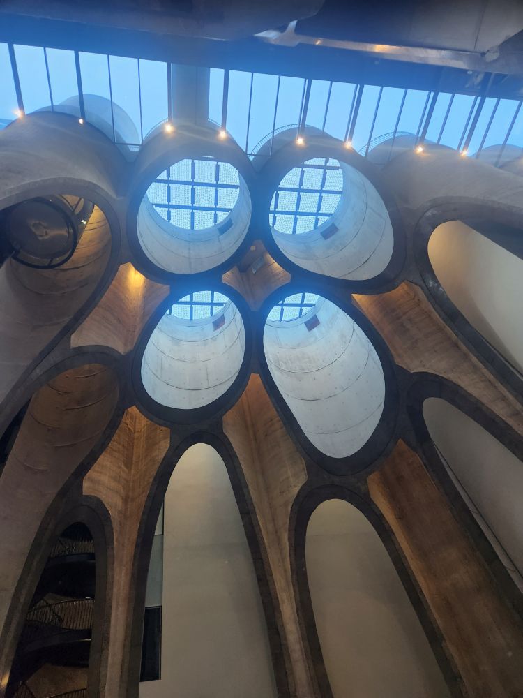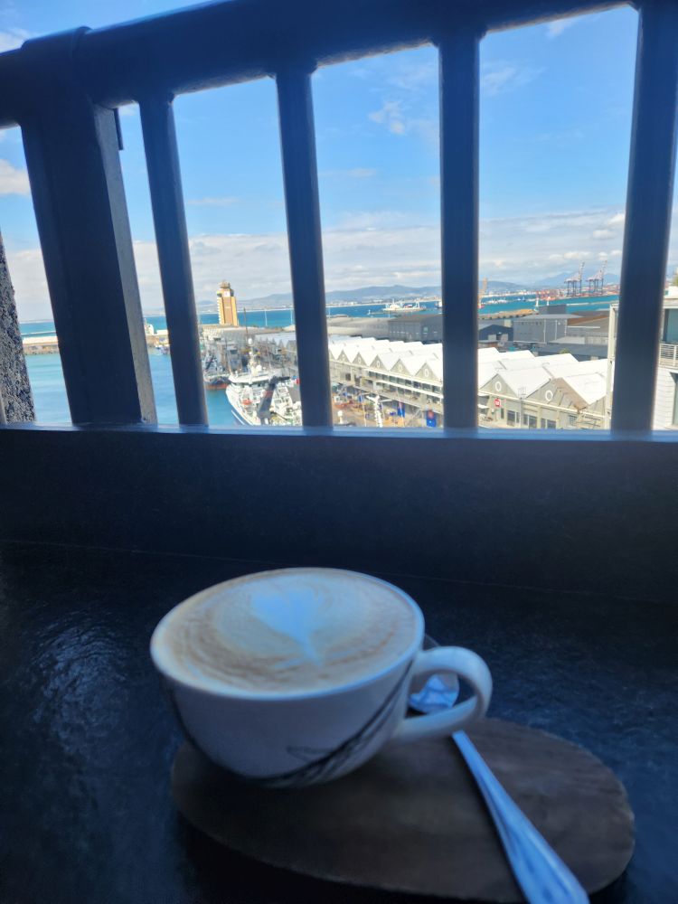 It is still early – only about 3pm – so we decide to go to the Zeitz MOCAA, the Zeitz Museum of Contemporary Art Africa. We have walked past this place innumerous times and never once thought of stopping. Duh! What a find. The museum is housed in a century old repurposed silo with an amazing history all its own. The first 6 floors are art exhibits, dedicated to preserving contemporary art from Africa, on the ground floor is an entire exhibit on the history of the building and the floors from 7 upward above were added on as a hotel, which make for great optics. We start on the top floor, stopping at the café for a cappuccino with the best view. A nice little stop to get us caffeinated up for the rest of the afternoon.