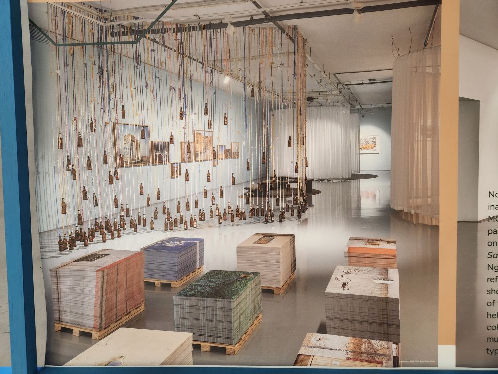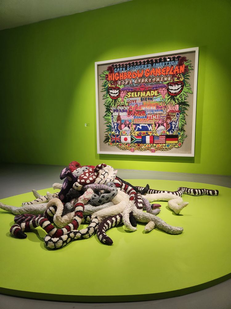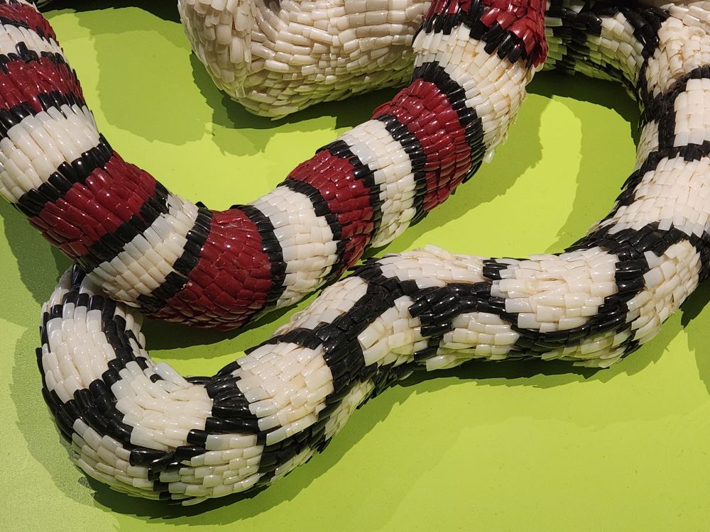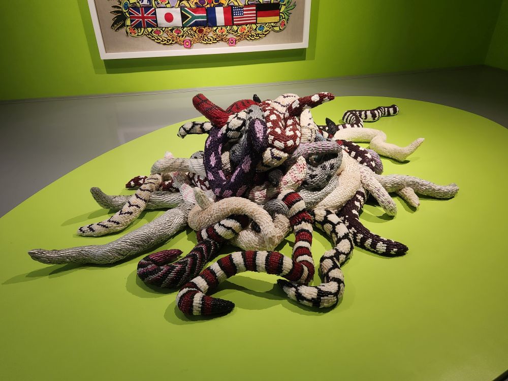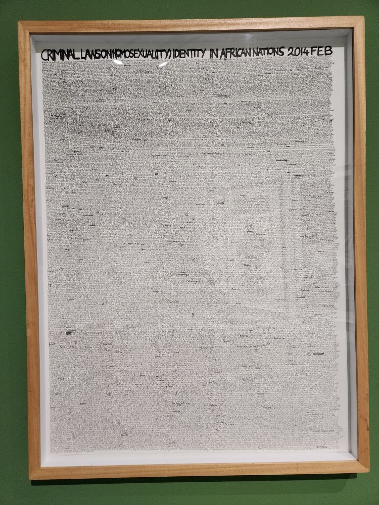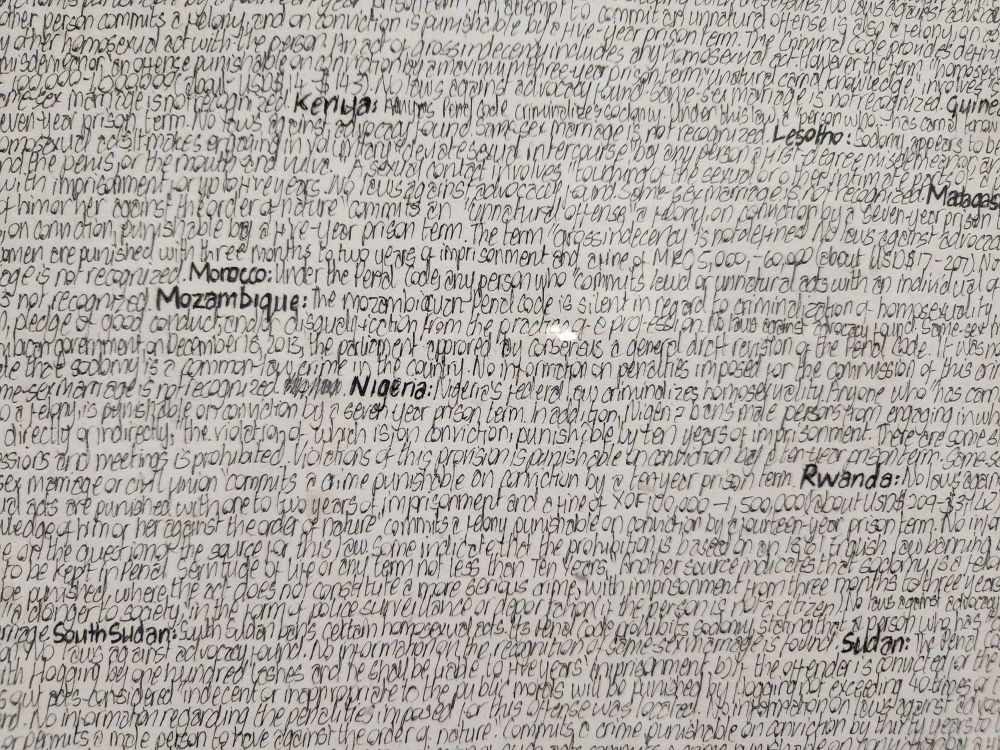 There is a great collection called Selections – which is basically a smattering of different artists pulled from the MOCAA Permanent Collection. Works focus on LGBTQ+ issues, some great representations of apartheid or at least Black repression – I’m particularly drawn to the Criminal Laws on Homosexuality Identity in African Nations – all written out in tiny cursive. There is a bizarre cow tail sculpture hung from the ceiling, a very appealing tree sculpture/painting combination and maybe most bizarre of all – a snake sculpture made entirely out of acrylic fingernails! I kept looking at it, thinking, nah, that can’t be fingernails – and then when I went to look at the description I just guffawed. There was a museum guard right there and he just laughed and laughed at my reaction. Shaking his head in agreement the whole time. Too funny.