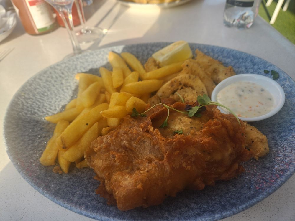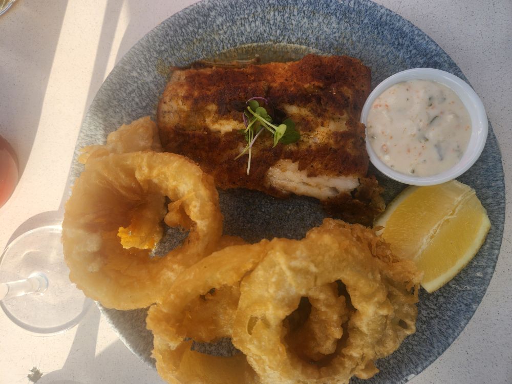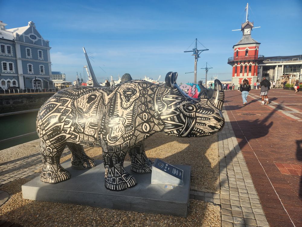 We stayed until almost closing time, which meant it was close to dinner time now. We decided to just stay at V&A and find some place to eat. Bypassing Kapstad Brewery where we often frequent, we wandered around a bit, but then settled on the Cape Town Fish Market, on the ground floor below Kapstad. They had a special on Hake and Calamari that caught our eye, so we grabbed a nice table outside on the patio and dug into a fantastic meal of the aforementioned hake (massive portion) and calamari (most tender calamari we have ever had!) and a huge piece of sauteed kingclip with onion rings. Fantastic! Not to mention excellent wine pours and great beer. Sitting in the sunshine on the patio by the water. Nothing much better than that.