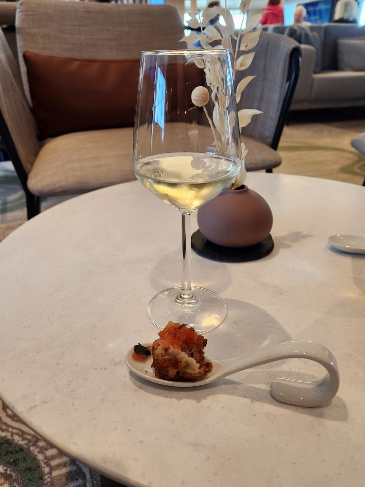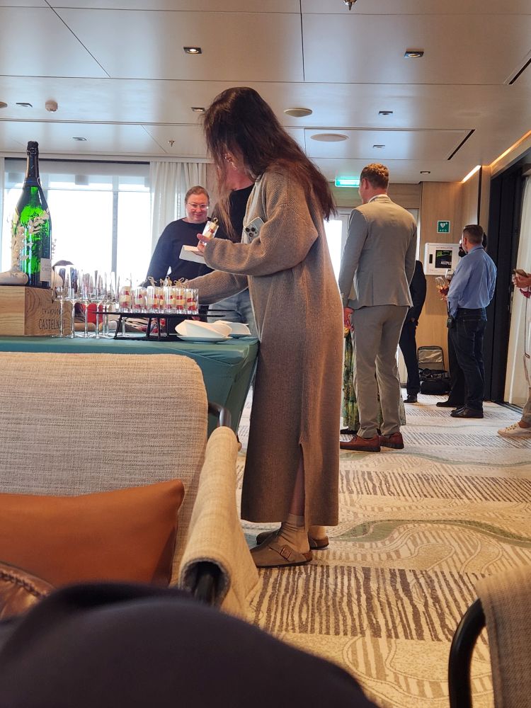 And that was it for the rest of the afternoon until the captain’s welcome and introduction of the staff. That was very nice with champagne and passed canapés. Including these tempura salmon spoons. Nice. Ok, and yes, the weirdly dressed Asians. Is that a blanket she has on? Sorry – I could not resist.