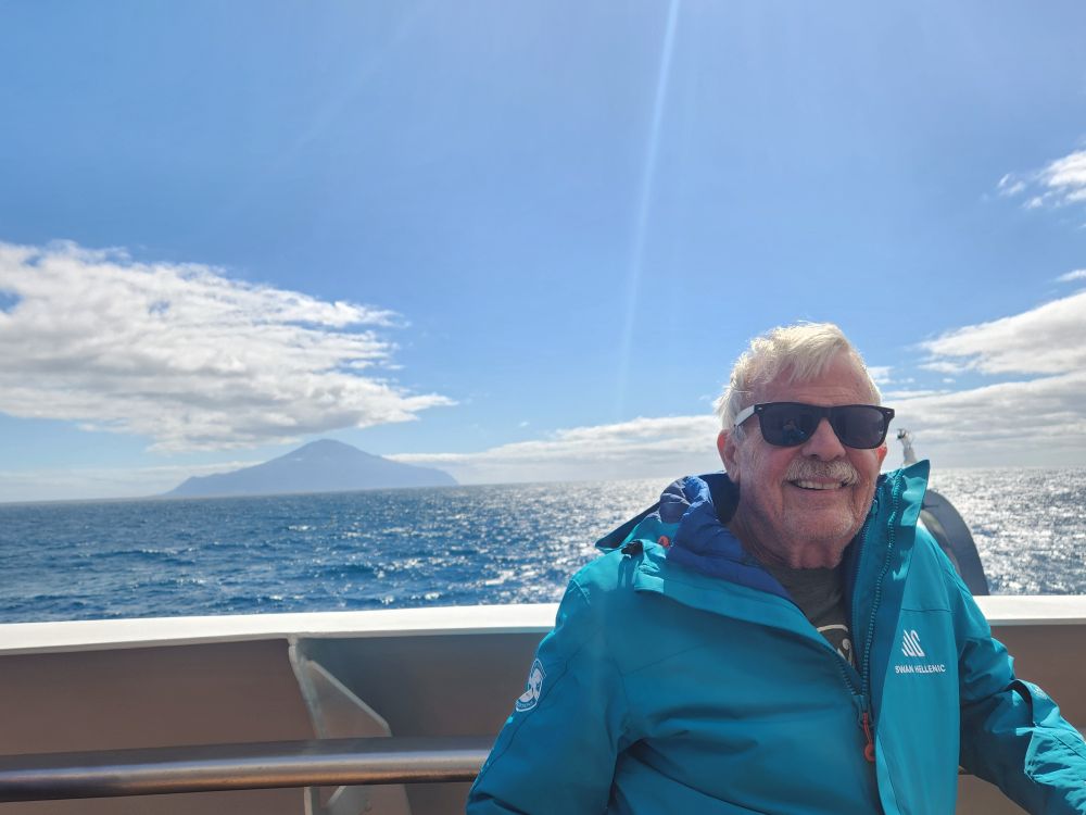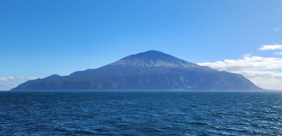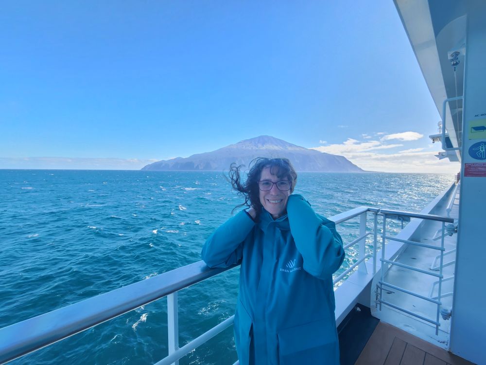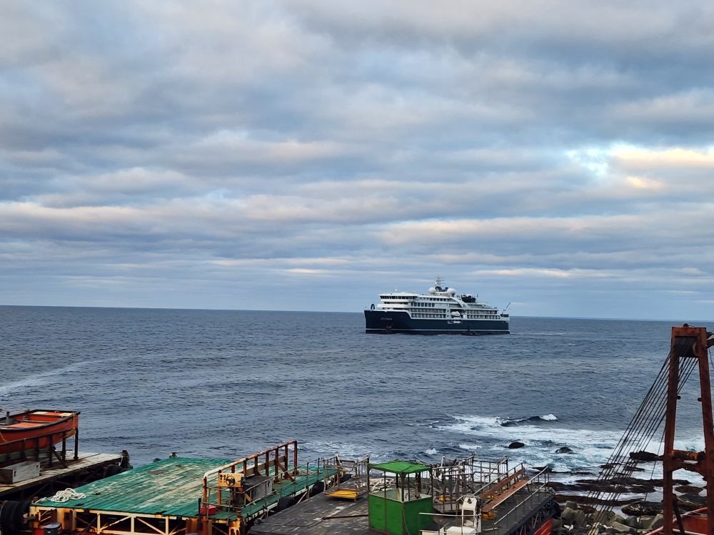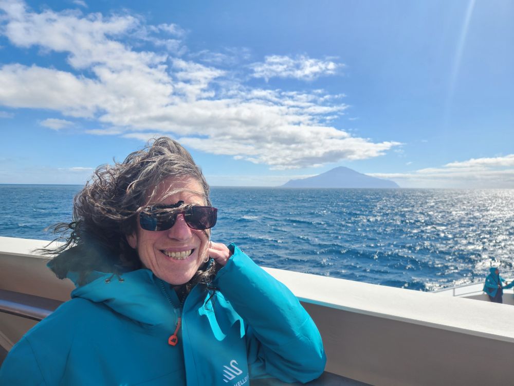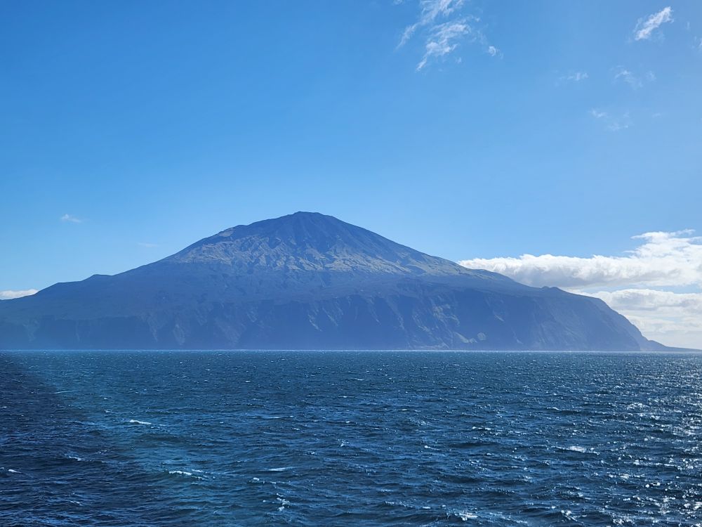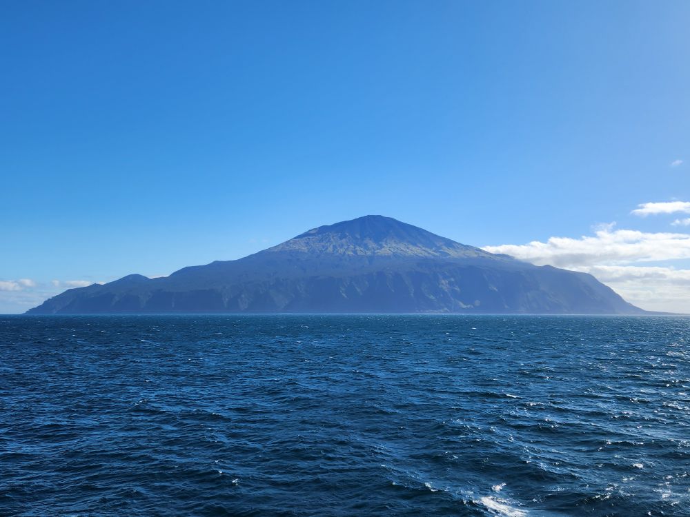 After the movie, we hit the bow of the ship for more photos of Tristan, growing larger and larger as we approach. The terrain is rugged and rocky, and the peak of Mt. Olav, the volcano, looms over us as we approach.