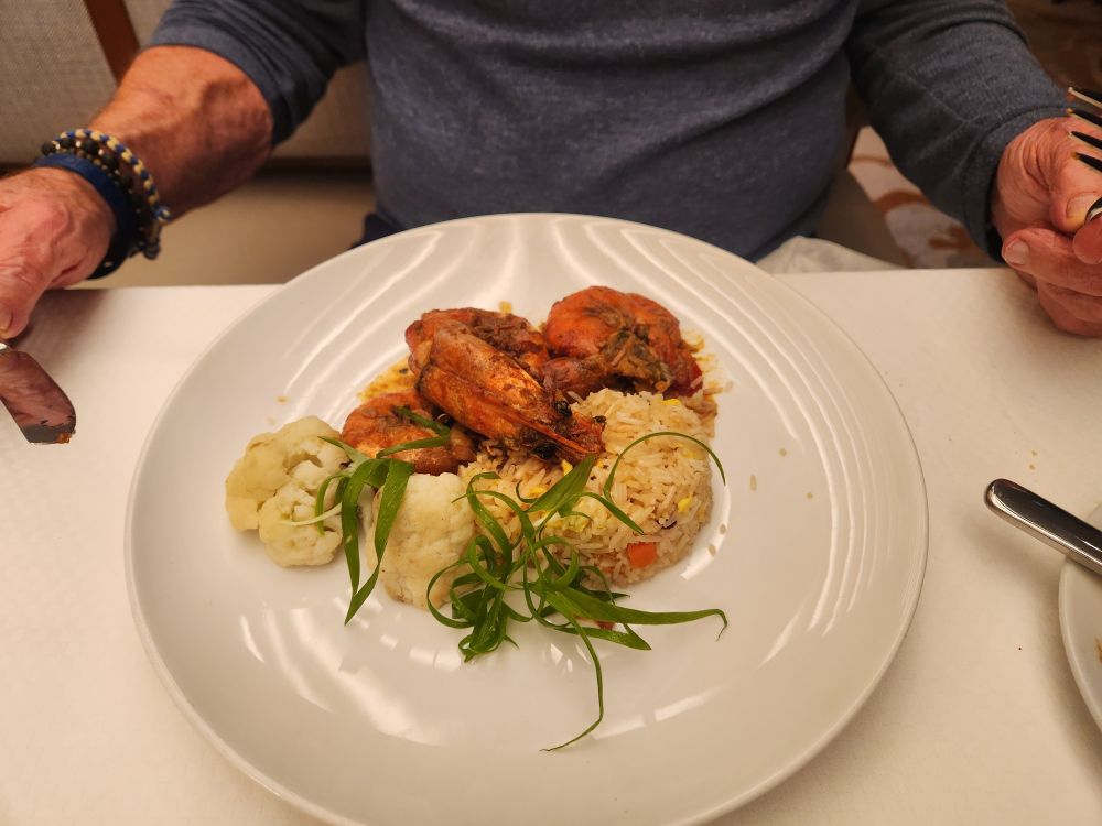 Quickly drying off in the cabin, we headed to the dining room where our sweet John has been reassigned to another station. Now we are sitting with Ramil, who is equally sweet and fun. More shrimp tonight – those things are just monstrous – and lamb chops for me. I already had my appetizer of Rock Lobster!