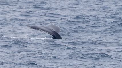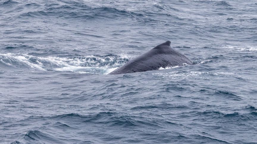 Laundry completed by 7am! Now we are completely handled for the rest of the trip – clean undies, socks and sweats – because really, what else have we been wearing every day? Nothing but lounging clothes and it is so cold now, we’re definitely not sweating through anything. Then it is breakfast and a day of leisure….seriously leisure. There is nothing on the schedule but wildlife and seaweed survey from 9:30 to 11:00, but it is so foggy and misty out there, you can’t see a thing. There were reports of a whale out there, but no one got any photos, so the general consensus is that it didn’t happen. LOL. Except that Gennadiy has pictures….so…there is that: