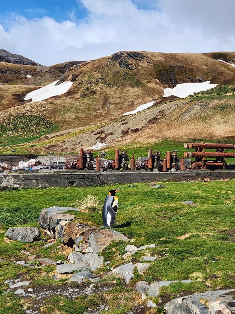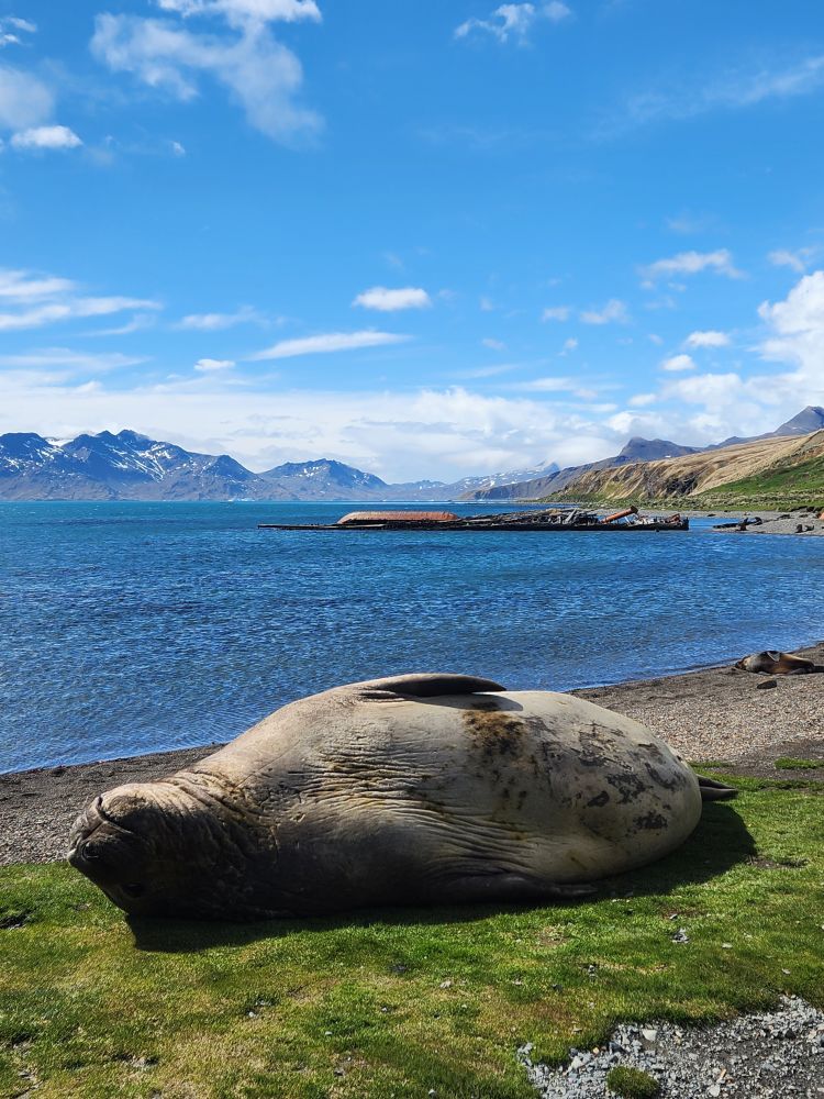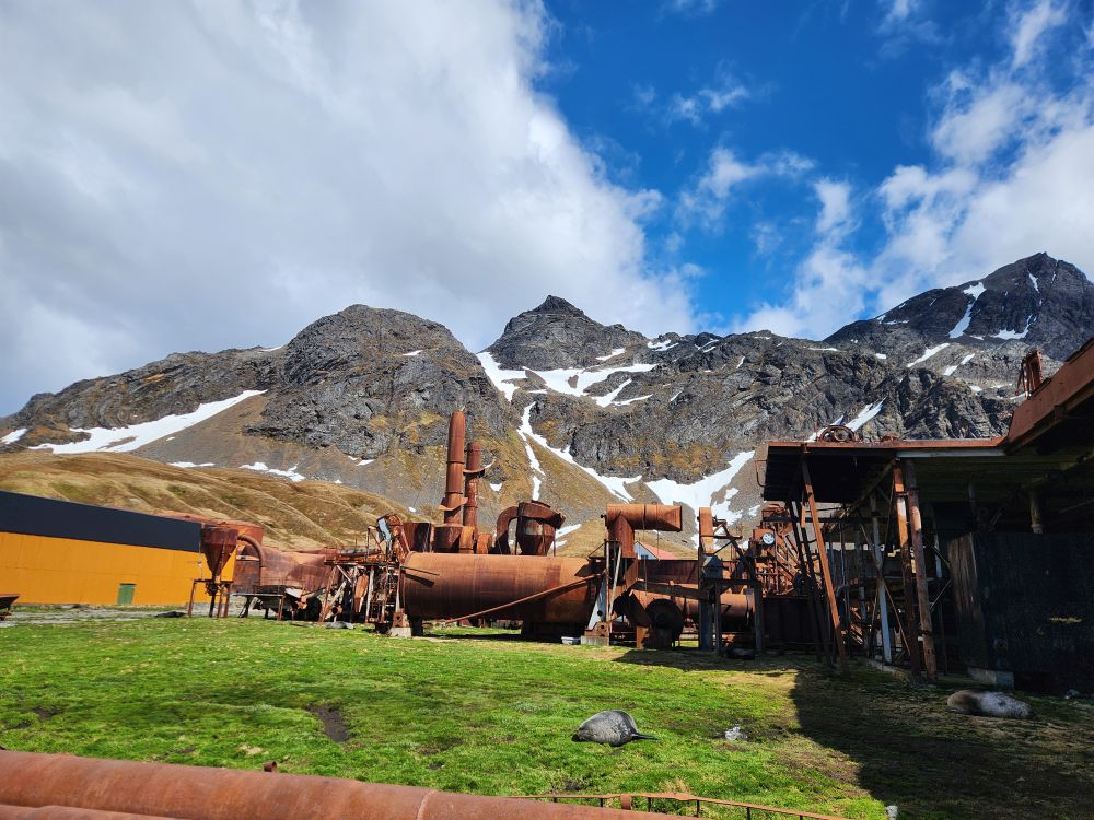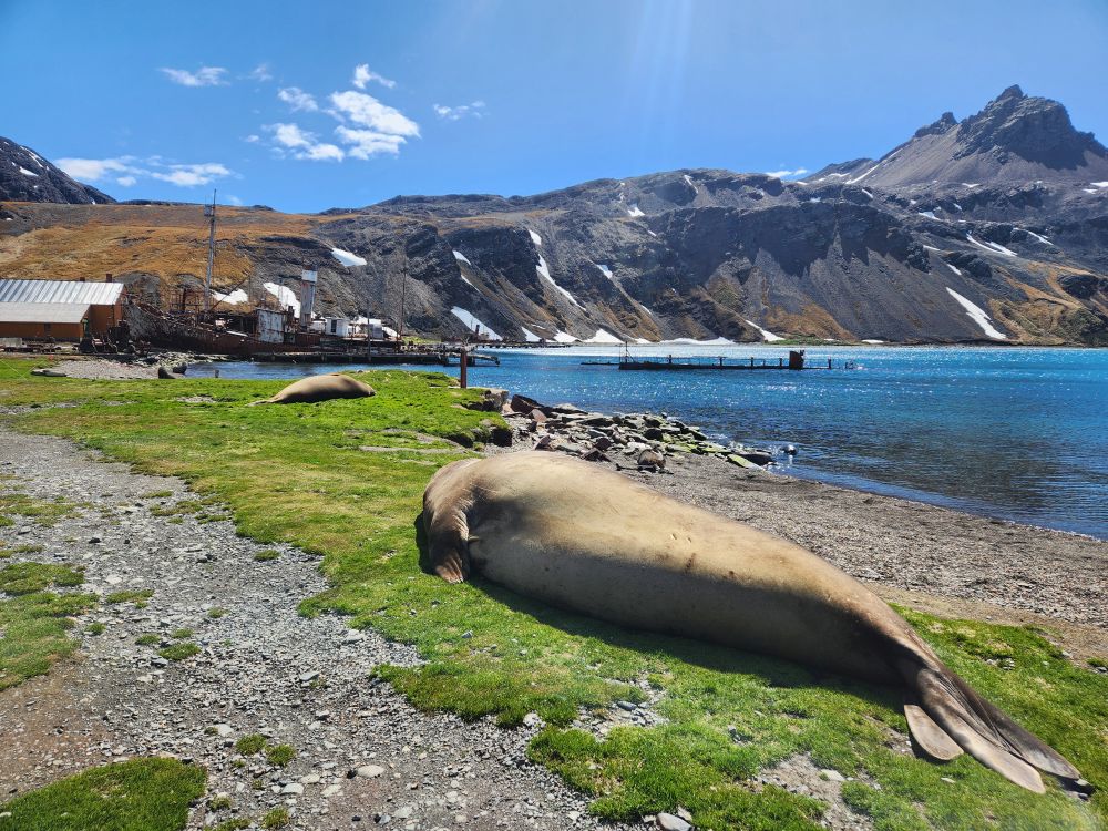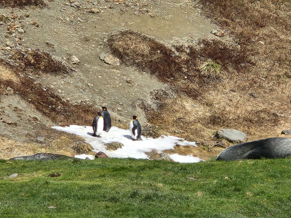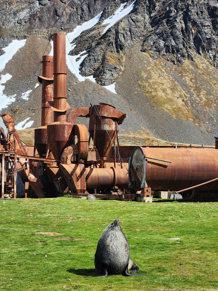Back through the seal gauntlet we go, weaving our way around gigantic elephant seals and little – on a relative scale – fur seals. The fur seals are actually adorable and make the weirdest snorting and crying sounds. All of them are weirdly cute when they sleep – although we always remember that when they are awake, they can be decidedly not cute! As we walk back toward the abandoned whaling station, we even spot some penguins in the distance cooling off on a little wedge of snow nestled up against the slopes.