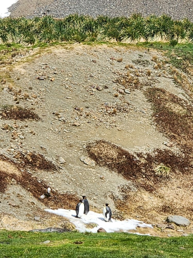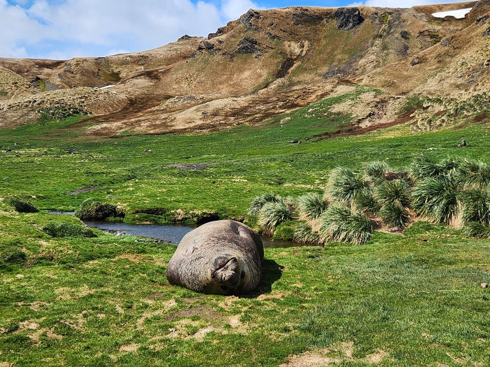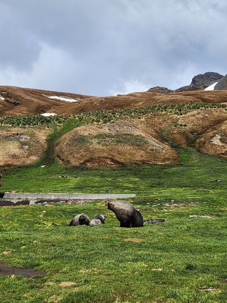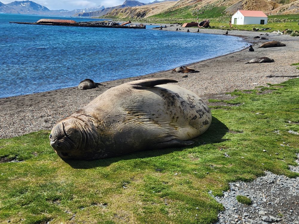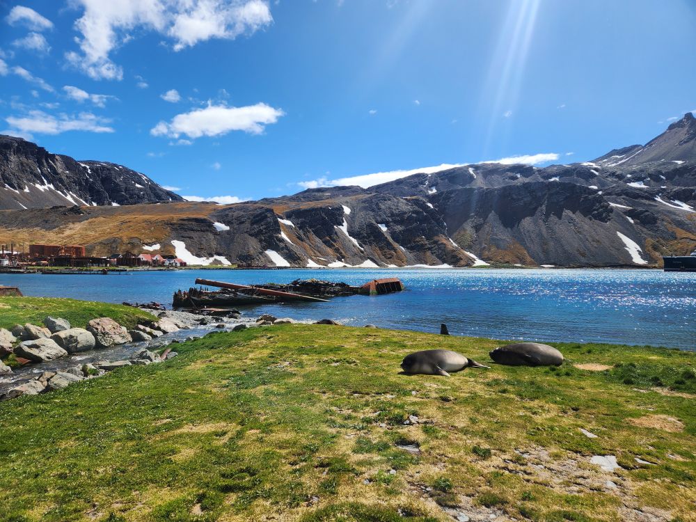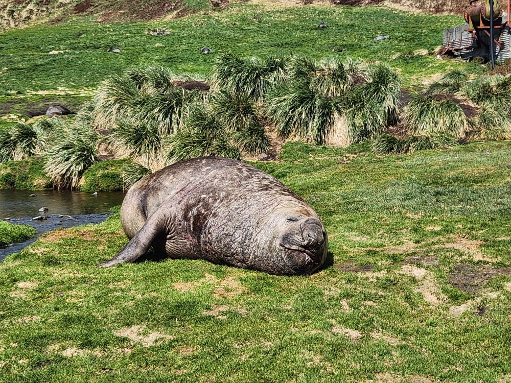 Back through the seal gauntlet we go, weaving our way around gigantic elephant seals and little – on a relative scale – fur seals. The fur seals are actually adorable and make the weirdest snorting and crying sounds. All of them are weirdly cute when they sleep – although we always remember that when they are awake, they can be decidedly not cute! As we walk back toward the abandoned whaling station, we even spot some penguins in the distance cooling off on a little wedge of snow nestled up against the slopes.