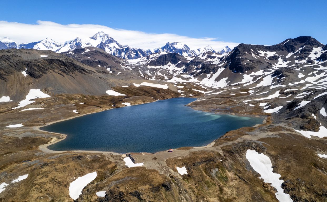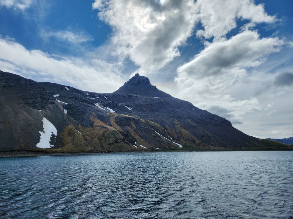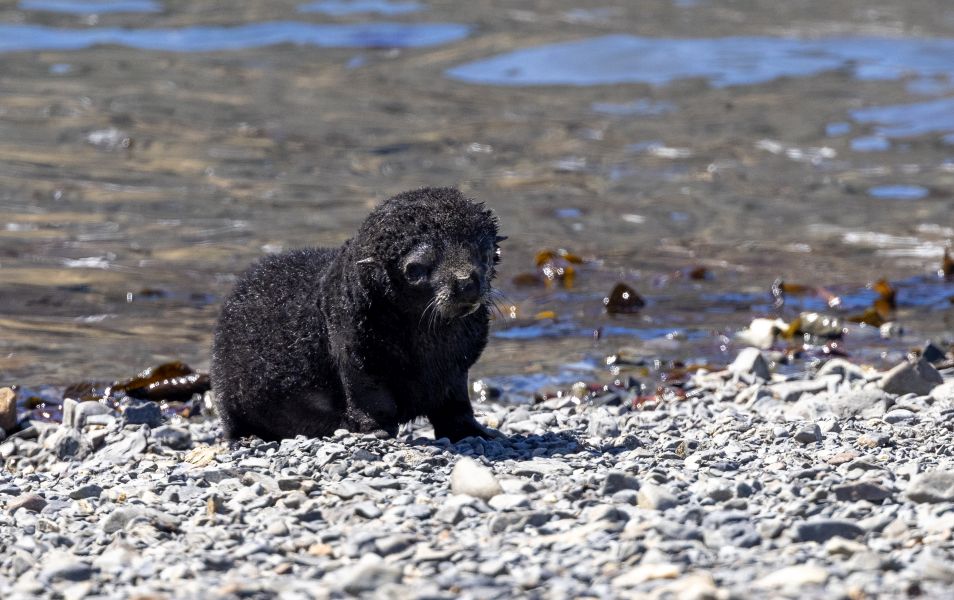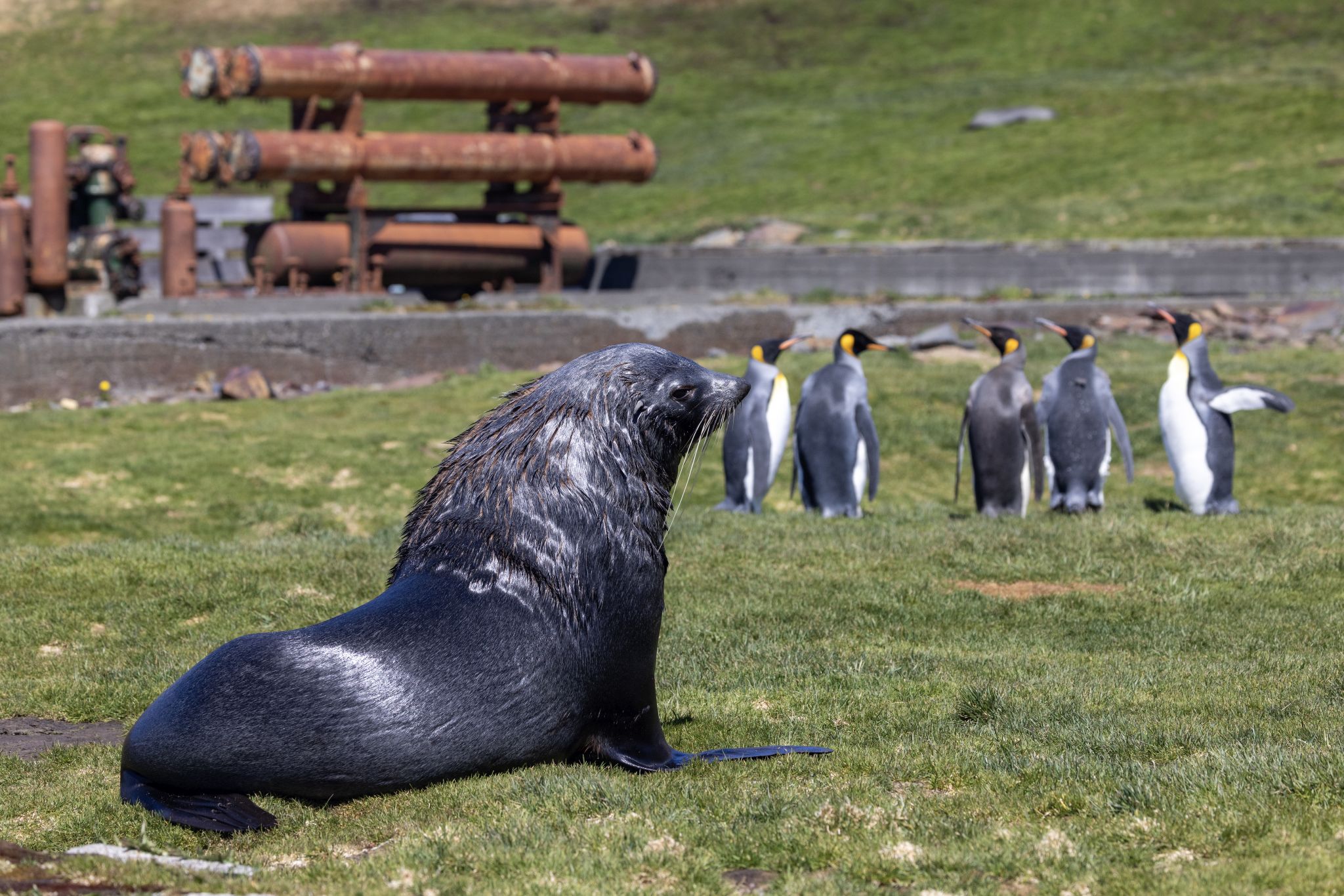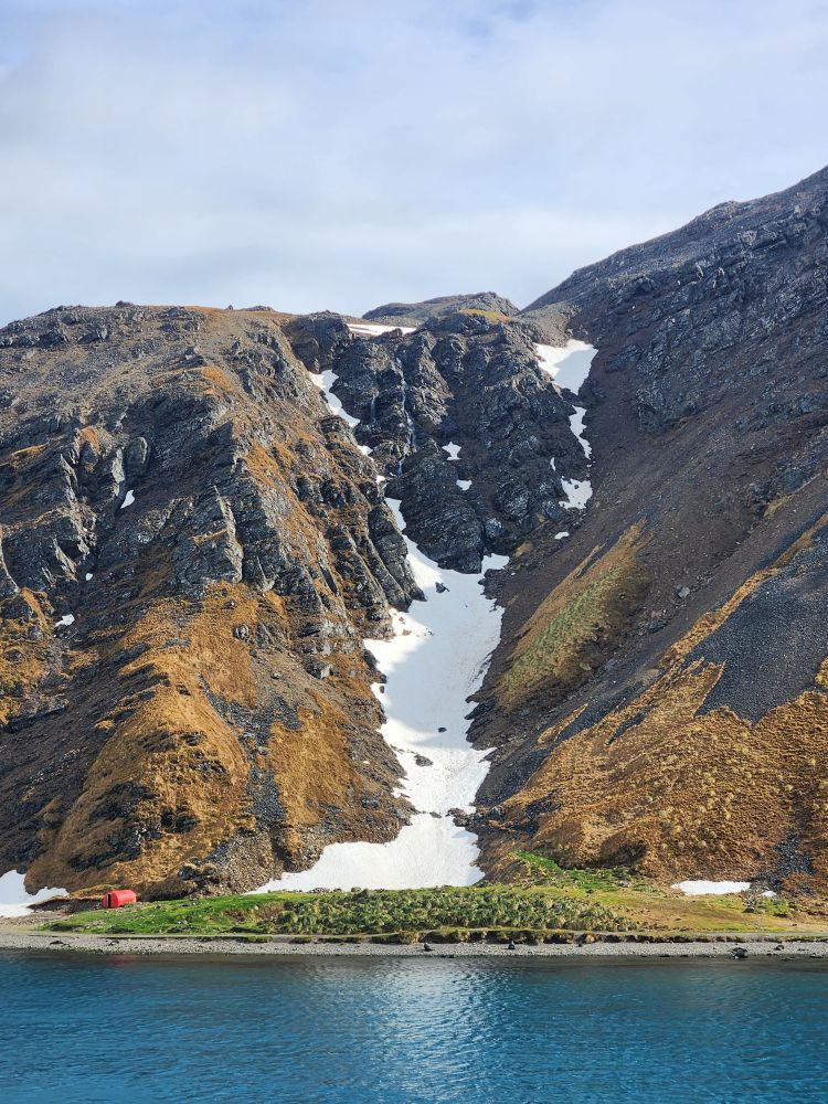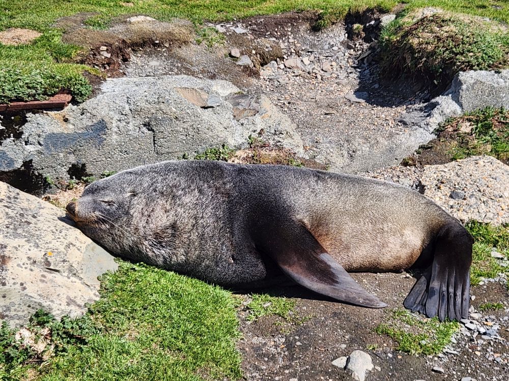 Back through the seal gauntlet we go, weaving our way around gigantic elephant seals and little – on a relative scale – fur seals. The fur seals are actually adorable and make the weirdest snorting and crying sounds. All of them are weirdly cute when they sleep – although we always remember that when they are awake, they can be decidedly not cute! As we walk back toward the abandoned whaling station, we even spot some penguins in the distance cooling off on a little wedge of snow nestled up against the slopes.